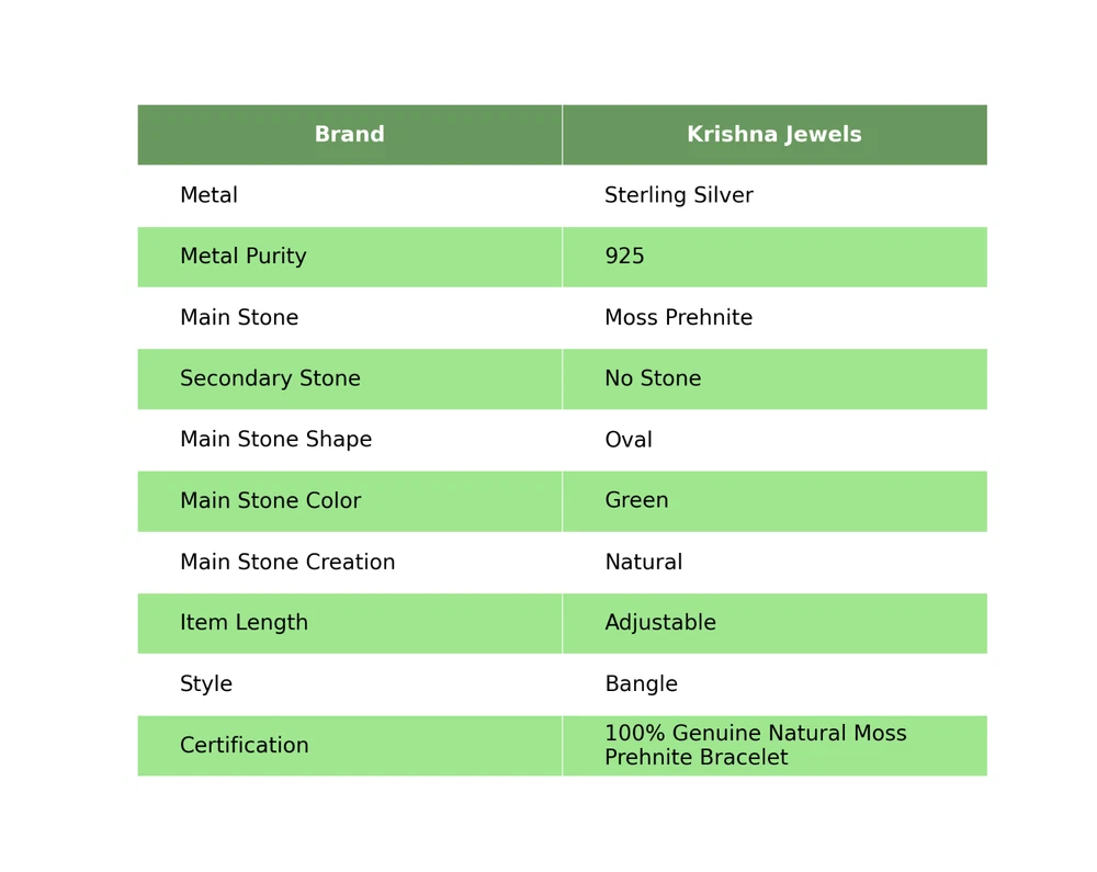 Note: Natural gemstones can vary slightly in design and color due to their unique formation. Welcome to KrishnaJewels123 Explore Our Handmade Sterling Silver Jewelry Collection Product Details: SKU: YC-102 Gemstone: Moss Prehnite Stone Shape: Oval Metal Purity: 925 Sterling Silver Length: Width: $ Sterling silver has long been cherished for its sophisticated charm and enduring quality. Valued for its elegance and versatility, sterling silver is a staple in jewelry design, offering a perfect balance of beauty and durability. Our sterling silver jewelry combines timeless appeal with modern craftsmanship. Known for its hypoallergenic qualities and resistance to tarnish, sterling silver enhances the natural brilliance of gemstones, creating a stunning, refined look. Ideal For: Mother’s Day Father’s Day Promises Valentine’s Day Halloween Celebrations Christmas Gifts New Year Festivities Gifts for Mom Gifts for Her Need more details or personalized advice? Don’t hesitate to reach out! We’re here to assist you promptly. Each piece at KrishnaJewels123 is handcrafted with care and passion. As experts in creating exquisite sterling silver jewelry, we take pride in our meticulous craftsmanship. Our collection features a diverse range of designs, each enhanced by genuine gemstones and created by our skilled artisans. Thank you for visiting KrishnaJewels123. We hope you find joy in exploring our collection and enjoy your shopping experience with us!