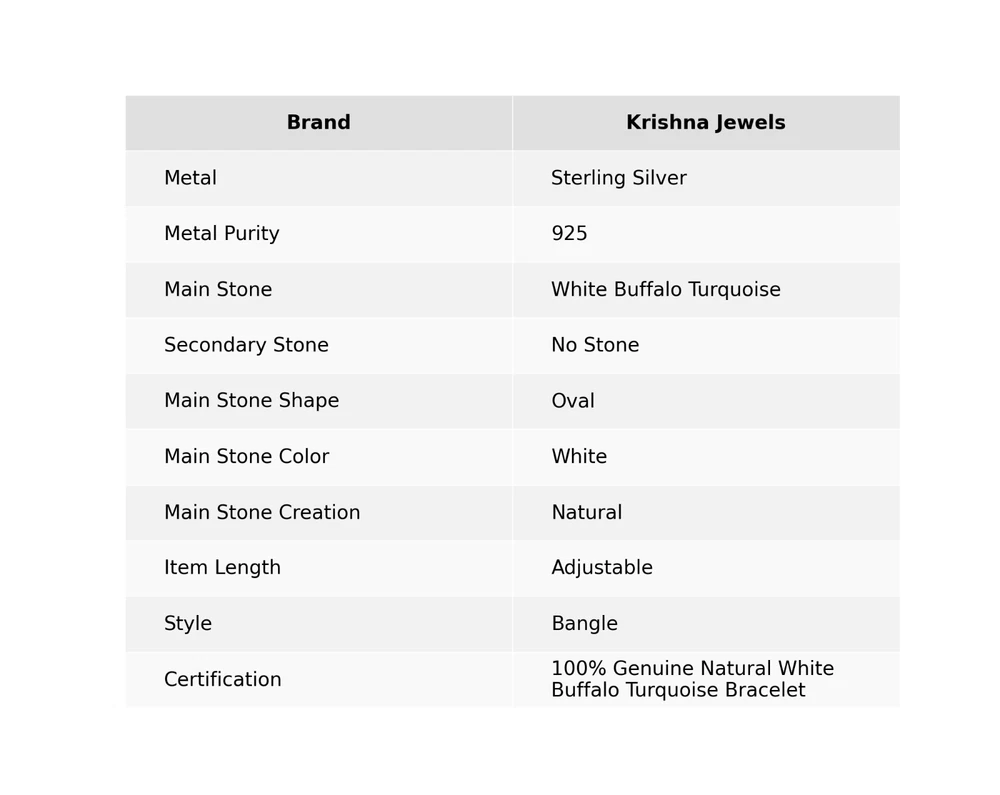 Note: Natural gemstones can vary slightly in design and color due to their unique formation. Welcome to KrishnaJewels123 Explore Our Handmade Sterling Silver Jewelry Collection Product Details: SKU: KKC-150 Gemstone: White Buffalo Turquoise Stone Shape: Oval Metal Purity: 925 Sterling Silver Length: Width: $ Sterling silver has long been cherished for its sophisticated charm and enduring quality. Valued for its elegance and versatility, sterling silver is a staple in jewelry design, offering a perfect balance of beauty and durability. Our sterling silver jewelry combines timeless appeal with modern craftsmanship. Known for its hypoallergenic qualities and resistance to tarnish, sterling silver enhances the natural brilliance of gemstones, creating a stunning, refined look. Ideal For: Mother’s Day Father’s Day Promises Valentine’s Day Halloween Celebrations Christmas Gifts New Year Festivities Gifts for Mom Gifts for Her Need more details or personalized advice? Don’t hesitate to reach out! We’re here to assist you promptly. Each piece at KrishnaJewels123 is handcrafted with care and passion. As experts in creating exquisite sterling silver jewelry, we take pride in our meticulous craftsmanship. Our collection features a diverse range of designs, each enhanced by genuine gemstones and created by our skilled artisans. Thank you for visiting KrishnaJewels123. We hope you find joy in exploring our collection and enjoy your shopping experience with us!