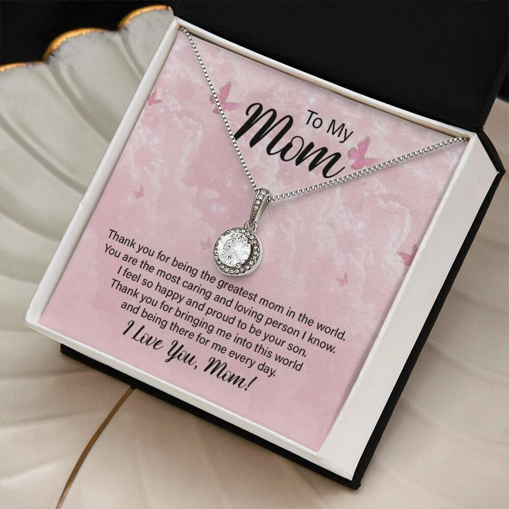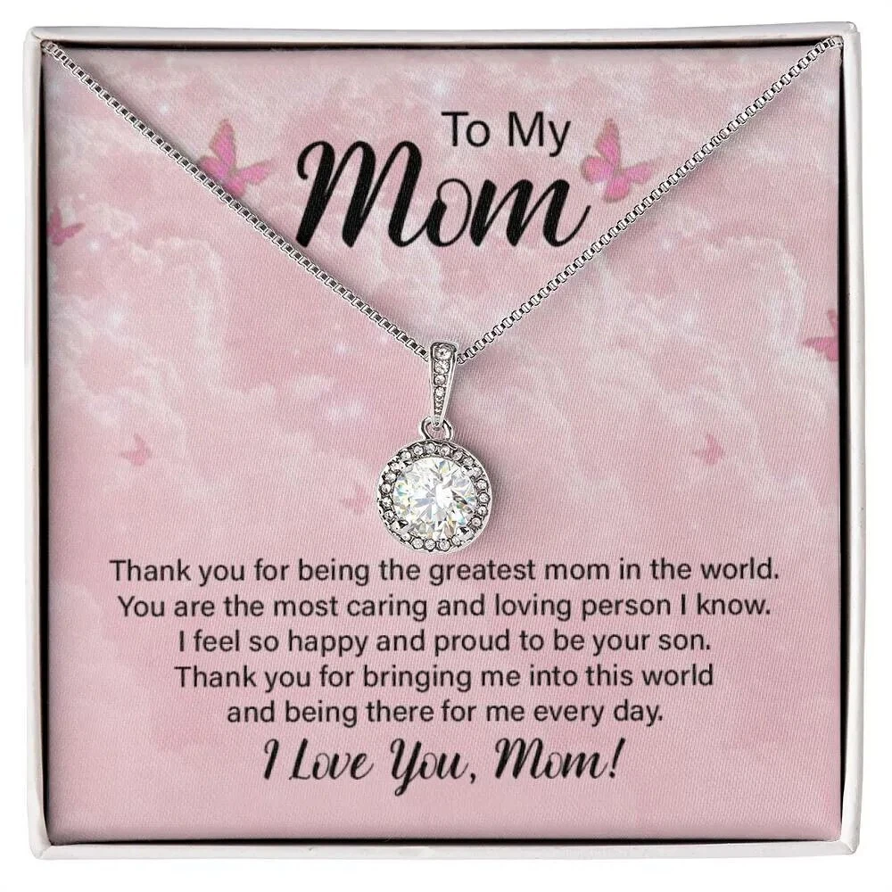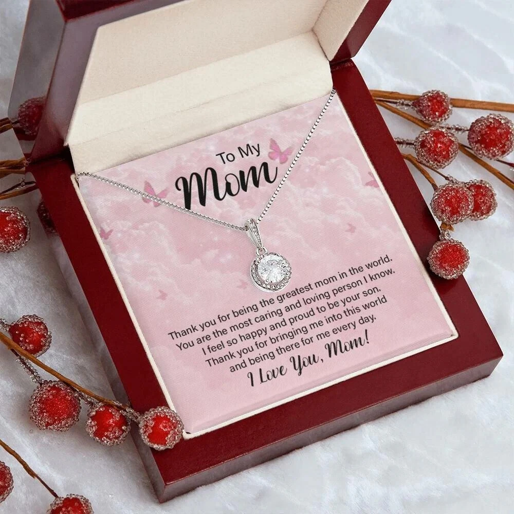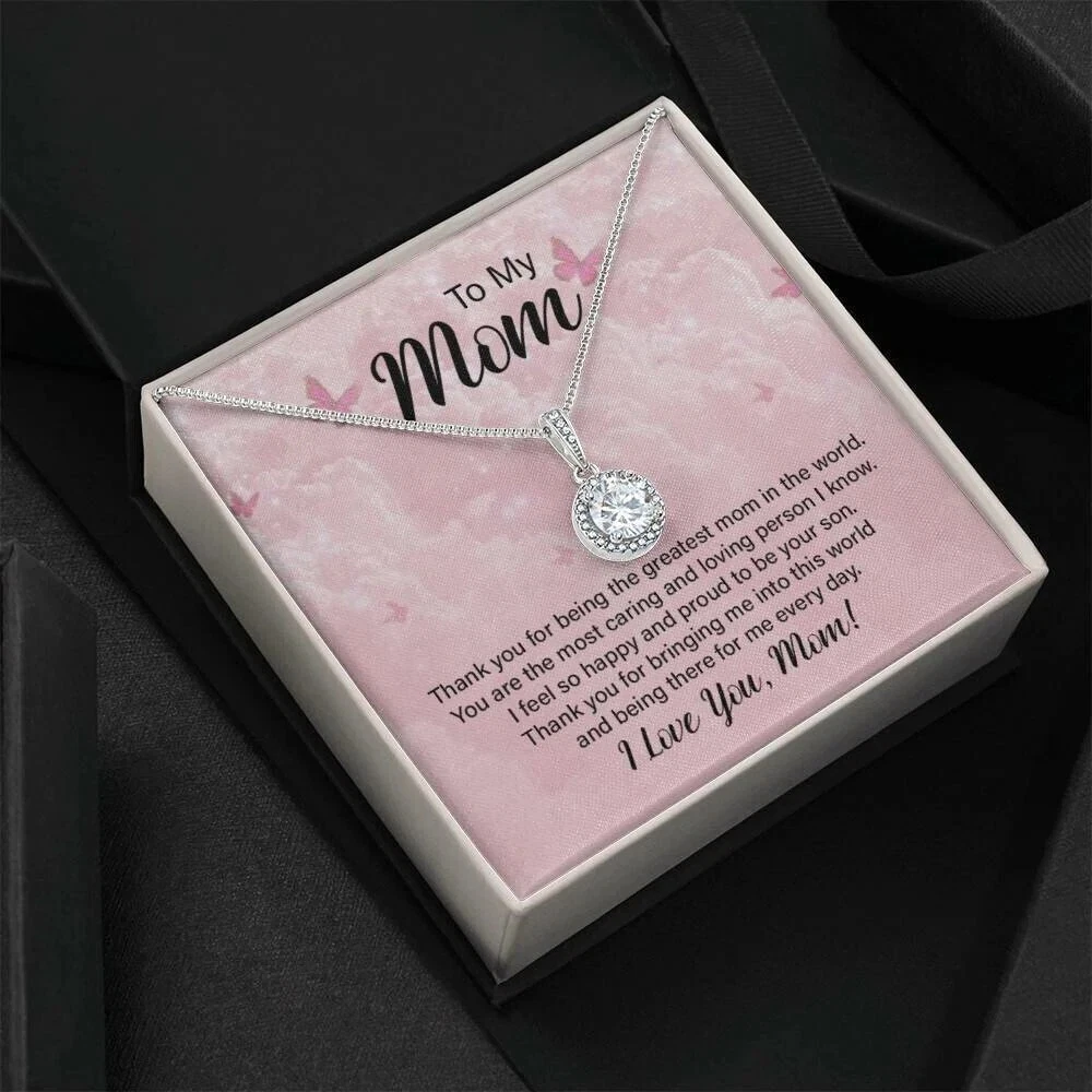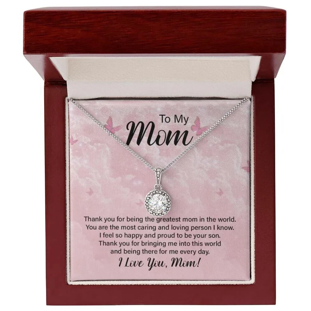 To my mom, Mothers day Gifts, Personalised Message Card Jewellery, Gifts for Mothers Surprise your loved one with a timeless and elegant gift. Our dazzling Eternal Hope Necklace features a cushion cut center cubic zirconia that will sparkle with every step. The center crystal is adorned with equally brilliant CZ crystals, ensuring a stunning look every wear. Wow her by gifting her an accessory that will pair with everything in her wardrobe! 14k white gold finish over stainless steel 8mm cushion-cut center cubic zirconia crystal 1.2mm accent CZ crystals Pendant dimensions: 0.6" (14mm) height / 0.5" (11.6mm) width Adjustable box chain length: 16" - 18" (40.64- 45.72cm) Lobster clasp Your piece is lovingly packaged in a complimentary soft touch box for easy gifting. Elevate your presentation by upgrading to the mahogany style luxury box, which features a brilliant LED spotlight.