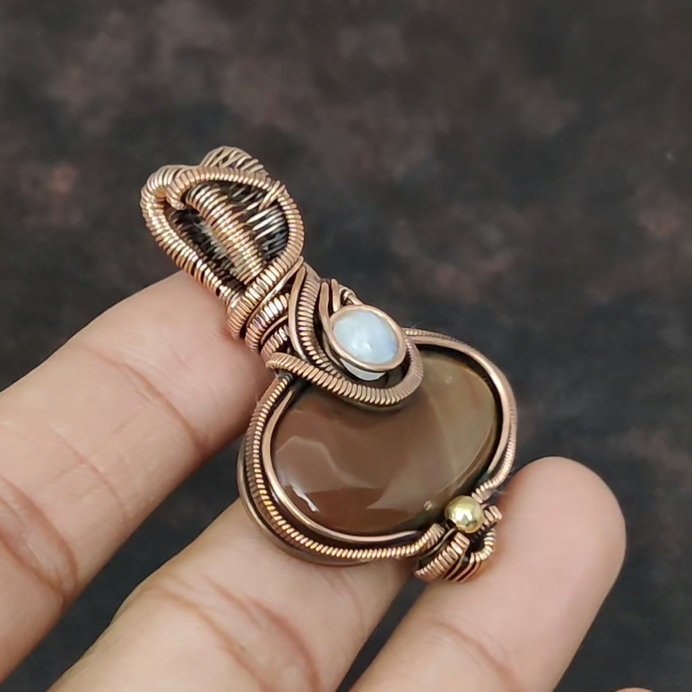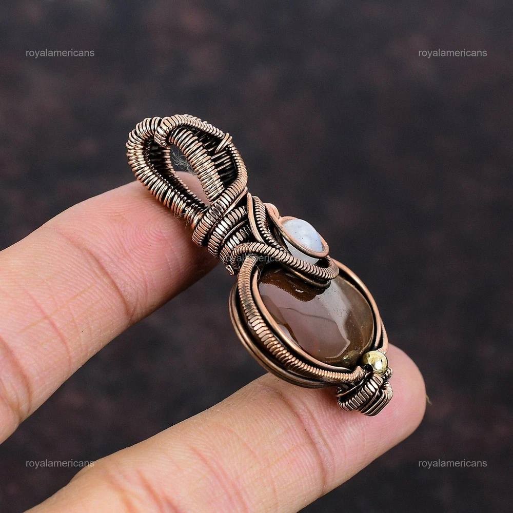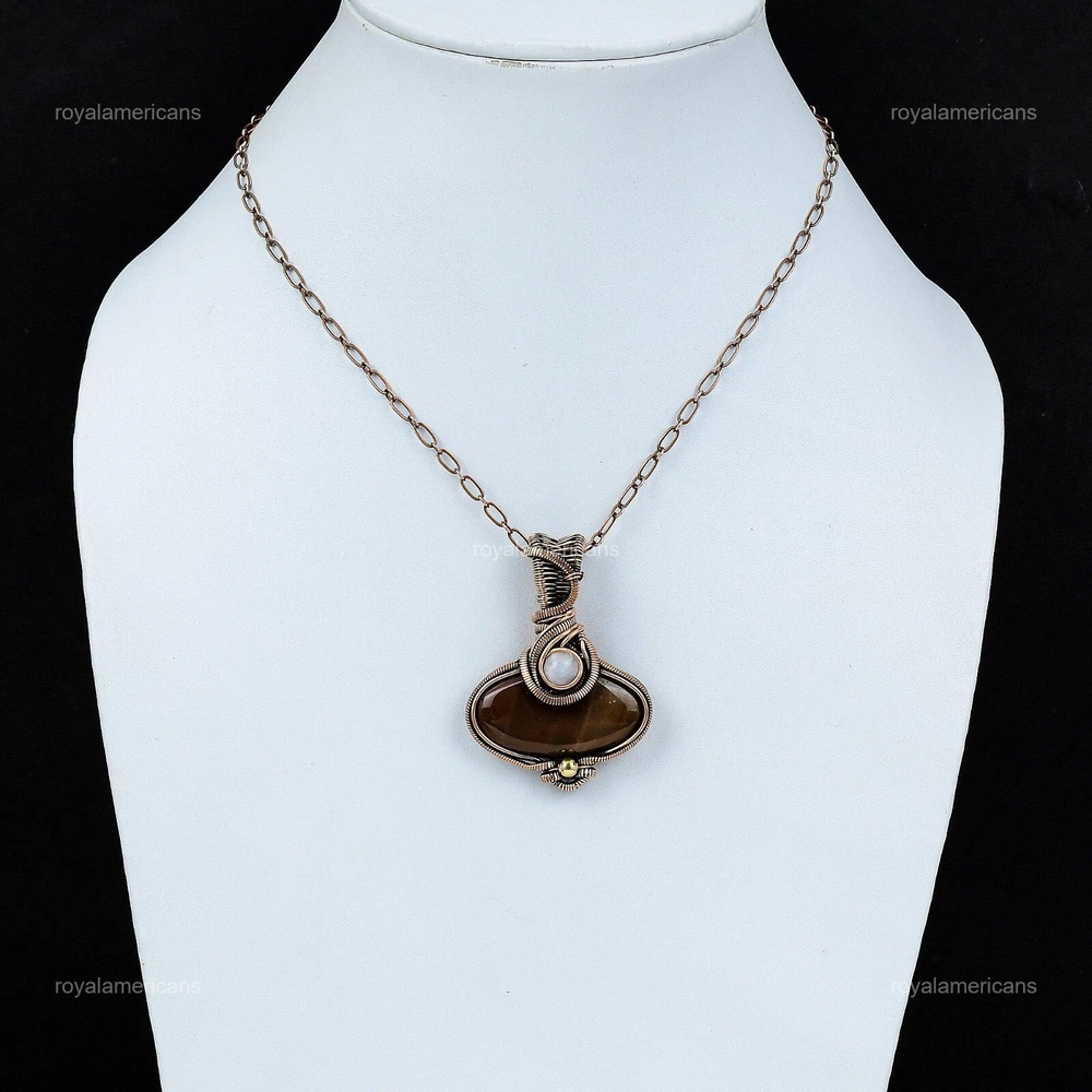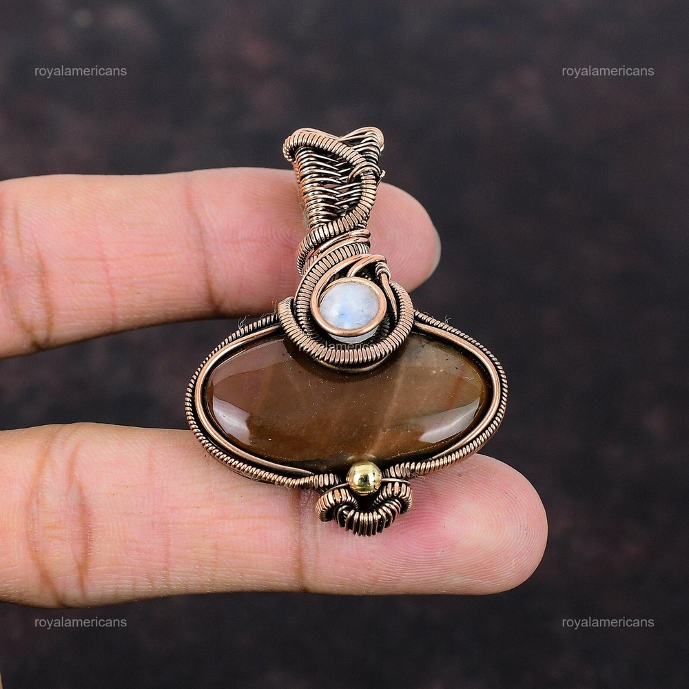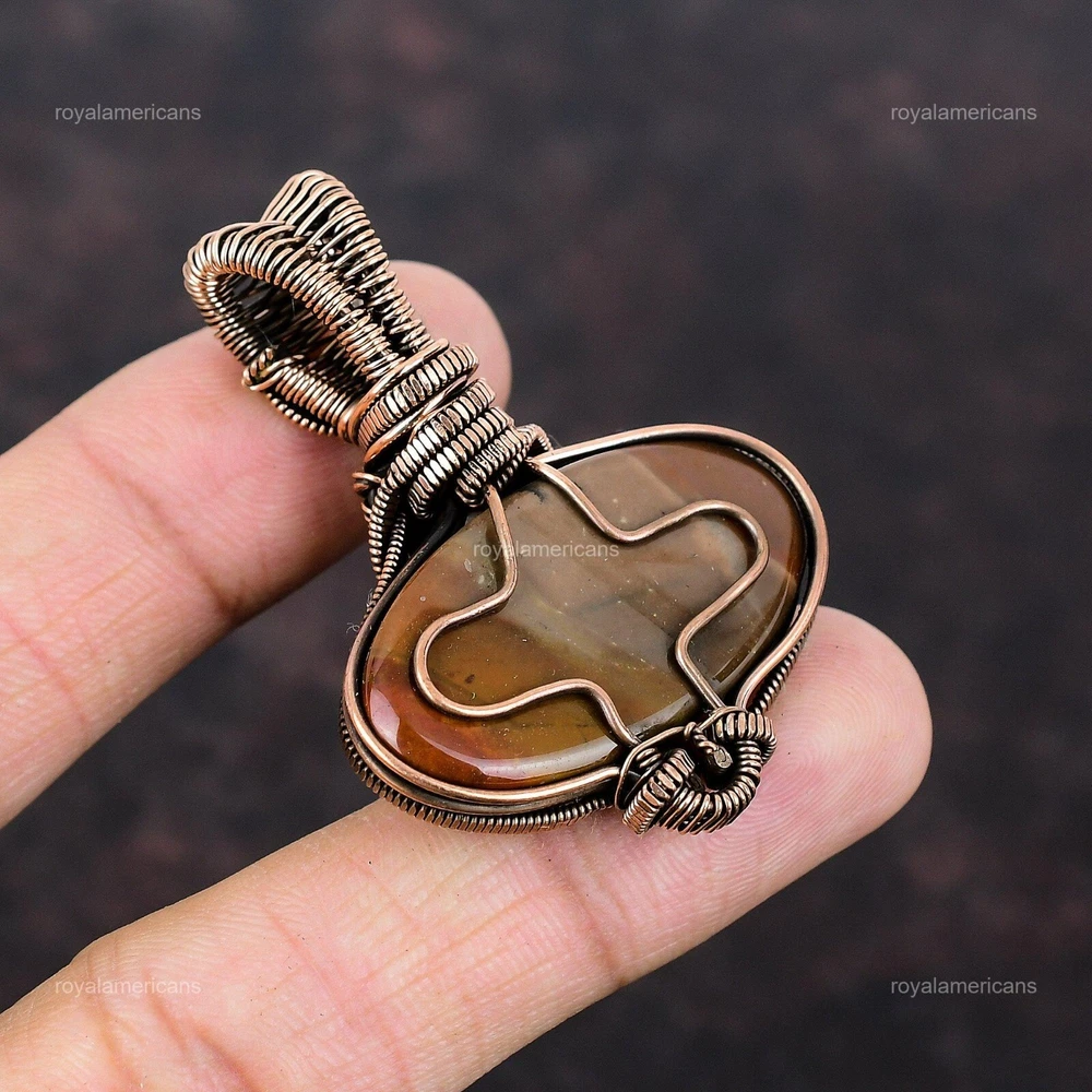 Note : Due to the natural formation of this gemstone. Slight variation in design and color are to be expected. Welcome to Royalamericans Mothers day Sale Red Jasper Gemstone Rainbow Moonstone Wire Wrap Pendant Copper Handmade Pendant, Wire Wrapped Pendant, Wire Wrapped Jewelry, Copper Pendant, Copper Wire Pendant, Wrapped Jewelry, Wire Wrap Pendant, Wire Wrap Jewelry SKU : UFWP-2534 Gemstone : Red Jasper Stone Shape : Oval Metal Purity : Unknown Copper Length : 53 Millimeters Width : 39 Millimeters Copper has been used for jewelry making for thousands of years, dating back to ancient civilizations such as the Egyptians, Romans, and Aztecs. Copper was valued for its beauty, versatility, and durability, and was often used to make everything from jewelry and coins to cookware and tools. In addition to its historical significance, copper jewelry also offers several benefits. Copper is a natural conductor of heat and electricity, which makes it ideal for energy healing and therapeutic purposes. Wearing copper jewelry is believed to have various health benefits, such as improving circulation, reducing inflammation, and boosting the immune system. Some people also believe that copper jewelry has the ability to balance energy and improve mood. For Mother's Day Gift For Father's Day Gift For Promise For Valentine's Day For Halloween Party For Christmas Day Gift For New Year Party For Mom For Her If you can't find the information you need or need some advice for your design? Feel free to contact us. We are fast to reply :) All our work is made by hand with Love and Care in our workshop Thank you so much for visiting and hope you enjoy shopping with us Royalamericans is committed to delivering the best quality sterling silver jewelry to customers. As a handmade jewelry manufacturer, we offer an extensive selection of copper gemstone jewelry that showcases the brilliance of our craftsmanship. We are an experienced handmade jewelry supplier with expertise in embellishing gemstones to suit every style. We offer you the liberty to create your jewelry ensemble with sparkling, earthy, and pure gemstones. Our Talented artisans masterfully handcraft each piece of jewelry you see here. Our pieces are made with genuine gemstones.
