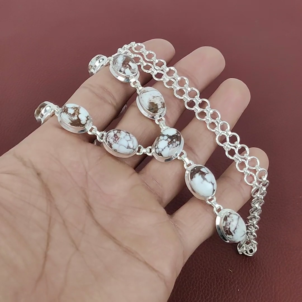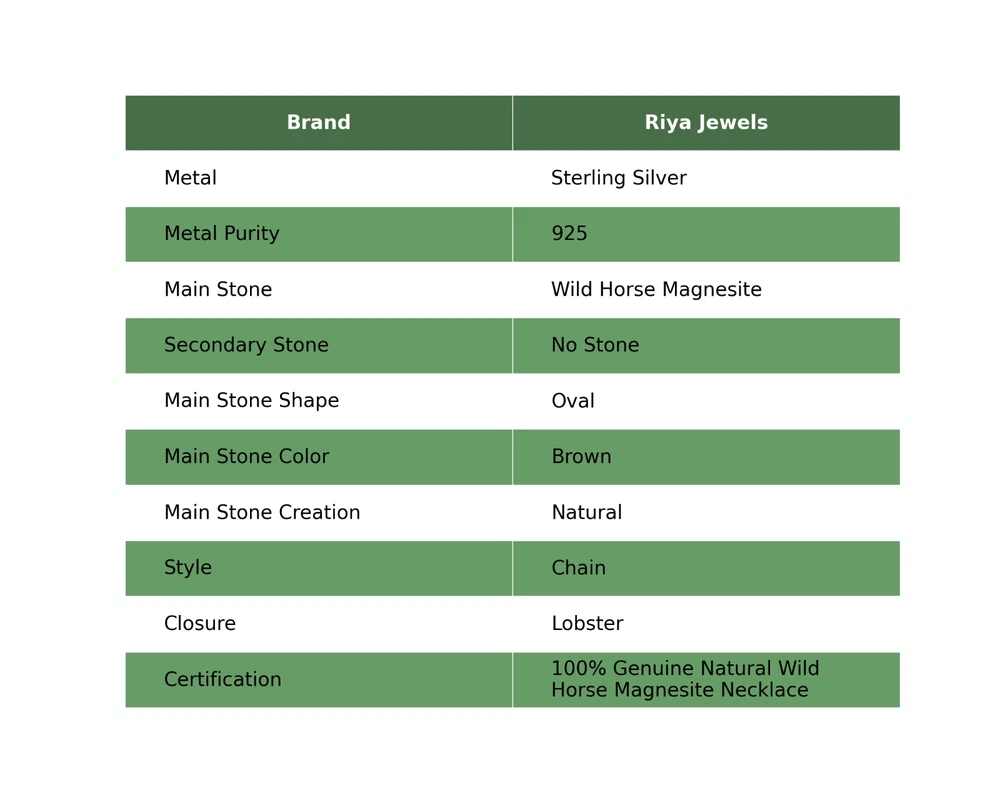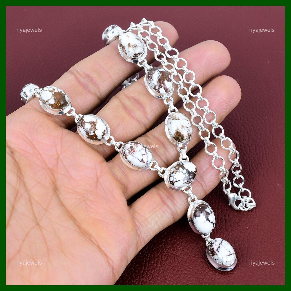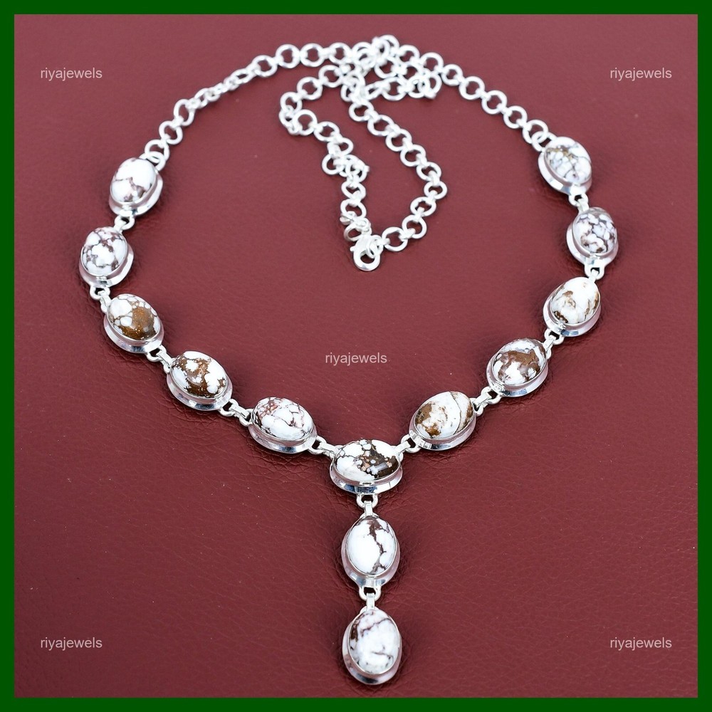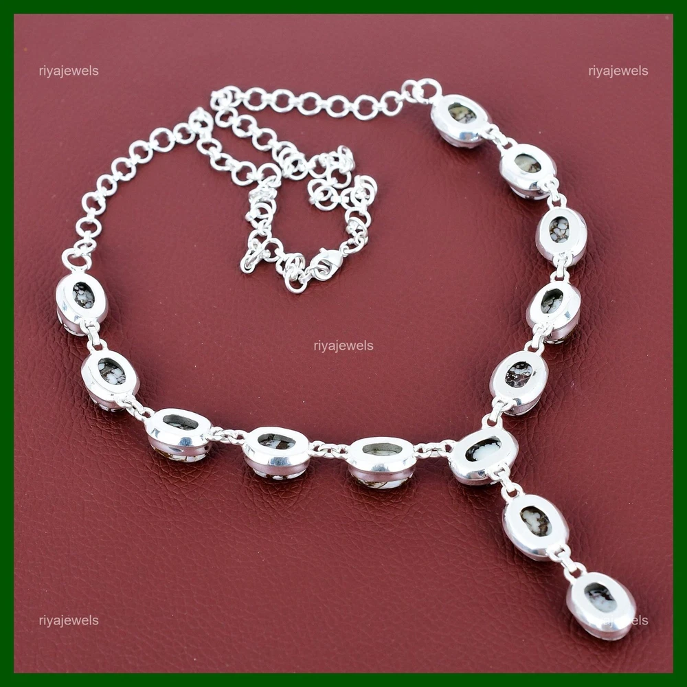 Note : Due to the natural formation of this gemstone. Slight variation in design and color are to be expected. Welcome to Riyajewels Mothers day Sale Wild Horse Magnesite Gemstone Chain Necklace Sterling Silver Handmade Necklace, Sterling Silver Necklace, Wild Horse Magnesite Necklace, Handcrafted Necklace SKU : PN-1455 Gemstone : Wild Horse Magnesite Stone Shape : Oval Metal Purity : 925 Sterling Silver Necklace Length : 20 Inches Adjustable : Yes Silver Jewelry is a popular choice for many people due to its unique properties and numerous benefits. Here are some of the key properties and benefits of wearing silver jewelry: Properties: Durability: Silver is a durable metal that can withstand regular wear and tear. Malleability: Silver is highly malleable, which means it can be easily shaped and molded into various designs. Conductivity: Silver is an excellent conductor of heat and electricity. Anti-bacterial: Silver has natural anti-bacterial properties, which can help prevent the growth of harmful bacteria. Benefits: Aesthetic appeal: Silver jewelry is known for its beauty and versatility, and can be worn with a variety of outfits and styles. Hypoallergenic: Silver is generally hypoallergenic, which means it is unlikely to cause an allergic reaction in most people. Healing properties: Some people believe that wearing silver jewelry can help with various physical and emotional conditions, such as arthritis, anxiety, and depression. Spiritual significance: Silver has been used in various cultures for its spiritual and symbolic significance, and wearing silver jewelry can help to connect with these traditions. Investment value: Silver is a precious metal that retains its value over time, and investing in silver jewelry can be a smart financial decision. Overall, silver jewelry offers a unique combination of beauty, durability, and benefits, making it a popular choice for people around the world. For Mother's Day Gift For Father's Day Gift For Promise For Valentine' Day For Halloween Party For Christmas Day Gift For New Year Party For Mom For Her If you can't find the information you need or need some advice for your design? Feel free to contact us. We are fast to reply :) All our work is made by hand with Love and Care in our workshop Thank you so much for visiting and hope you enjoy shopping with us Riyajewels is dedicated to providing customers with high-quality sterling silver jewelry. As a manufacturer of handmade jewelry, we offer an extensive range of silver gemstone jewelry that demonstrates our exceptional craftsmanship. We are skilled in adorning gemstones to complement any style, and we give you the freedom to design your own jewelry collection with dazzling, natural, and genuine gemstones. Our talented craftsmen carefully handcraft each jewelry piece, ensuring that it is unique and made with authentic gemstones.