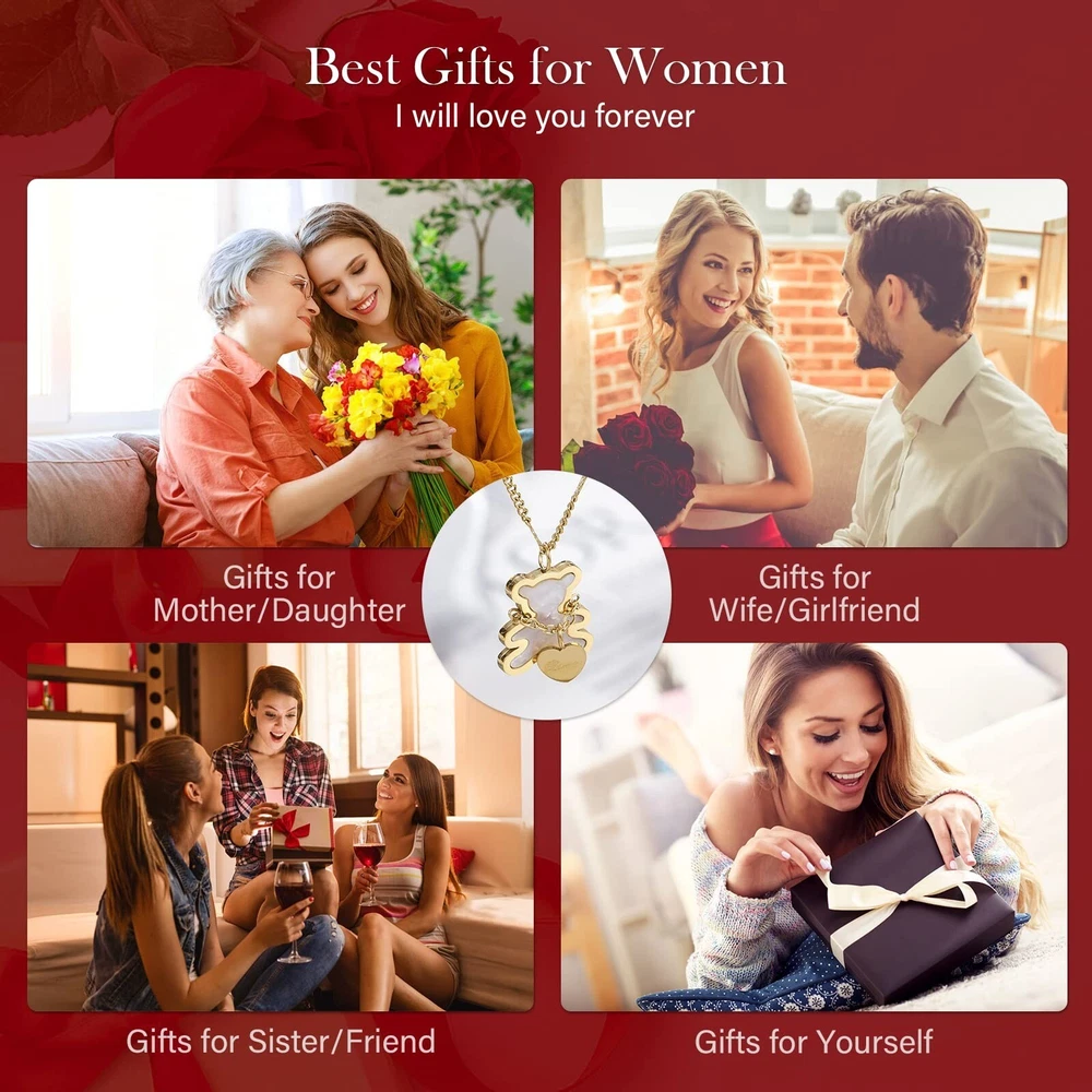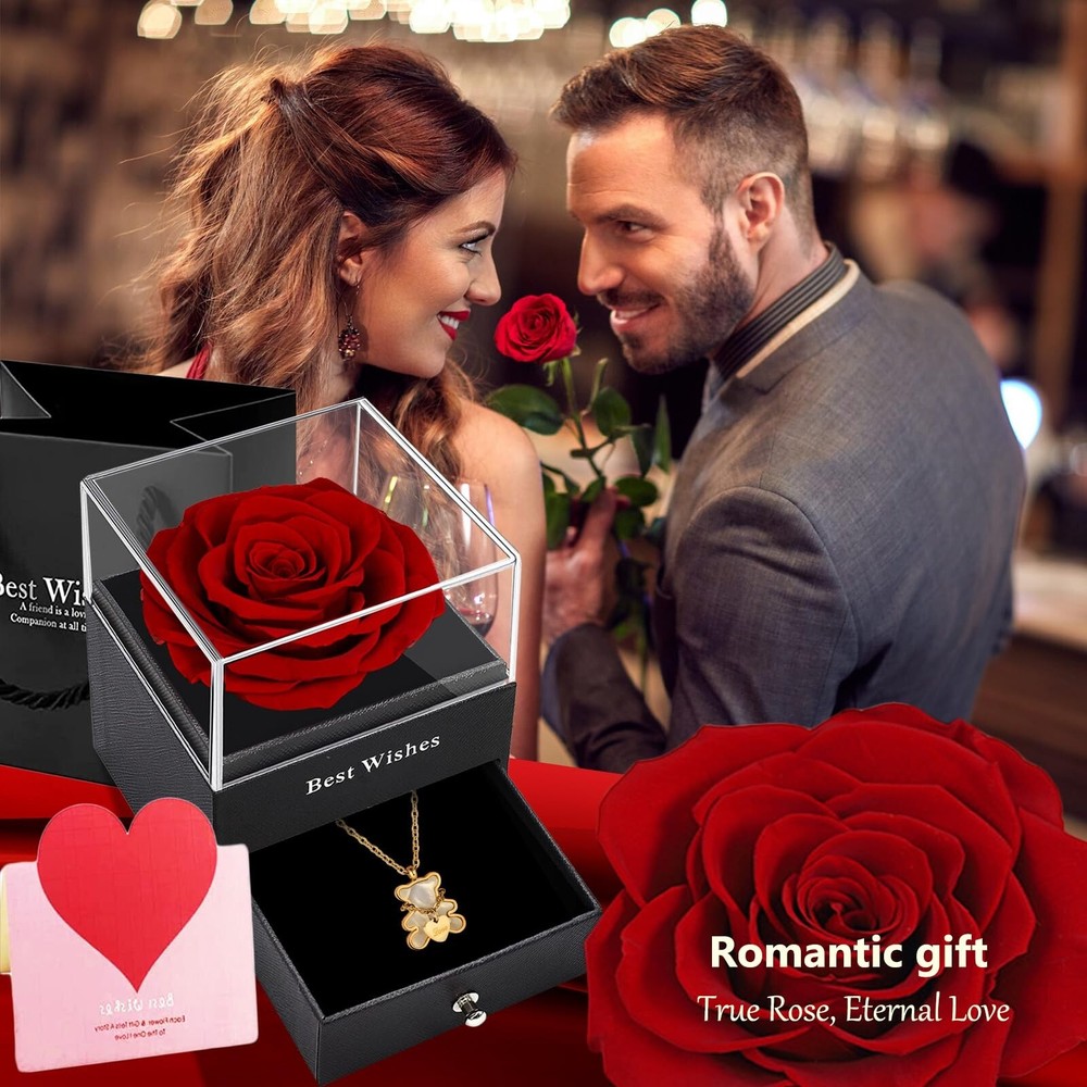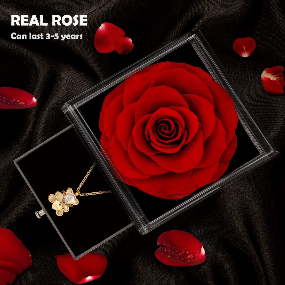Mothers day gifts for Mum,Red Rose Box with Teddy Bear Necklace,Eternal Rose with 18K Real Gold Plated Pendant for Women,Preserved Real Forever Rose with Titanium Steel Necklace,Enchanted Flower Box. Product Details Package Dimensions : 4.8 x 4.72 x 4.53 inches; 8 ounces Department : womens Date First Available : March 24, 2023 Manufacturer : WILLSHINE Brand, Seller, or Collection Name: WILLSHINE Metal stamp: 18K Metal: Stainless Steel, Titanium Material: 316L Teddy Necklace Chain: Cable Clasp: Lobster Clasp