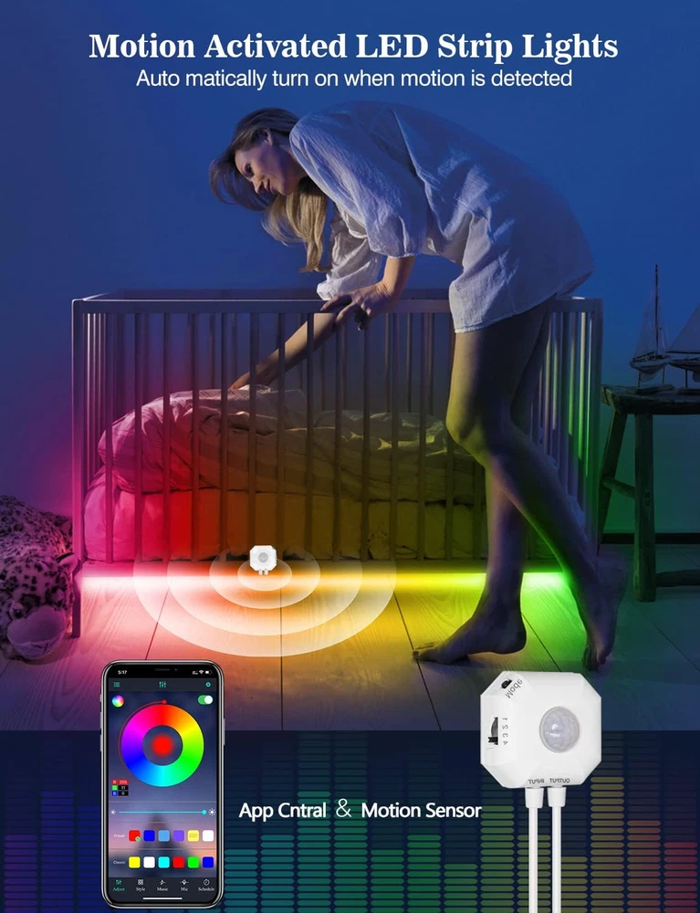 Motion Activated LED Strip Lights, 9.8ft RGB Motion Sensor Under Bed Lights 【Super Brightly LED Lights】9.8ft motion sensor LED light strip, 16.4 ft motion sensor range, Warm and soft motion activated bed light will turn on safely guides you through the room in the dark, allowing your eyes to be more relaxed, softening tones and reducing imperfections, no glare, stable lighting, energy efficient LED lighting that doesn't disturb others, saving you money and the environment. 【Smart Bluetooth APP Control LED Lights】Use your phone to control the wonderful LED lights! Download the free APP "duoCo Strip" in the Apple Store or Google play, then connect the strip lights to power and turn on Bluetooth. The LED lights will automatically connect and display in the device list on the far left of the APP. After successful connection ,Free up your hands to turn on and off the bed light,you can start DIY your unique mood lighting! 【Motion Activated LED Strip Lights】Motion Sensor LED Strip Lights with built-in human passive motion sensor light with auto-off timer, this sensor-based lighting will detects your motion, and it will automatically turn on when human motion is detected within 16.4 feet and turn off after 38/75/150/300 seconds of undetected motion.You can push the 1/2/3/4 mode button on the motion sensor to choose time interval of 38/75/150/300 seconds. 【Widely Used】 Shelf Lights will be a wonderful home decoration for you. for bedroom, living room, home bar, gaming room, bookcase, mirrors, stair. It is also very good to use the led light strips as a Christmas, Halloween, holiday, birthday, home party and wedding atmosphere decoration. Or as a novelty gift for your family, friends, loved ones! 4.4 inches x 4.5 inches x 1.6 inches. Weight: 5.3 oz Light Source Type Motion Sensor LED Strip Lights Style Magic color mode,RGB mode,Color Changing, Motion Sensor Number of Items 1 Power Source Corded Electric Item Dimensions 4.5 x 4.4 x 1.6 inches Number of Light Sources 54 Control Method App, Voice Theme Halloween, Indoor Controller Type App Control Connectivity Protocol Bluetooth Wireless Communication Technology Bluetooth Product Dimensions 4.5 x 4.4 x 1.6 inches; 5.29 ounces Occasion Type Wedding, Christmas, Birthday, Halloween Seasons Christmas, Halloween Additional Features Under Cabinet Lights christmas decorations, Motion Sensor LED Strip Lights Under Bed Lights Indoor/Outdoor Usage Indoor Material Type Polycarbonate Light Color RGB Water Resistance Level Not Water Resistant Connectivity Technology Bluetooth Occasion Wedding, Christmas, Birthday, Halloween Special Feature Under Cabinet Lights christmas decorations, Motion Sensor LED Strip Lights Under Bed Lights Color Multicolor Wattage 5 watts Indoor Outdoor Usage Indoor Voltage 5 Volts Included Components Controller box, Adapter Style Name Magic color mode,RGB mode,Color Changing, Motion Sensor Size 9.8ft