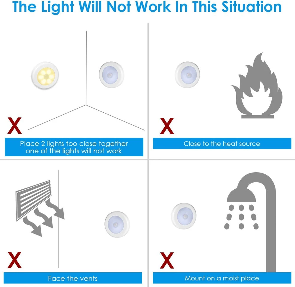 Motion Sensor Light, Cordless Battery-Powered LED Night Light, Stick-Anywhere Design Upgrade - The AMIR Upgraded Motion Sensor Light features a 15% larger design and a remarkable 30% increase in brightness. This ensures you never stumble in the dark, providing clear and bright illumination wherever needed. PIR Motion & Light Sensor - Auto-on within 10 feet, auto-off after 15 seconds of no motion detected helps prolong battery life. It will turn on only when it is dark and when motion is detected Easy Installation - Simple to install, no hard-wiring. With double-sided adhesive pads and built-in magnet, you can stick on anywhere you like Battery Operated - Powered by 3PCS AAA batteries (not included) for coreless installation. To provide you with illumination in areas that have limited or no access to electricity Note: This light can only be turned on in darkness environment. It won't turn on if the light sensor has been detected by the enough light. And Please DO NOT install this light in high temperature place, otherwise, high temperatures will affect the adhesive strip, and then the light will slide easily!! Product Description Battery Operated - Need 3 AAA Batteries. - Tip: Twist to remove the cover. Range of Detecting - Detecting distance :10ft - Detecting angle:120 degrees Enough Light - Provide enough light to make sure you never stumble in the dark. Automatic Sensor - Only turn on in the dark and when motion is detected. - Auto-on within 10 feet, auto-off after about 15 seconds of no motion detected. Specifications: Voltage&Wattage 1.5v, 0.3w Operating temp -20°C-40°C LED Qty 6 LED Light colo Warm White LED life 50,000 hours or more Color temperature 2900K-3300K Note: 1. Please kindly check whether the batteries have been installed in the correct direction. 2. This light can only be turned on in darkness environment. The light won't turn on if the light sensor has been detected by the enough light. 3. If you use Alkaline battery first and then change to zinc-manganese dry battery, the lights might not work as the zinc-manganese dry battery is shorter than the Alkaline battery. 4. The sensor light might not work if you use the infrared heater in winter. The infrared will cause failure of the sensor. However, the light will get back to work in 30 minutes after turning off the heater. 5. Please clean the wall surface to keep it dry and clean, so that the double-sided adhesive pads can be pasted tightly. 4.0 "h x 3.5 "h x 3.5 "h. Weight: 0.14 kg Light Source Type LED Item model number US-UF5Y_3PCS Style Modern Number of Items 3 Power Source Battery Powered Number of Light Sources 6 Control Method Remote Switch Type Push Button Lighting Method Up/Down Light Lamp Type Motion Sensor Light Number of Pieces 3 Room Type Entryway, Bathroom, Kitchen, Bedroom Assembly required Yes Bulb Shape Size S8 Installation Type Countertop,Tabletop Batteries required Yes Product Dimensions 3.5"D x 4"W x 3.5"H Material Plastic Efficiency Highly Efficient Controller Type Remote Control Finish Type Painted Specific Uses For Product Home Included Components Motion Sensor Light Indoor/Outdoor Usage Indoor Brightness 45 Lumen Water Resistance Level Not Water Resistant Item Weight 0.14 Kilograms Connectivity Technology IR Special Feature Motion-Sensor Shade Height 3.5 Inches Bulb Base E26 Medium Shade Color White Mounting Type Ceiling Mount Color Warm White Is Discontinued By Manufacturer No Is Cordless? Yes Base Material Metal Is Waterproof false Shape Round Voltage 0.5 Volts Recommended Uses For Product Decoration Shade Material Metal Finish types Painted Size 3-Pack
