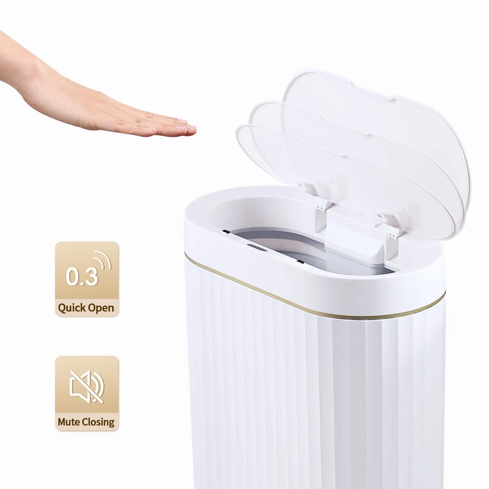 NOTICE FOR CUSTOMERS - This product is a motion sensor trash can. Customers need to install 2 AA batteries as well as follow the steps to put on the garbage bag to ensure the bin works properly. Then you need to press the button on the lid for more than three seconds to start it. The same operation is needed to run the trash can after replacing the battery WATER-RESISTANT - Advanced IPX5 waterproof technology prevents water or humid environment from damaging the unit. Leaving none water stain on surface after rinse SLIM DESIGN - 12''L×6''W×12.5''H, 2.5 Gallons, ABS materials. Ideal for bathroom and kitchen use SMART SENSOR - Our fully-developed sensing technology reduces unnecessary openings and extends battery life. The lid stays open if your hands stay around the infrared motion sensor, which provides a comfortable user experience. Lid closes after 5 seconds automatically if none movement is detected by sensor. In cases that You want the lid to stay open, just gently touching the weight sensing button on the right, touch the button again to close. Product powered by 2 AA batteries ANTI-SLIP DESIGN - Equipped with novel wave stripes that bring visual aesthetics and provide slip resistance SPACE-SAVING - This trash can is perfectly designed for limited space. With its modern oval-shaped design, the product looks great in bathroom, kitchen and other rooms while take up less space CUSTOM FIT GARBAGE BAGS - Our code A trash bags are designed to fit perfectly in this trash can so they don't slip and are completely hidden. The extra thick plastic and double stitched construction prevents tears and breakage