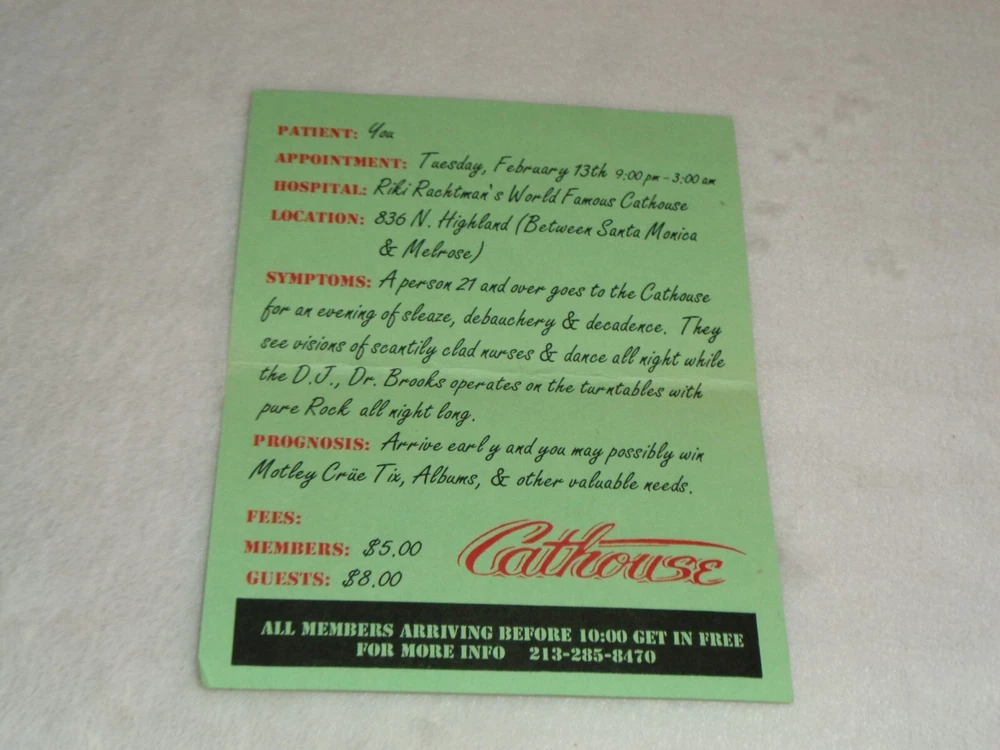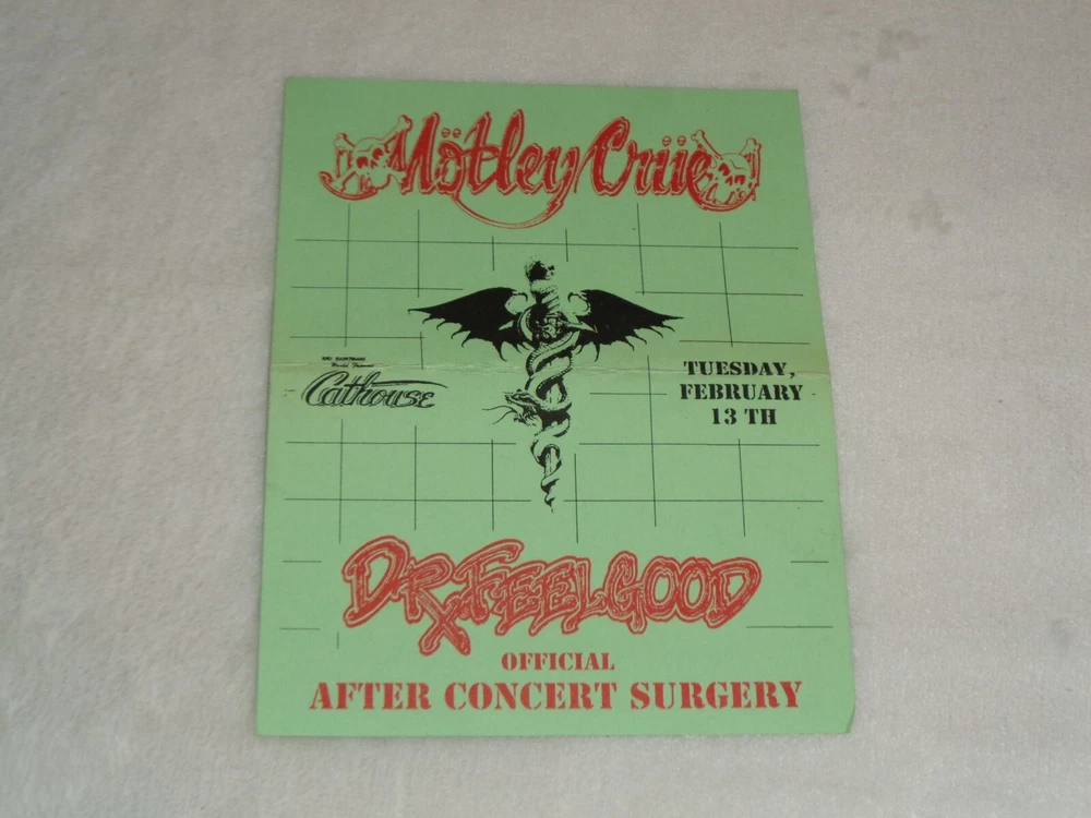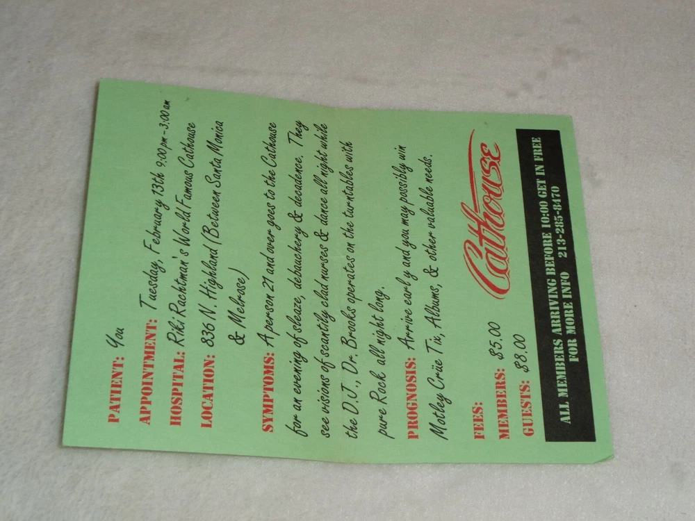 Motley Crue 1990 Riki Rachtman's Cathouse Dr. Feelgood 2/13/90 Rare Event Original Flyer Measures approximately 4 1/4" x 5 1/2". Item has been folded. There is discoloration, creasing and marks from handling and storage. Please see photos for more information on condition and ask any questions you may have.