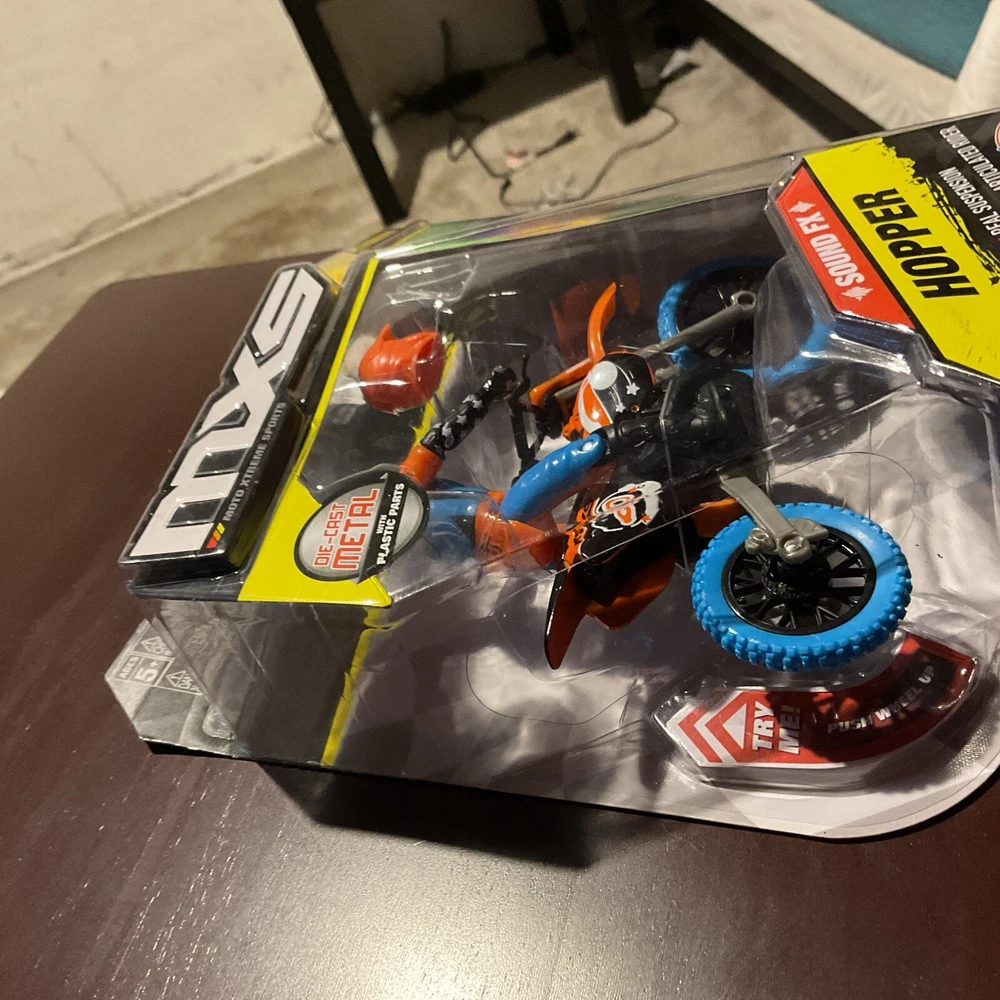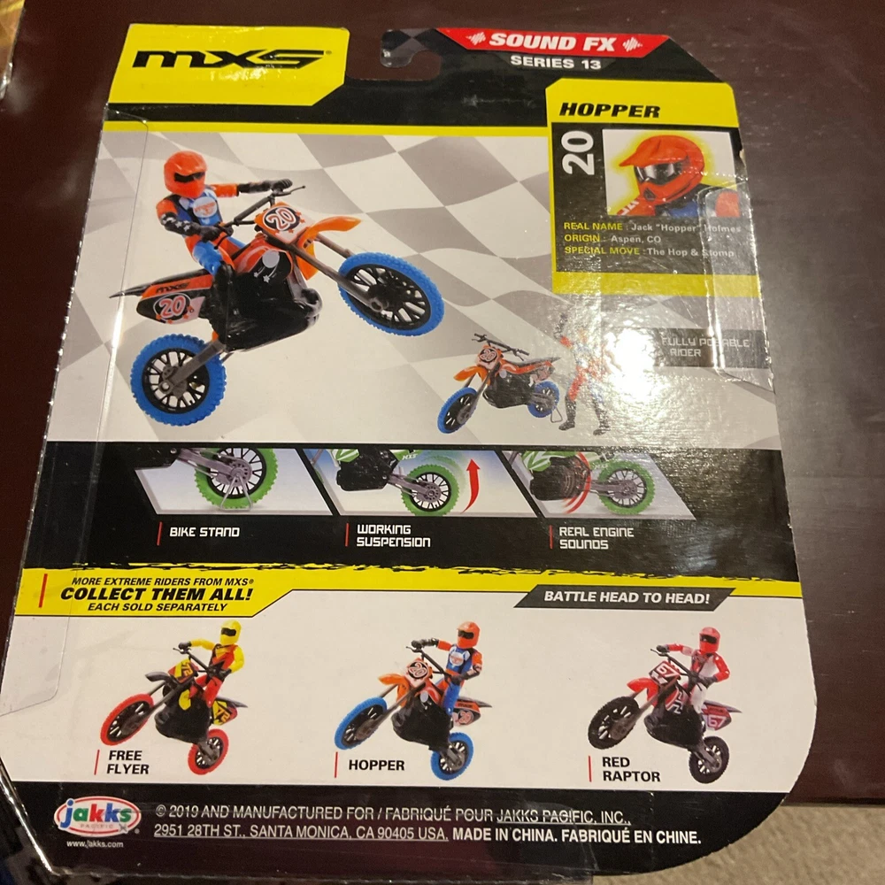 Includes: Rider, Bike, Helmet, Bike Stand Sport: Motocross Items Included: 1 MX Moto Sound FX, Bike, Rider, Helmet, Bike Stand Year Manufactured: 2019 Brand: JAKKS Pacific Item Weight: 5.3 ounces (as shown) UPC: 192995405059 Vehicle Type: Motorbike Character: #20 Jack "Hopper" Holmes Series: Series 13 Franchise: Moto Extreme Sports Features: Real Suspension, Articulated Rider MPN: 40505 Type: Action Figure gtin13: 192995405059 Material: Die Cast Metal with Plastic Parts Country/Region of Manufacture: China Theme: Sports