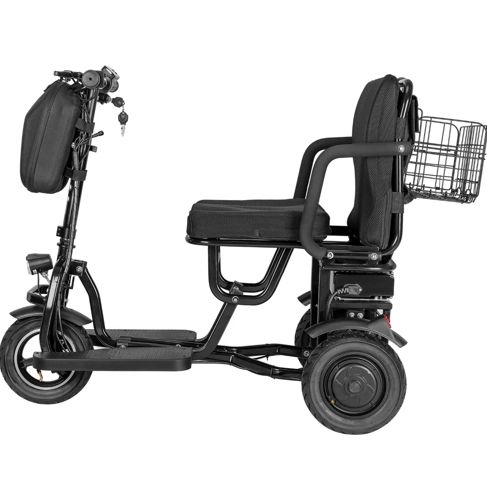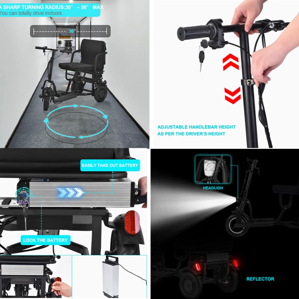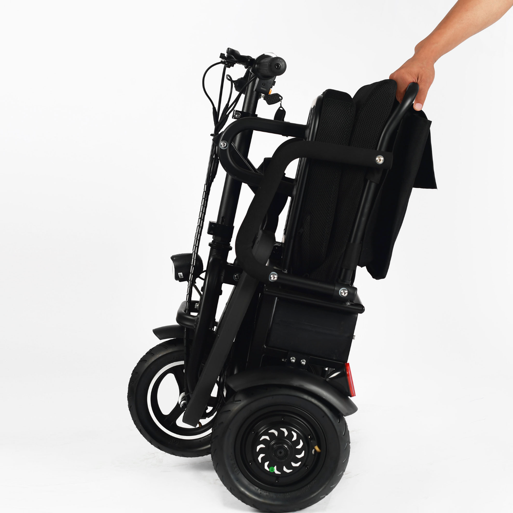 Introducing the new Folding Mobility Scooter by MotoTec. Its compact, three wheel styling makes for a sharp turning radius, 2 hub motors built into the rear wheels provide amazing torque for riding up inclines with its light weight durable frame made from Aluminum. The lithium battery is light weight and lasts longer than your standard competing lead acid models. Comes standard with headlight, rear lights, key start, 3 forward speeds(with additional slow 1.5mph store speed), reverse, dual rear drum brakes, comfortable seat with backrest, front & rear baskets and large 10 inch air filled tires to provide a comfortable ride. IP Water Rating: Wires: IP67 Battery: IPX7 Motor: IP66 Throttle: IPX5 Brake Lever: IPX6 Switch: IPX4 Controller: IPX5 Front & Rear Lights: IPX4 Specs: Motor: Two 350w Hub Motors (700w Total) Brushless Battery: 48v 10ah Lithium Ion Charger Included: Yes Charge time: 4-8 hrs 3 Selectable Forward Speeds: 5, 10, 17 mph Matching Reverse Speeds: 2, 3, 6 mph Slow Store Speed Mode: (Fwd:1.5mph, Rev:1mph) Max rider weight: 286 lbs Baskets: Front & Rear Range Per Charge: 10-20 miles (weight/terrain/speed dependant) Handlebar: Adjustable Up & Down Foldable Scooter: Yes Lights: Front & Rear Bottom Seat Cushion Size: 16 wide, 14 long Top Seat Cushion Size: 16 wide, 17.5 tall Top of Seat Height from Ground: 21 inches Brakes: Dual Drum (with parking brake) Tires: 10 inch Pneumatic Scooter Size: 42x22x33 inches Folded Size: 17x22x33 inches Scooter Weight: 62 lbs (54lbs without battery) Box Size: 33x22x17 inches Box Weight: 75 lbs Warranty: 30 days parts replacement