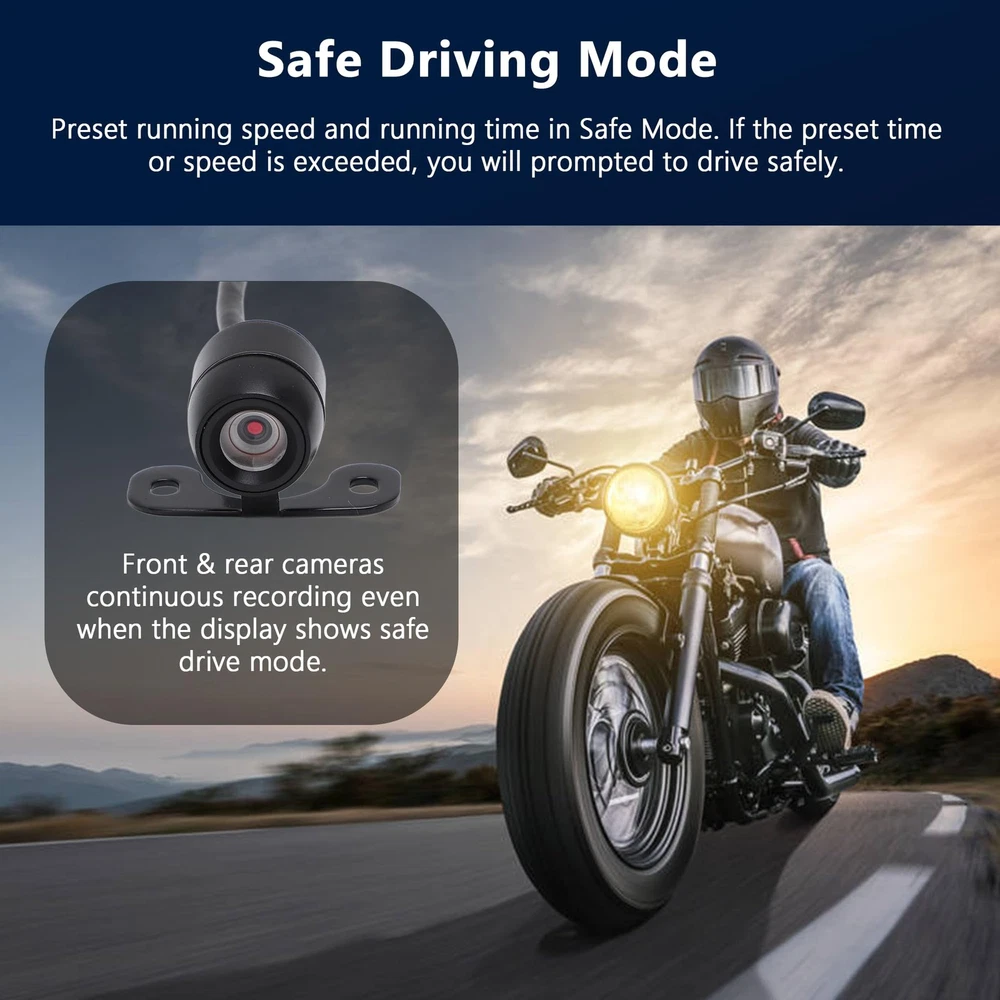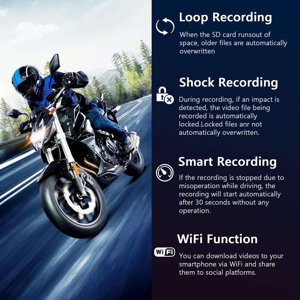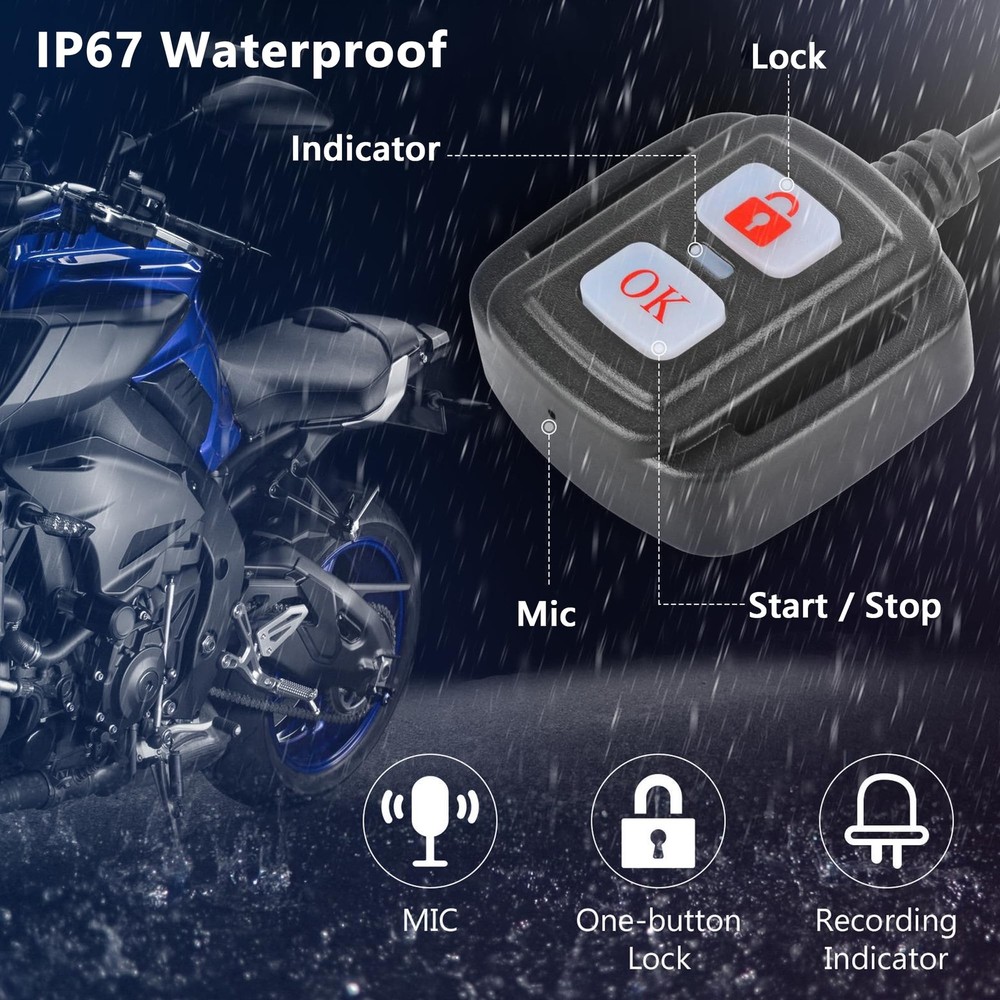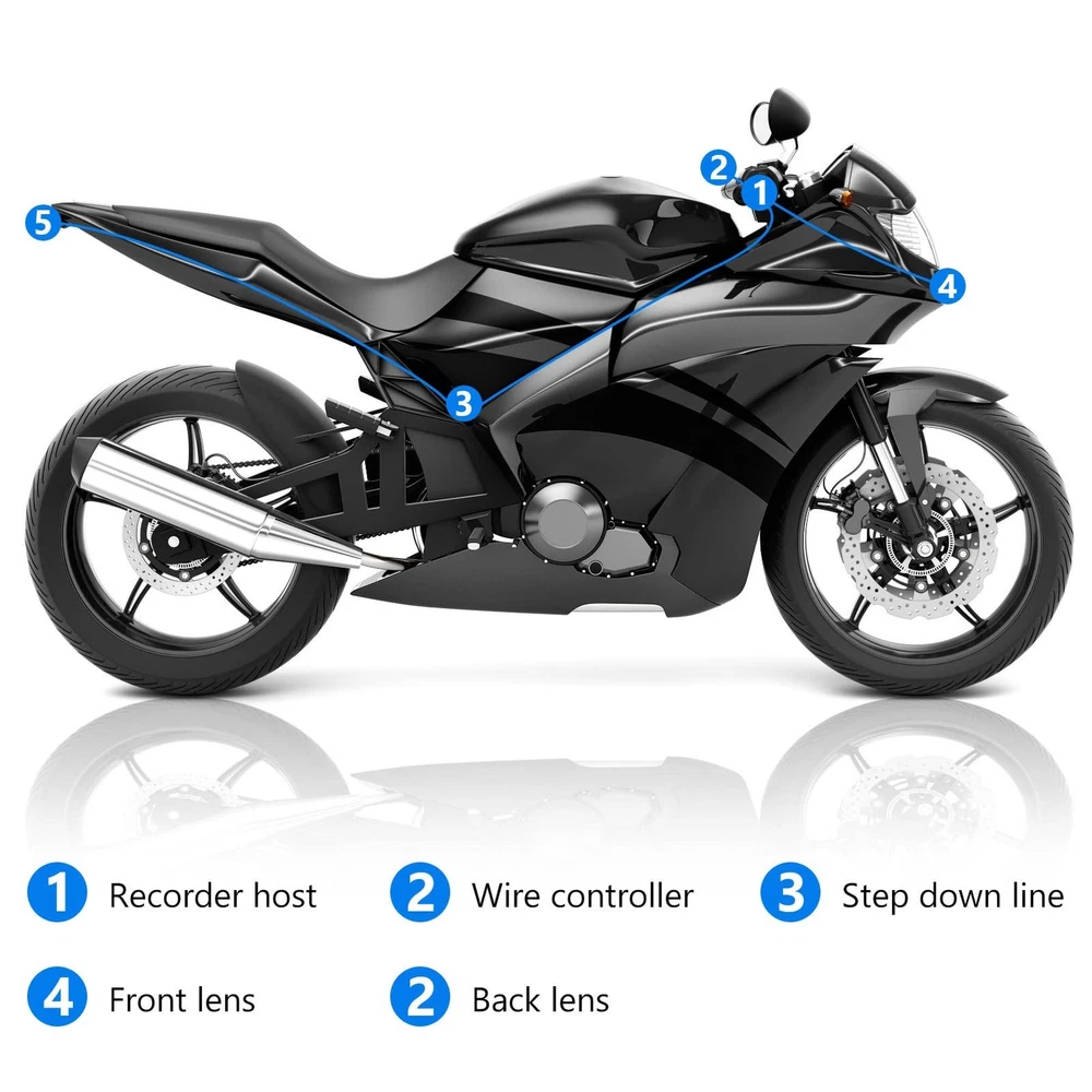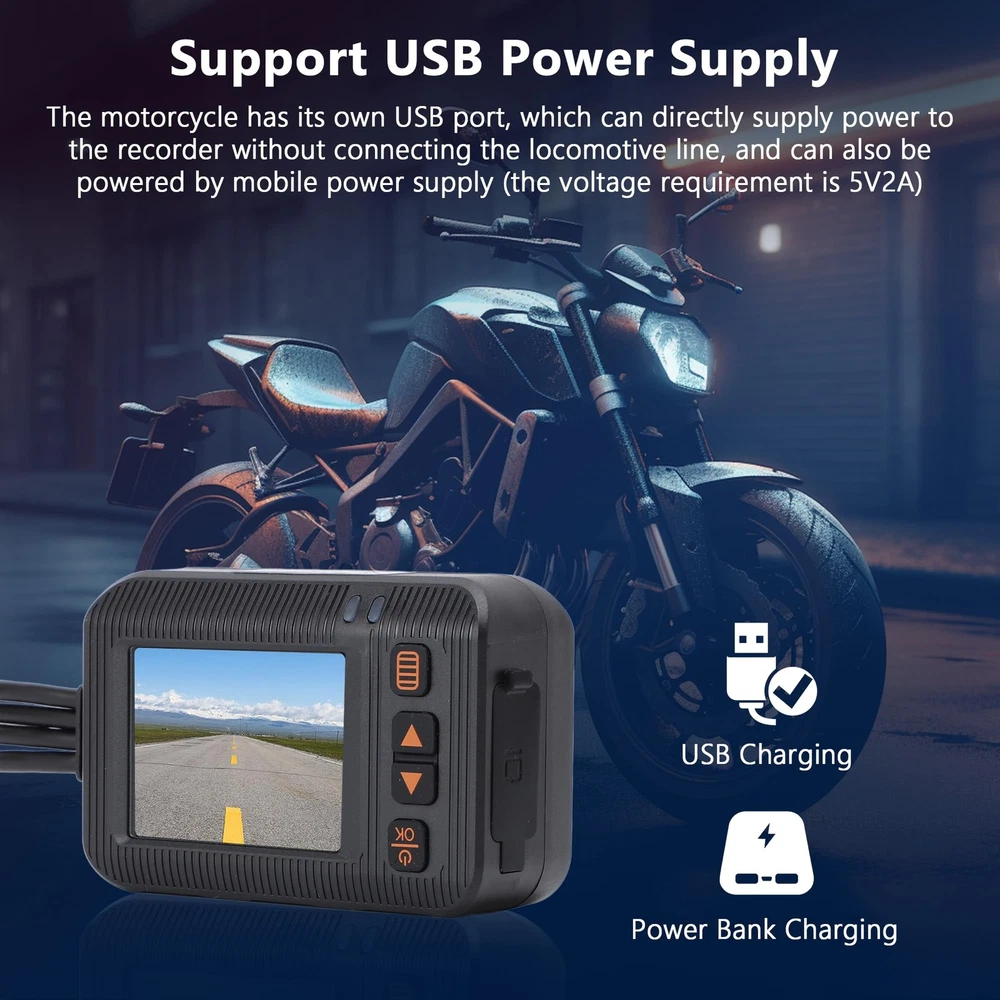 How to Use: Wiring instructions: 1. Red?connect to ACC positive line; 2. Black?connect to the negative circuit of the power supply; 3. ?connect to the power switch button; 4. Yellow?connect to the camera. Specification: Item Type: Motorcycle driving recorder Shell Material: ABS Color: Black Applicable Model: All motorcycles Front Camera Angle: 120° Rear Camera Angle: 90° Display Screen: 2.0in Grade: Host IP65 waterproof, lens and cable IP67 Video Format: VGA Loop Recording: Support, 1 minute, 3 minutes, 5 minutes Frame Rate: 30f/s Recording: Recording by wire controller, support opening and closing Playback: Support video playback, view pictures Support Automatic Shutdown Button Sound Screen Dynamic Induction Parking Monitoring Intermittent Recording: 0ms Memory: Support memory card 4GB-32GB Date Tag: Display on the video screen, support settings Starting Time: 2S Power Supply: 12-24 to 5V Language Setting: Simplified/Traditional/English/Russian/Japanese/Thai/Korean Working Temperature (?): (-20?-70?) Battery Type: High temperature polymer lithium battery 180mAH Wire Control Function: Support camera, lock video, recording function Package List: 1 x Host 1 x Power Cord 1 x Step-Down Line 1 x USB Cable 1 x Button Switch Line 1 x Camera Connection Line 2 x Camera 1 x Bracket 2 x Adhesive Sticker 6 x Screw 1 x Hex Wrench 1 x Manual Ultra Camera: This motorcycle driving recorder (host DVR IP65 waterproof, camera IP67 waterproof) is Whether it's raining or snowing, you can trust that this recorder will continue to function flawlessly. Does not support and . Clarity Recording: The dash cam uses AIT chip and two lenses at the front and rear. Front 1080P, rear 720P, using lossless AHD dual , super anti‑interference, avoid vibration and flicker. Does not support tracking and connection to mobile APP, only supports DVR host playback, or remove the memory card to connect to the computer to play video. Intelligent Parking Protector: After installing the driving recorder wiring kit, it can be turned on and off when the motorcycle is turned on/off. When the parking mode is turned on, it will automatically start recording when the motorcycle collides while parking. Ensuring that every detail on the road is captured accurately. Loop Recording: Motorcycle DVR use built‑in sensor, which automatically locks the recorded video file in an emergency (severe vibration, car accident collision). The motorcycle driving recorder supports up to 32GB memory card (excluded). When the capacity of the memory card runs out, it will automatically overwrite the old files in order. Wired Control: Motorbike Camera comes with a wired controller. The controller features a recording status indicator and a microphone, allowing you to start/stop recording and lock video files with a simple press of a button. Install it on your motorcycle's handle for quick and hassle-free control, enhancing your overall recording experience.