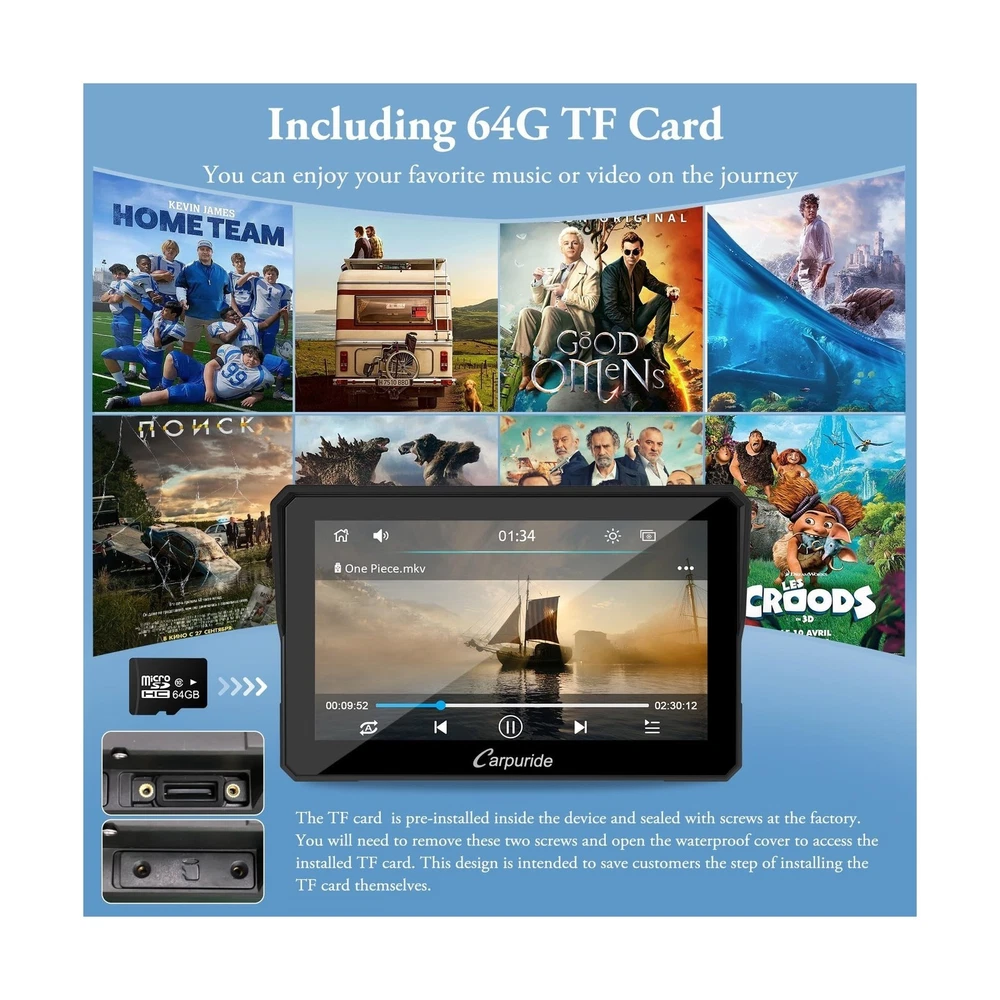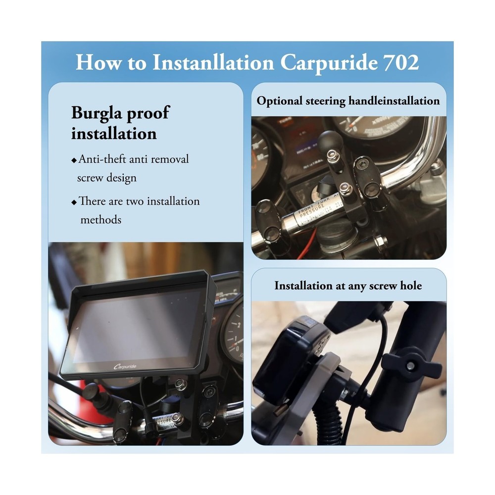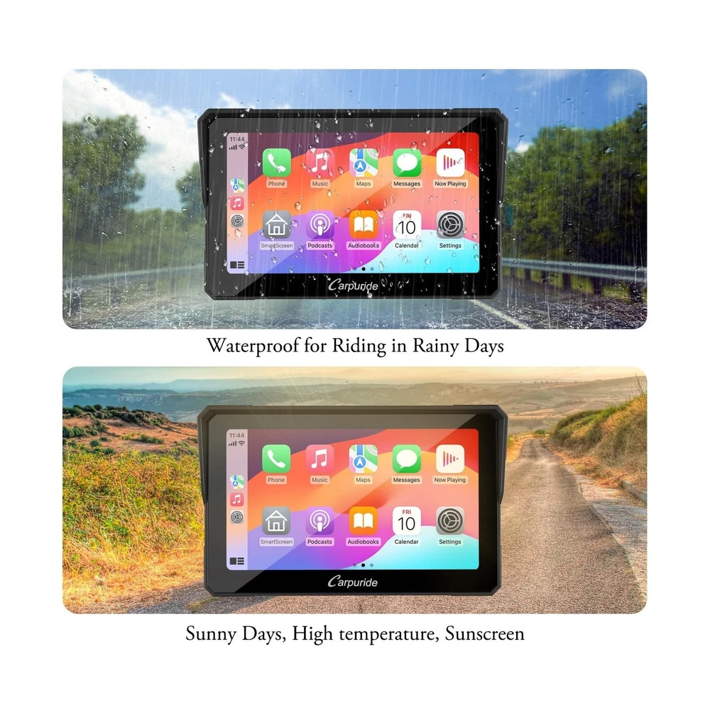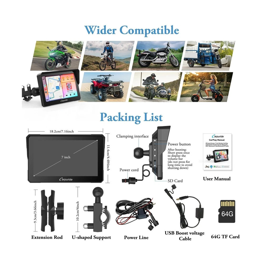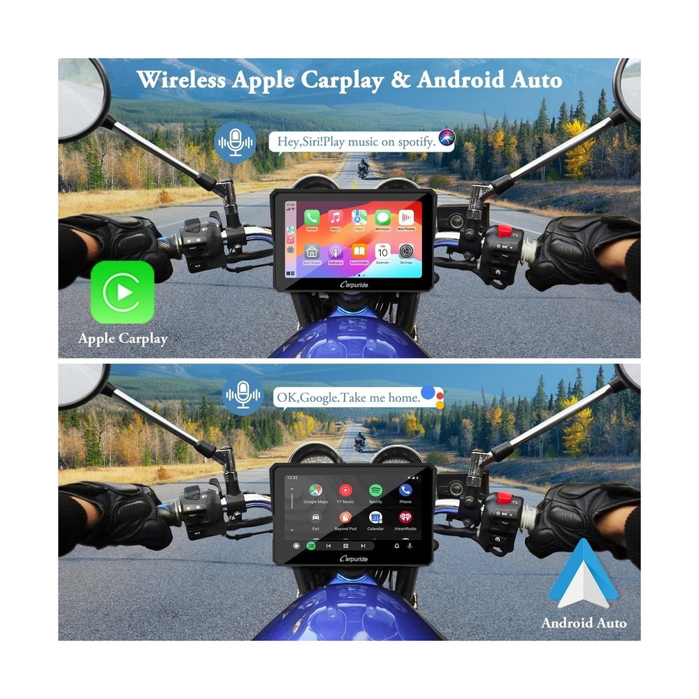 Carpuride W702 for Motorcycle, 7 inch Waterproof Touchscreen, Portable Carplay/Android Auto GPS Navigation for Motorbike, Support Dual Bluetooth, Car GPS, Siri, G00gle Assistant, TF-64G Description Features: Wireless CarPlay and Android Auto for Motorcycles: Our carpuride W702 motorcycle carpaly has CarPlay or Android Auto functionality. By wirelessly connecting your smartphone to your motorcycle's touchscreen via Bluetooth, you can access map navigation, phone calls, music playback, text messaging, and more with the help of Siri or G00gle Assistant. Keeping your hands free allows you to focus on the road and ride safely. Compatible with OS 6+, Android 11+ Built-in Dual Bluetooth: Carpuride W702 Motorcycle GPS carplay features built-in Dual Bluetooth connectivity, pair the carplay touch screen with your smartphone and Bluetooth-enabled headphones or helmet, you can make hands-free calls or enjoy your favorite music, without take off your helmet. The convenience of dual Bluetooth seamless connection not only keeps your phone safely in your pocket but also allows you to enjoy a free riding experience. 7" HD IPS Touch Screen: The carplay screen for motorcycle is equipped with a 7-inch high-definition IPS touch screen with a resolution of 1024*600, making the visual effect more intuitive and the touch responsive. Vibrant 65K color and up to 1000nit peak brightness ,provide a clear and wonderful viewing experience even under bright outdoor sunlight, and include 64G TF cards. IP67 Waterproof & Anti-Theft Design: IP67 Waterproof and Durable design, even if you ride in the rain or scorching sun, our motorcycle carplay screen can still be used normally, no need to worry about all kinds of weather! The Thief-proof detachable bracket design keeps the motorbike touch screen under control, providing you with higher security and convenience. It works flawlessly in a temperature range of -20C to 70C. Built-in EQ With its built-in preset EQ and user-customized 16-band HD EQ with 12 adjustable frequency sections, you can enjoy a wide variety of music styles and sound effects. when playing music through SD, and Bluetooth Music, click EQ,open or close "Loud" to turn on/off the bass effect, you can also choose the sound effect mode, rock, classical, jazz,and other sound effects. Two Power Connection OptionsUsing the motorcycle power line to provide 12V and 1A to the battery. The motorcycle's USB port provides a current of 5V and 2.5A or higher, use the USB boost cable to directly connect the W702 device to the motorcycle's USB port. The W702 has built-in reverse protection for convenience. Even if the cable is connected incorrectly, the device will not be damaged. Easy Installation, Suitable for All Motorcycles: This portable motorcycle car screen comes with a bracket kit and tools for easy installation. Specially designed bracket kit and screw system with a safe and stable setup makes it easy to securely mount the screen on any motorcycle; (Simple wiring, ACC +12V and ground), NOTE: Not perfectly compatible with Samsung Note as well as S series. Before buy, please make sure your phone supports wireless carplay or wireless android auto. Notice: The accessory 64GTF card does not support software upgrades. It only supports storing music and videos for local playback. If you want to update software, please use a small capacity 32, 16, 8, 4GB card. Notice: Our model 702 does come equipped with a TF card; however, unlike other accessories, the TF card is not placed inside the packaging. Instead, it is pre-installed inside the device and sealed with screws at the factory. You will need to remove these two screws and open the waterproof cover to access the installed TF card. This design is intended to save customers the step of installing the TF card themselves. Notice: When using the motorcycle power line to supply power to the battery, ensure that the output voltage and current are 12V, 1A. If the USB port on the motorcycle outputs voltage and current less than 5V, 2A, it is not recommended to use the Carpuride moto to connect the USB boost line, as insufficient voltage or current may cause the motorcycle carplay screen to automatically shut down. Product Details: Brand: Carpuride Model Name: CARPURIDE W702 Vehicle Service Type: Car, Motorcycle Screen Size: 7 Inches Special Feature: Bluetooth, GPS Navigation, Touchscreen, Waterproof Connectivity Technology: Bluetooth, Wi-Fi Map Type: Worldwide Sport: Motorcycling Included Components: 1x 7 inch Motorcycle carplay screen, 1x Extension Rod;1x U-shaped Support, 1x Power cable;1X64G TF, 1x User manual See more Audio Output Mode: Stereo Product Dimensions: 7.2 x 1.74 x 4.49 inches Item Weight: 1.85 pounds Item model number: 704 Date First Available: October 30, 2023 Manufacturer: Carpuride Delivery We Do Not Ship Outside of the Continental US. Return Policy All items qualify for returns within 30 days of receipt. Seller is responsible for return shipping on any item that is not damaged. Feedback We take our reputation seriously, we buy and sell online, so we understand the value of trust. If you are unsatisfied with your order, please contact us and we will work with you to resolve it to your satisfaction. WELOCME TO BUY PEAK Power Vision Automotive High Performance 9007/HB5 65/55W Headlights (2 P... 16.43 USD 17.48 USD Free shipping 6% off
