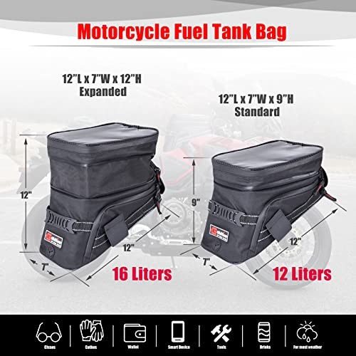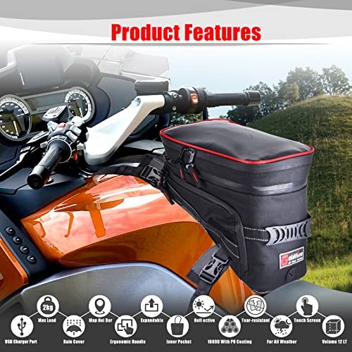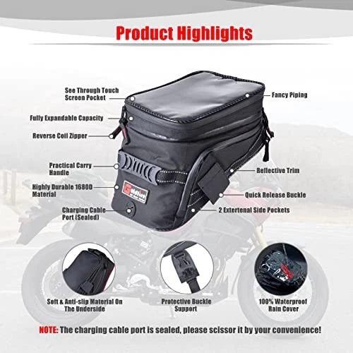 Return Policy Fast Delivery Trusted seller Motorcycle Tank Bag Expandable ADV Gas Oil Fuel Tank Saddle Bag with Strong Strap Mount Water Resistant Motorcycle Storage Bag(Red Piping) Product Description High Quality: Imported waterproof nylon material and thickened 1680 Oxford cloth (which makes the bag tear resistant and wear resistant. The structure is extremely strong and will secure your phone and things inside the bag.They are more durable than ordinary material bags. ) + waterproof cover + with four Strong Strap Mount(Speed over 120 kilometres per hour) Expandable Capacity: This gas oil tank bag for motorcycle has the Expandable Capacity function, open the zipper in the motorcycle luggage bag's bottom, it can expand from 12L to 16L of storage. Touch Screen Phone Pouch: Adventure/Dirt Tank bag has a special designed which is a touch screen phone pouch bag on the top, convenient to use your phone or navigator. Waterproof material and rain cover you can use it on rainy day. And the best part is, you still can use your touch screen even the rain cover is on. Quick Release: This waterproof motorcycle Gas Tank Bag have strong quick release straps for quick mounting and refueling. Protection: This Motorcycle Tank Bag has bulit in pads under each buckle to protect the tank, also can put the pad to cover the buckle, get you a clean look when you take away the tank bag. Fitment: Universal Fit for most bikes, such as off-road, dual-sport and adventure motorcycles. ADV Tank Bag compatible with Honda Yamaha Suzuki Kawasaki Harley Adventure/Dirt Bikes( Including but not limited). Shipping Returns Payment Shipping Shipping is FREE to all addresses other than APO/PO boxes in the lower 48 states. All our stock ships from US-based warehouses. Shipped via USPS or UPS (depending on location and package weight) Unless stated otherwise, all orders will ship within 24-72 hours of your payment being processed. Check our feedback to see the great reviews of FAST shipping we offer. Returns Seller does not accept returns Payment We currently accept payment via eBay managed payments only. Once payment is cleared, we will dispatch your shipment within 1-3 business days. Please refer to the "Shipping" tab for more information regarding shipping speed to your destination.