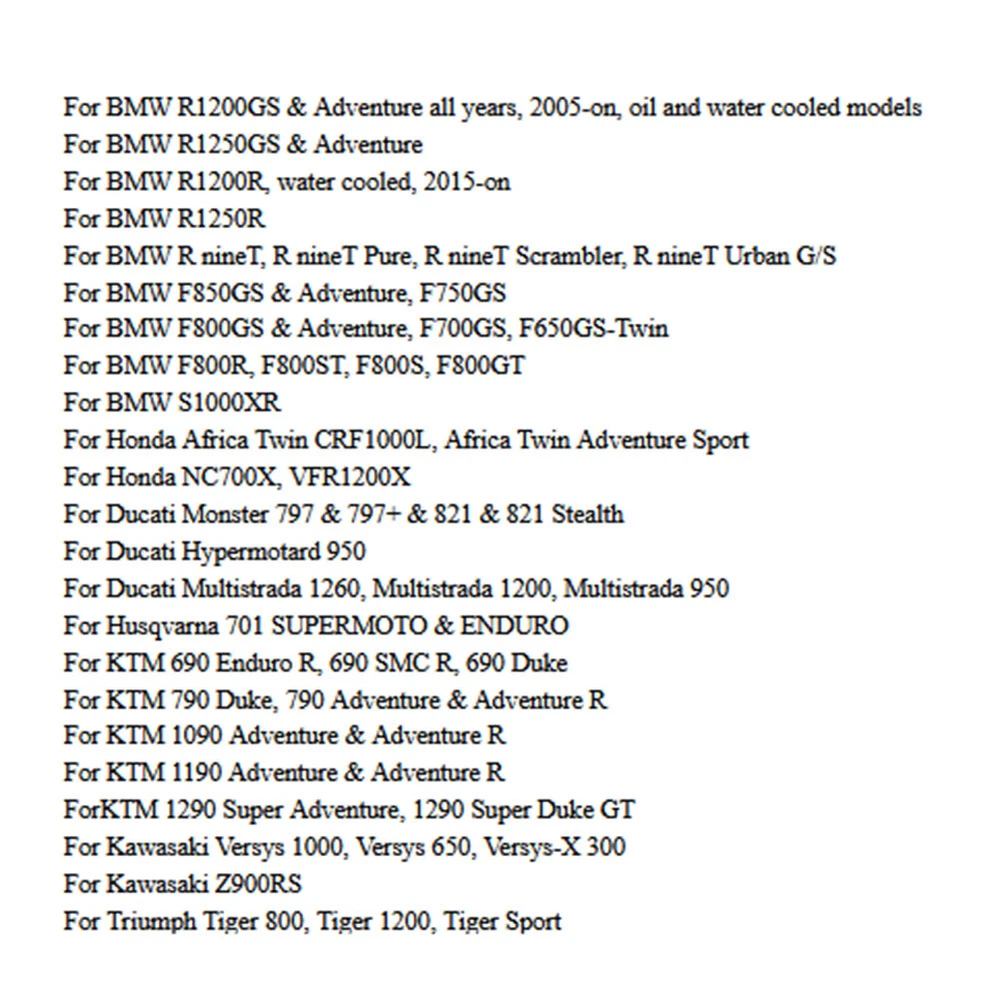 You may also like 1pc Rear Right Window Regulator Fit BMW 325I 328I 330I 335D 335I M3 39.48 USD Free shipping Rear Power Lift Tail Gate Lock Actuator Latch 13581405 Fit Cadillac Chevy GMC 113.51 USD Free shipping Front Bumper Grille Upper Grill For Land Rover Discovery Sport 2015-2019 2016 119.12 USD Free shipping For 50cc 110cc TAOTAO COOLSTER JCL KANDI 12-12mm Tie Rod Ends Kit Ball Joints 25.07 USD Free shipping For Honda CRF150R CRF250R CRF450R CRF250X Carburetor Kit Choke Plunger Valve 11.47 USD Free shipping Rear bumper Right Tow Eye Cover LR028087 Fit Range Rover Evoque dynamic exhaust 31.19 USD Free shipping Product Description Motorcycle waterproof handlebar travel bag For Yamaha Tenere 700 storage bag Motorcycle waterproof handlebar travel bag for Yamaha Tenere 700 storage bag Specifications: Condition:100% Brand New Color:black Material:nylon Product Size:As picture shown Packing list:1pcs handlebar travel bag Features: *Made from good quality alluminum alloy, lightweight, durable and precise. *Enough space for mobil, documents, wallet etc. *Quick fastening: mounting/removing with two handgrips possible. *Better use of space, storage tools, increase storage function. *Waterproof lining. The interior is reinforced with a rigid PVC insert to bulging and stability. *Waterproof material can effectively protect your tools in rainy days, and wear-resistant. *Multi functional tool kit, can better help you store all kinds of items Fitment: For BMW R1200GS & Adventure all years, 2005-on, oil and water cooled models For BMW R1250GS & Adventure For BMW R1200R, water cooled, 2015-on For BMW R1250R For BMW R nineT, R nineT Pure, R nineT Scrambler, R nineT Urban G/S For BMW F850GS & Adventure, F750GS For BMW F800GS & Adventure, F700GS, F650GS-Twin For BMW F800R, F800ST, F800S, F800GT For BMW S1000XR For Honda Africa Twin CRF1000L, Africa Twin Adventure Sport For Honda NC700X, VFR1200X For Ducati Monster 797 & 797+ & 821 & 821 Stealth For Ducati Hypermotard 950 For Ducati Multistrada 1260, Multistrada 1200, Multistrada 950 For Kawasaki Versys 1000, Versys 650, Versys-X 300 For Kawasaki Z900RS For Tiger 800, Tiger 1200, Tiger Sport Payment We only accept PayPal payment. Contact Us 1.Do not hesitate to contact us anytime before and after your purchase, we are committed to your 100% customer satisfaction. 2.I am here and ready to assist you with any questions or concerns you might have before or after the purchase. 3.My goal is to make sure you are a happy customer and pleasant shopping with us. Shipment 1. Ship from United States , and only to eBay ADDRESS. Package handling only takes 1 to 3 business day at our warehouse, so please make sure entering correct payment and shipping information before checking out. 2. We only ship to the Lower 48 states, and we do not ship to FPO, APO or PO Box addresses. 3. Import duties, taxes and charges are NOT included in the item price or shipping charges. These charges are the buyer responsibility.Please check with your country customs office to determine what these additional costs will be prior to bidding/buying. Returns 1. If you receive any damaged or defective items, we will exchange it as quickly as possible. 2. You must contact us within 7 days of delivery of the product to notify us of any defects. 3. You need to send a picture to prove the problems by using ebay's attaching files button 4. Items must be in original box and kept in good condition. 5. Buyer is responsible for return shipping cost if there isn't any problem with the product. No matter the item is free shipping or not, we pay money for the shipping.You need to cover the actual shipping cost provided by us. Feedback If you are satisfied with the purchase and our total service, your comment is very important in our business success. Please take a minute to leave us a positive feedback with an overall Detailed Selling Rating (DSR) of 5. Our eBay account setup auto feedback, so eBay system gives you automatically Positive feedback back after your positive feedback left. If you plan to give us a neutral/negative feedback Or open ebay/paypal case, please write to us immediately so that we can do our best to resolve your problem. powered by You may also like 5X Car Festoon T10 BA9S White LED 15SMD Panel Interior Dome Map Light Bulb Lamp 10.4 USD Free shipping 44mm Adjustable Lever Hand Operated Compression Latch W/ Raised Fit trailer 15.68 USD Free shipping Front Gladiator Bumper Grill Grille For 1997-2006 2005 Jeep Wrangler TJ US STOCK 80.31 USD Free shipping Front Bumper Skid Plate Guard Cover Trim For Land Rover Range Rover 14-17 Black 110.01 USD Free shipping Windshield Motorcycle Front Windscreen For Kawasaki Ninja 250R EX250J 2008-2012 19.27 USD Free shipping Fender Eliminator Tail Tidy License Plate Holder for Yamaha Tenere 700 XTZ700 T7 28.5 USD Free shipping