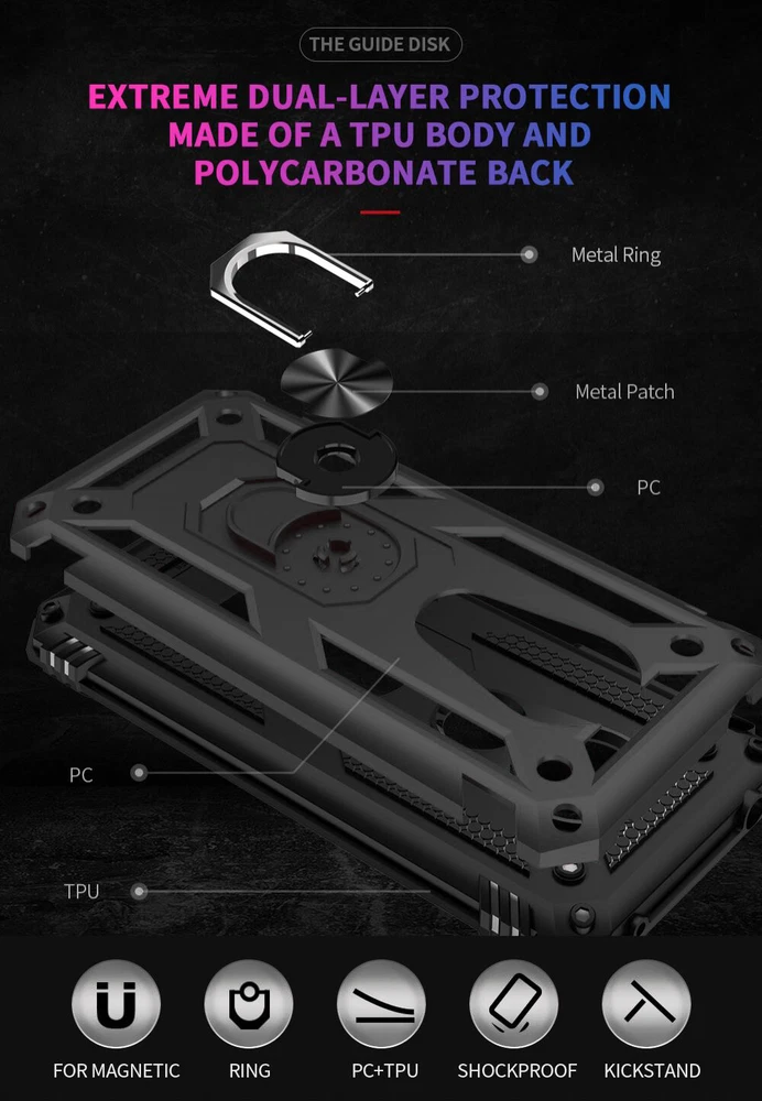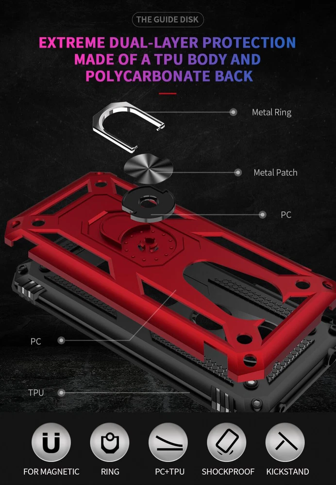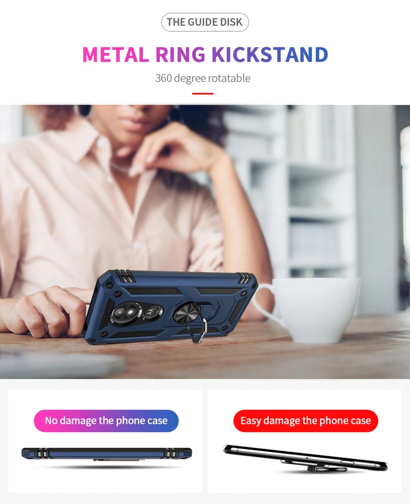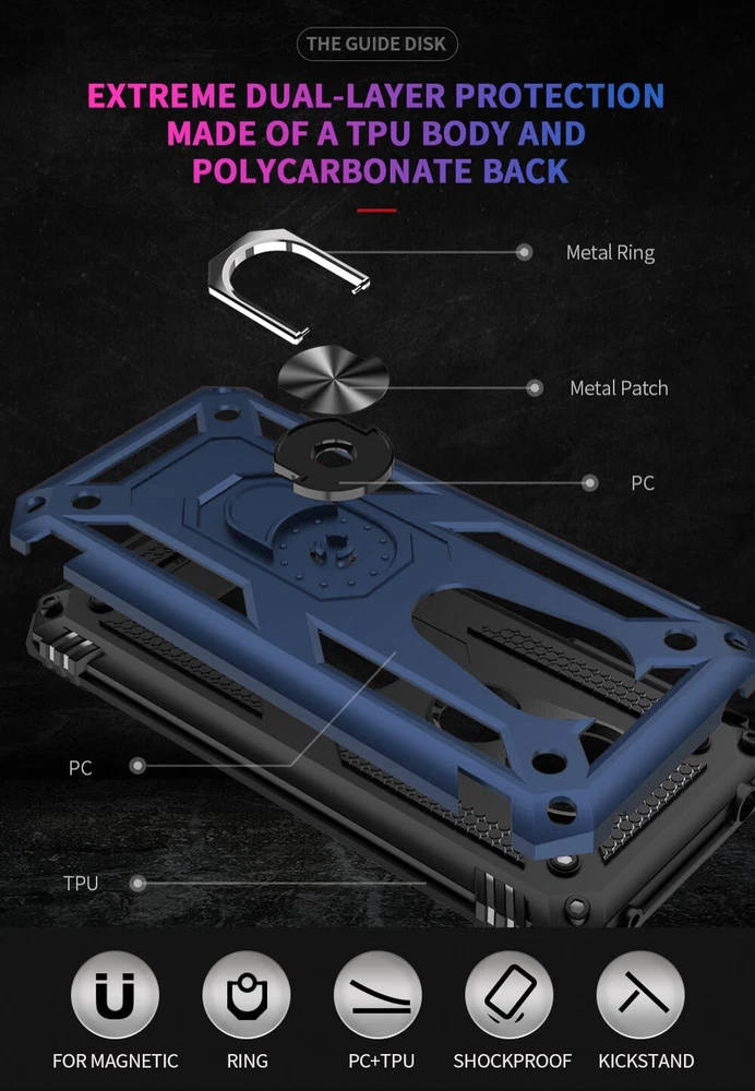 **Features** Ring Holder Kickstand Design: Built-in Multifunctional Ring Holder, Pocket-friendly, 360°rotatable. Ringer Holder also use as Kickstand. Perfect for hand free movies/video watching. High Quality Material: Dual Layers of shockproof hard shell PC and Soft shell TPU. Anti scratch, resist drop, shockproof. Non-slipping, Durable. Magnetic Support: Metal Ring Holder/kickstand perfect for magnetic function. This case can be attach to any magnetic car mount with Built-in Metal Ring Holder.