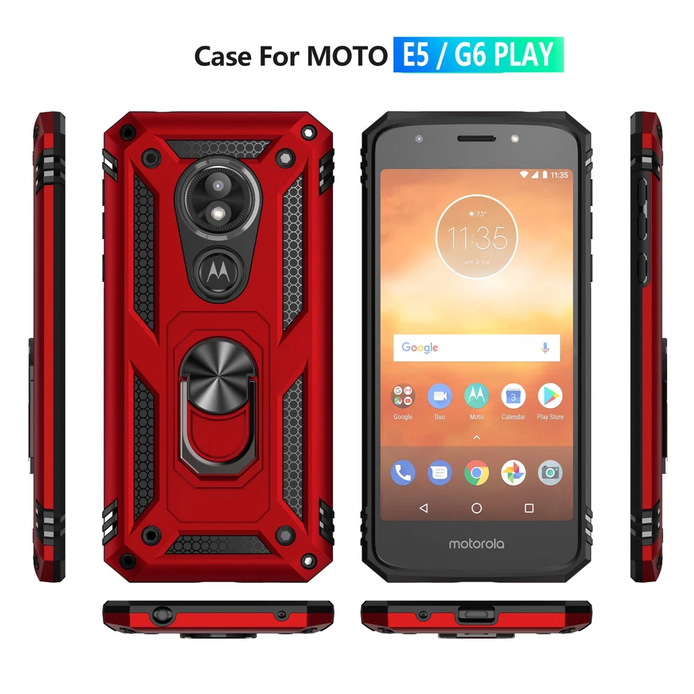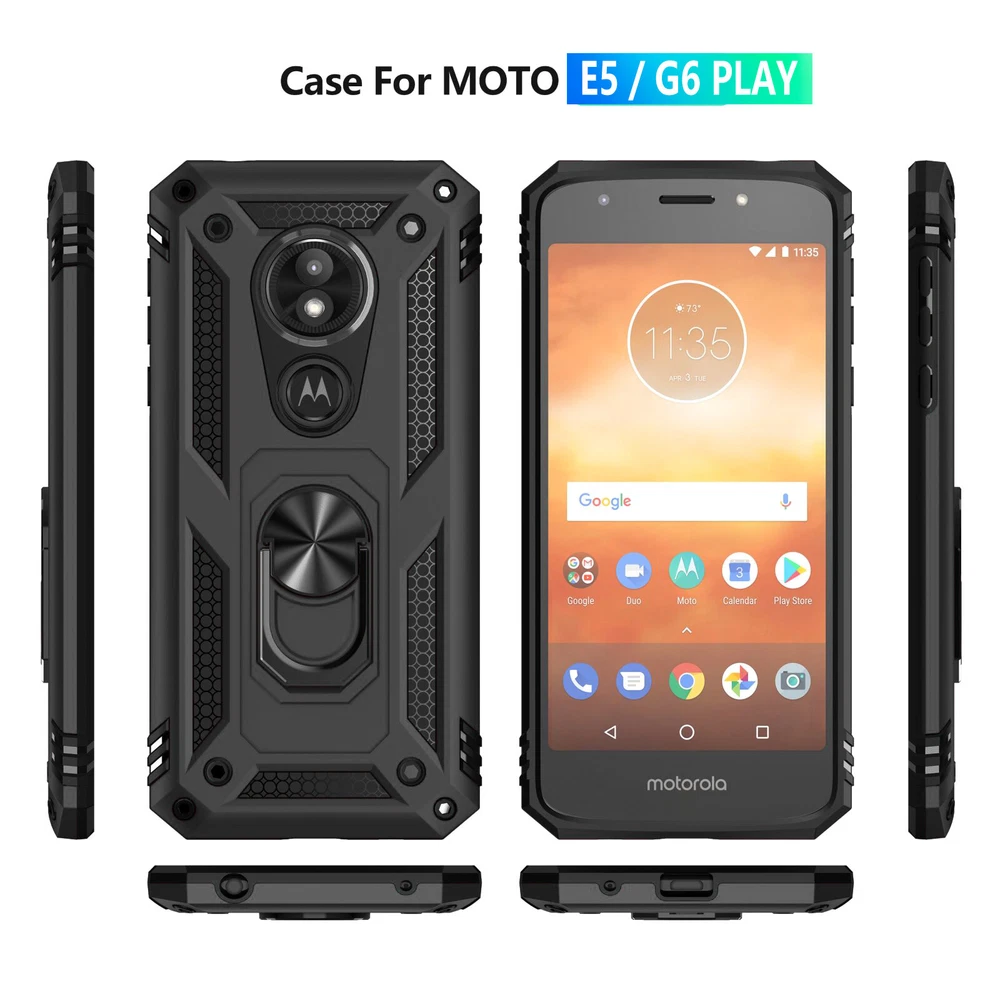 Compatible Brand: For Motorola Item Weight: 3 oz Wireless Charging Standard: Does Not Apply Items Included: Tempered Glass Screen Protector Included, Hard Case, Screen Protector Manufacturer Warranty: 2 MONTHS Manufacturer Color: Various MPN: MOTO-G6PLAY-HD Type: Fitted Case/Skin Compatible Model: For Motorola Moto E5, For Motorola Moto G6 Play Material: Rigid Plastic/Metal Character: Kickstand, Magnetic, Shockproof, Lightweight, Ring Holder, Included Tempered Glass Screen Protector Brand: Unbranded Design/Finish: 360 Protection, Dual Layers, Ring Holder, Aluminum, Metallic, Hybrid, Matte, Rugged Features: Easy to Access All Ports & Buttons, Easy to Install & Remove, Comfortable Grip, Drop Protection, Shock Absorption, Scratch & Tear Resistant, Screen Protector, 360 Protection, Accessible Controls, Anti-Scratch, Dual Layer, Dustproof, Heavy Duty, Kickstand, Lightweight, Magnetic, Non-Slip, Shockproof Mounting Type: Magnet