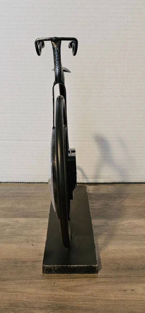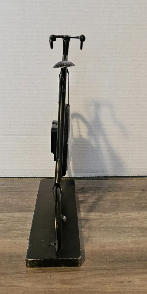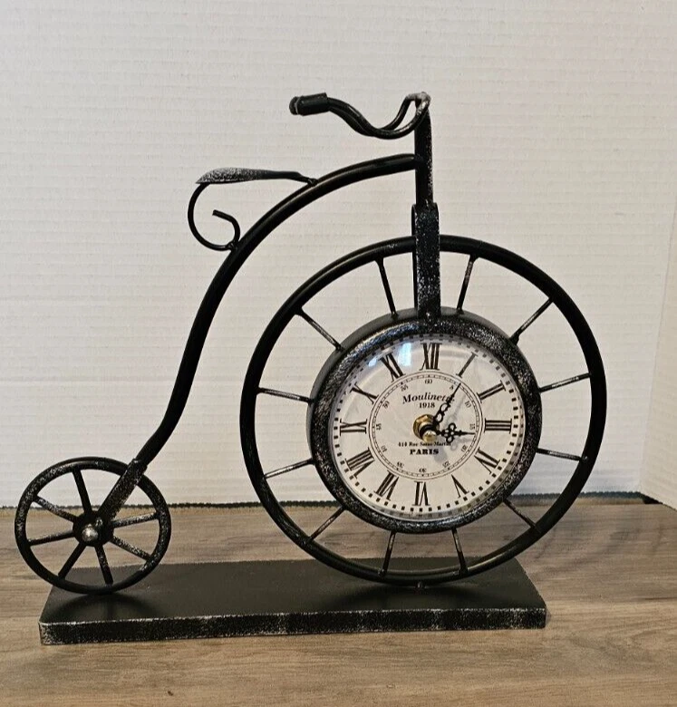 This unique Moulinette Distressed Metal Mantle Bicycle Clock is a great addition to any home décor. Its analog display type and black color give it a vintage look. The clock is made of metal and has a bicycling theme, making it perfect for those who love to ride bikes. With a height of 10 inches, this clock is perfect for mantelpieces or any other flat surface. Its brand is Clock and it falls under the categories of Wall Clocks, Clocks, and Home & Garden. Add this stylish and functional clock to your home today! Stands 10" tall, 10.5 long and 3" wide Powered by 1 AA Battery (shown in picture to check accuracy but is not included to be safe in shipping