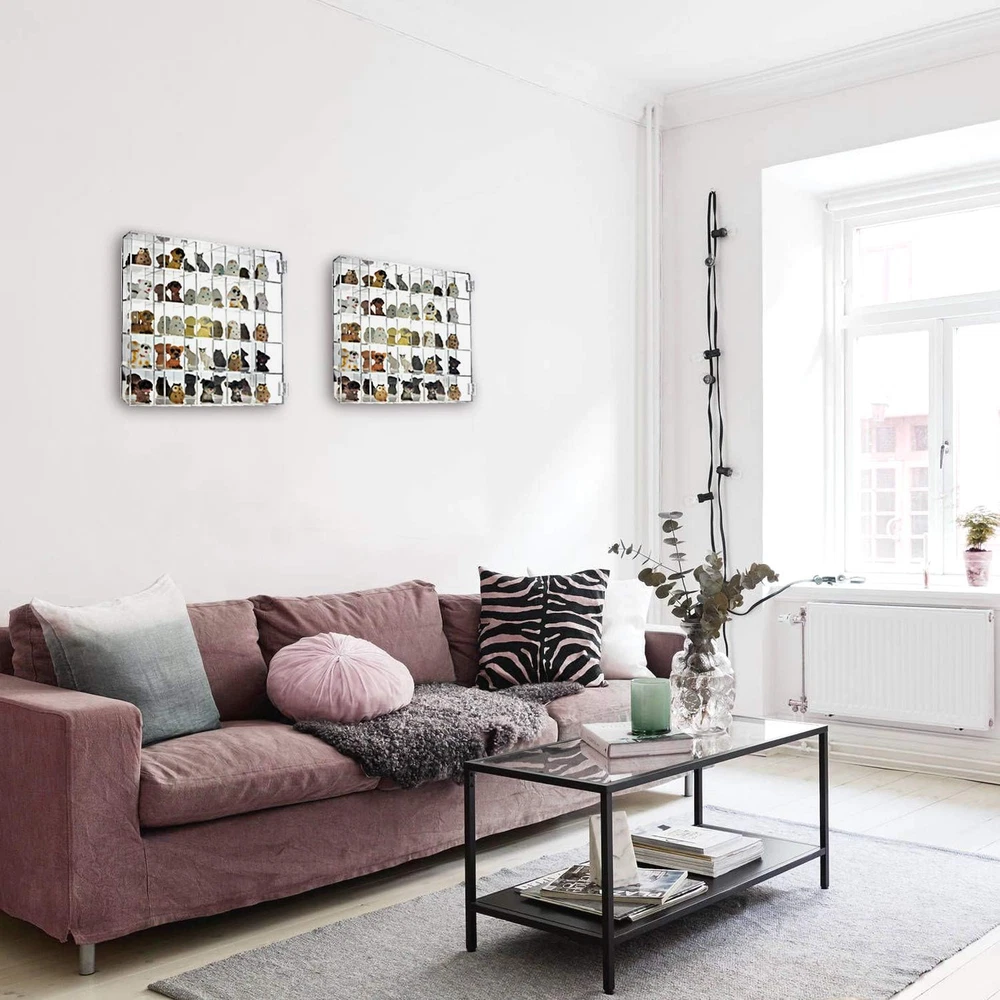 CLEAR ROCK SHOWCASE DISPLAY - This acrylic display case Includes 25 compartments, and a door secured by magnets. WALL MOUNTABLE ACRYLIC DISPLAY SHELF - Each compartment size is 2"W x 1.8"D x 2"H which allows you to display your favorite small collectibles with the dimension of 1.5"Wx 0.9"Dx 2"H. DISPLAY CASE FOR COLLECTIBLES - Your choice to place it on the tabletop or hang it on the wall for space saving easily. MATERIAL & SIZE - Acrylic, Overall: 10.7"W x 2 "D x 10.5"H; INNER SIZE OF EACH COMPARTMENT: 2"W x 1.8"D x 2"H to accommodate figurines with dimensions of 1.5"Wx 0.9"Dx 2"H. Accessories are not included Product Description FEATURES Mountable mirrored back acrylic display rack. Perfect for organizing and displaying figurines, rocks, crystals, collector items, and other small accessories. Mountable mirror back premium acrylic display rack Acrylic display storage case with 25 Compartments 5 tiered display and organizer rack is designed to be mountable with two hanging holes incorporated on the backside. Premium mountable acrylic display case Perfect size for displaying collections With 25 compartments perfect for storing collectibles, figurines, crystals, and other small accessories. Each compartment 2" in width and 1.8" in length and 2" in height. Functional Acrylic Case for Collectibles, Toys, Gemstone and Figures, etc. Trendy and chic design Made with a sleek and translucent acrylic material. Perfectly designed to display your collectibles, figurines, crystals, and other small accessories. Comes with 25 compartments Each 25 compartment is 2" in width and 1.8" in length and 2" in height. To help keep your accessories and space organized. Mountable display rack Built with two holes on the back allowing the display to be mountable. Perfect for hanging in your home, stores, trade-shows, etc. Simple and easy to use Designed to be simple and accessible. With magnetic clasp that keeps the acrylic door closed, but still can be easily opened. Mountable 25 Compartments Display Case Cabinet Stand with Mirrored Back Overall: 10.7"W x 2 "D x 10.5"H; EACH COMPARTMENT SIZE: 2"W x 1.8"D x 2"H