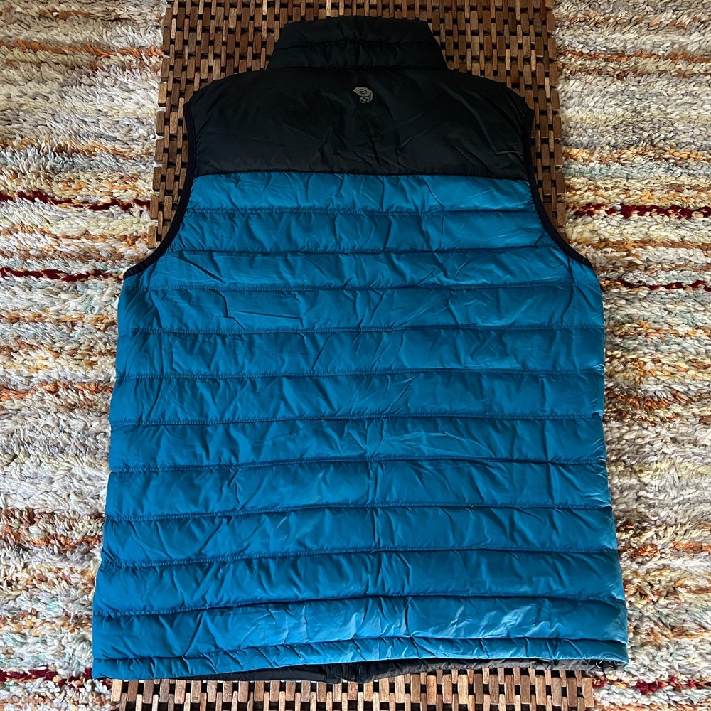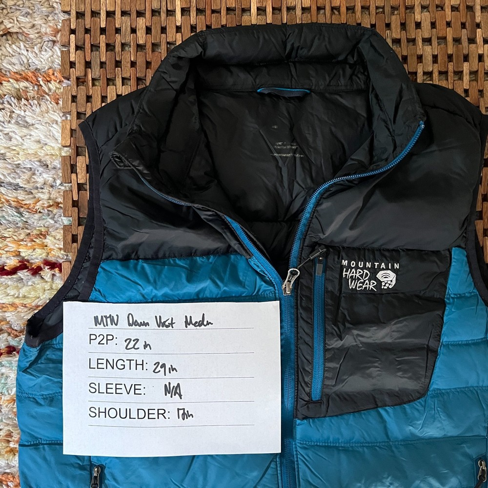 The Mountain Hardwear Goose Down Puffer Vest is a stylish and functional outerwear option for men, ideal for casual occasions in the colder seasons. Made with a durable nylon outer shell and lined with cozy polyester, this vest features a full zip closure and a stand-up collar for added warmth and comfort. The multicolor design with a solid pattern and logo accents gives it a fashionable outdoor look, while the down insulation provides superior performance for activities like hiking. With its regular fit and machine washable care instructions, this vest is a practical choice for everyday wear. Internal size label has rubbed off. Size determined by measurements.