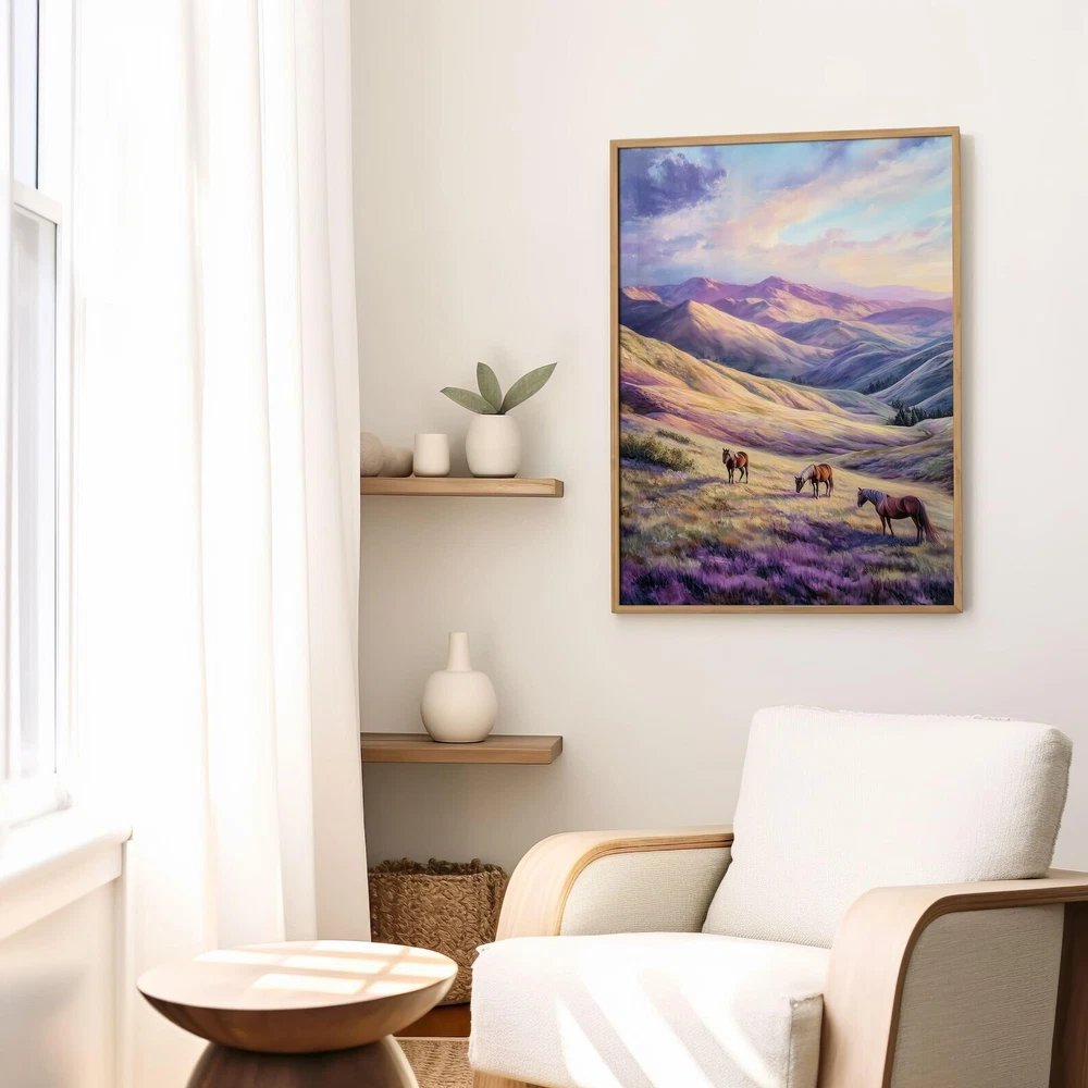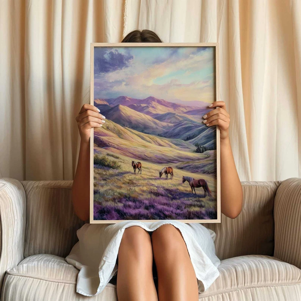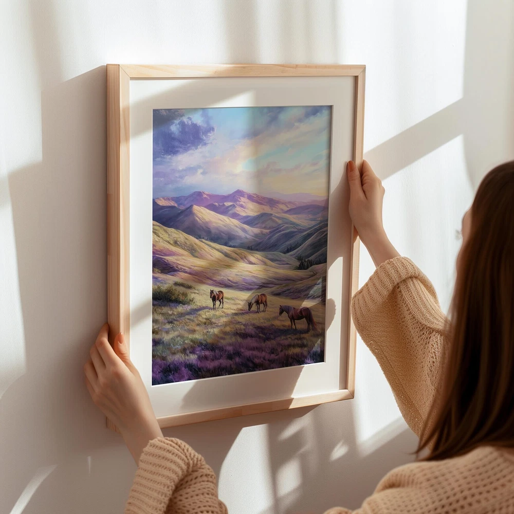 Mountain Landscape Horses Art Print Serene Nature Wall Decor Wild Horses Printable Pastel Mountain Art Peaceful Wall Art Material: Premium luster photo paper Print type: Inkjet printing One side printed + The finish provides the highest possible resolution and color saturation + Lasts up to 200 years in color and 400 years in black-and-white + Printed on high-quality resin-coated photo base paper medium + Posters can be hung with double-sided tape, tacks, or framed + Hand washing with a gentle cry cloth is recommended for extended durability I will hand select the best choice of paper for your chosen design to ensure top quality results for a beautiful, bright and luxurious print. All prints are sealed in cellophane slips for protection during transportation, and are shipped in a protective cardboard envelope.