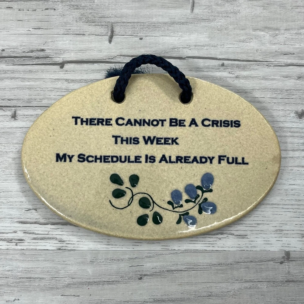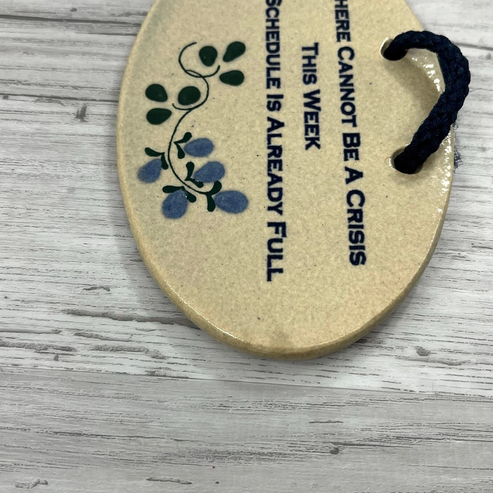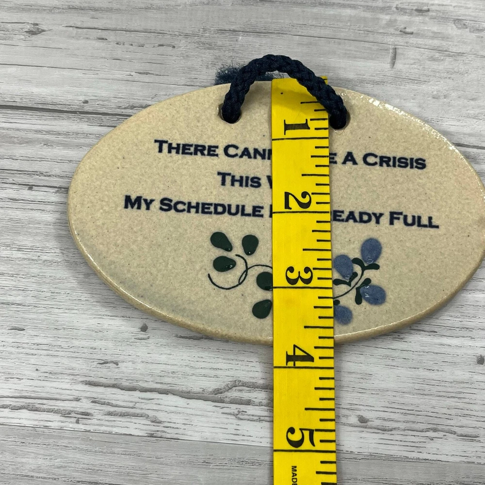 Mountain Meadows Pottery Small Floral Ceramic Quote Wall Decor "There Cannot Be A Crisis This Week My Schedule Is Already Full" Made in the USA Some discoloration Height- 4.5" Width- 5.5" Additional measurements available upon request All measurements are approximate All measurements are taken with item laying flat Colors may differ based on others computer/phone/etc settings All pre owned items have been washed and steamed All pre owned items have been looked over for flaws and will be noted in listing