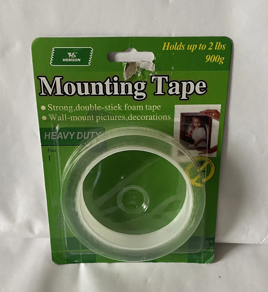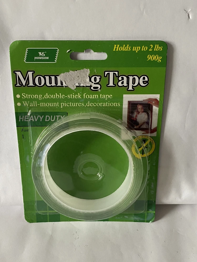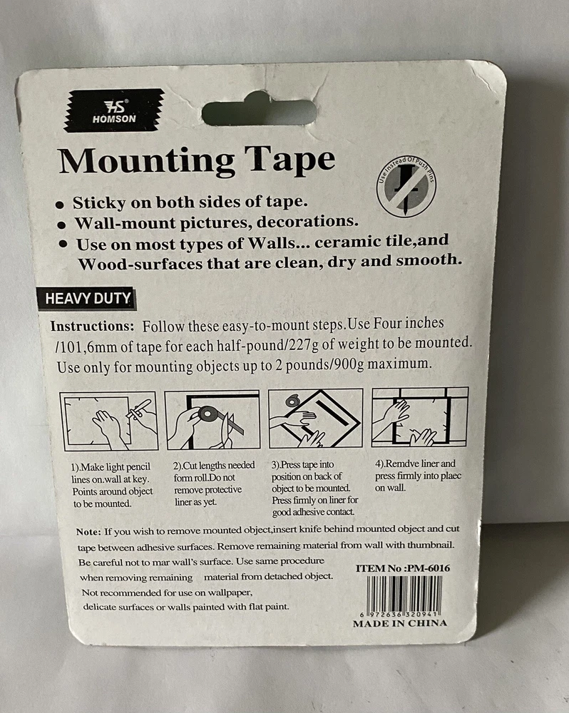 Description: 💎Mounting Tape, Heavy Duty *Holds Up 2 lbs, *2 sealed New Rolls strong, double stick foam tape. • Sticky on both sides of tape. • Wall-mount pictures, decorations. • Use on most types of Walls... ceramic tile, and Wood-surfaces that are clean, dry and smooth. *HEAVY DUTY Instructions: Follow these easy-to-mount steps. Use Four inches /101,6mm of tape for each half-pound/227 g of weight to be mounted. Use only for mounting objects up to 2 pounds/900g maximum. -1) Make light pencil lines on.wall at key. Points around object to be mounted. -2). Cut lengths needed form roll.Do not remove protective liner as yet. -3) Press tape into position on back of object to be mounted. Press firmly on liner for good adhesive contact -4). Remove liner and press firmly into place on wall. *Note: If you wish to remove mounted object, insert knife behind mounted object and cut tape between adhesive surfaces. *Remove remaining material from wall with thumbnail. *Be careful not to mar wall's surface. Use same procedure *when removing remaining material from detached object. *Not recommended for use on wallpaper, *delicate surfaces or walls painted with flat paint. **Front of packaging has a little wear & tear. Please see picture