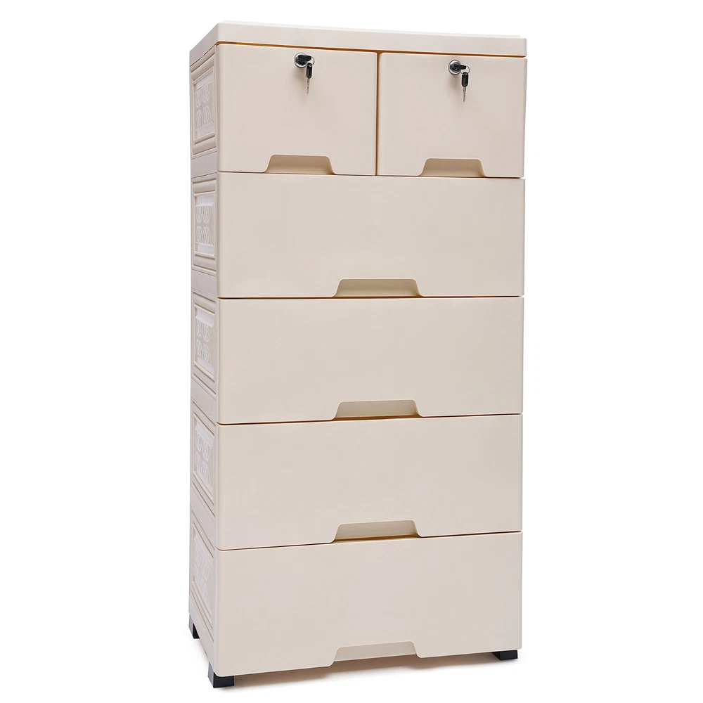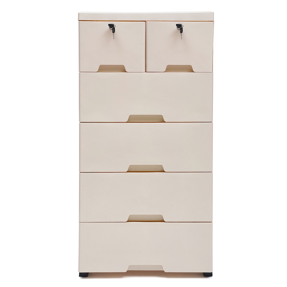 Description Are Odds and Ends Cluttering Your Room? Are You Still Worried That the Space at Home Is Too Small? Don't Worry, This Product Can Help You. This Storage Cabinet Has 6 Drawers That Can Store a Lot of Items to Meet Your Storage Needs and Give You a Neat Space. Key Features High-quality Material: This Product Is Made of High-quality Pp, Which Is Strong, Durable, and Not Easy to Deform. Good Material Can Extend Its Service Life. Elegant Appearance: the Beige Color, As Well As the Classic Design, Makes It Look Elegant. It Is a Good Decorative Piece That Can Blend in with Different Home Decor Styles and Add Color to the Home. Saving Space: This Product Is Designed Vertically. It Makes Full Use of the Unused Vertical Space to Store Items and Occupies a Small Area of 50*35cm/19.69*13.78inch, Which Can save You a Lot of Space. Strong Load-bearing Capacity: the Load-bearing Capacity of This Product Is 30kg/66lbs, Which Is Strong Enough for You to Store Items Without Worrying About It Shaking and Tipping. Large Capacity: This Product Includes Two Small Drawers and Four Large Drawers, Which Allows You to Distinguish the Placement According to the Size of the Items. the 6 Drawers Make It Possible to Hold More Items and Meet Your Daily Storage Needs. Makes Space Neat: It Has Six Drawers That Make It Easy for You to Store As Well As Access Your Items. It Can Get Your Room out of Clutter and Back to a Neat and Organized State. Excellent Sealing: the Drawer Design Makes This Product Well Sealed to Prevent Dust As Well As Insects from Entering. You Can Use It with Peace of Mind. Stackable Design: the Stacking Design Allows You to Combine and Disassemble Them According to Your Needs. You Can Store Flexibly. Protect Your Privacy: This Product Comes with Two Drawers with Locks, Which Can Protect Your Privacy Very Well. Good Stability: This Product Is Designed with a Dense Frame and Has a Large Landing Support Area, so It Is Very Stable. You Can Use It Without Worrying About It Shaking and Tipping over. Eco-friendly : the Food-grade Pp Material Is Non-toxic, Odorless, and Good for Human Health, and It Is Also Recyclable, Which Is Very Environmentally Friendly. Convenient to Move: the Four Wheels on the Bottom of the Product Are Hard-wearing and Make Very Little Noise When in Use, Providing You with a Quiet Environment. at the Same Time, It Slides Flexibly, Making It Easy for You to Move the Product and for Cleaning. Easy to Clean: the Surface of This Product Is Smooth and Flat, Which Is Easy to Clean. You Just Need to Wipe It with a Wet Rag. Easy to Install: This Product Is Simple in Structure and Complete in the Package. You Only Need a Few Simple Steps to Install It, Which Is Very Time-saving and Labor-saving. Guaranteed Customer Service: We Aim to Provide Quality Products and Services. If You Have Problems, Please Feel Free to Contact Us. We Will Reply and Solve the Problem for You As Soon As Possible. Details Drawer Stops: Each Drawer Has Raised Stops on Both Sides to Prevent the Drawer from Slipping out Easily. Rounded Corners: the Corners of This Product Are Very Rounded and Smooth, Which Can Protect You from Collisions and Is Very Safe to Place in Your Home. Thickened Top Panel: the Thickened Top Has a Strong Load-bearing Capacity, Which Allows You to Put a Lot of Items on It with Peace of Mind. It Can Also Facilitate Your Access to Commonly Used Objects. Recessed Handles: the Drawers Are Designed with Recessed Handles, Which Makes It Easier to Access Items and Saves Surface Space. at the Same Time, the Rounded Handles Protect Your Hands from Scratches and Are More Aesthetically Pleasing. Application It Is Suitable for Storing Clothes, Toys, Children's Books, and Other Items. It Can Be Placed in the Crevice Space Next to Beds, Closets, Sofas, and Cabinets. Its Load-bearing Capacity Is 30kg/66lbs. Specification Color: Beige Color Material: Food-grade Pp Shape: Rectangular Style: Modern Number of Layers: 5 Number of Drawers: 6 Load-bearing Capacity: 30kg/66lbs Product Size: 50*35*102cm/19.69*13.78*40.16inch Gross Weight: 7.9kg/17.42lbs Package Size: 51.5*40.5*49cm/20.2*15.9*19.2inch Package Included 6* Drawers 6* Drawer Panels 1* Top Panel 5* Frames 16* Panels 4* Wheel Covers 5* Wheels 4* Keys 1* Chinese Manual Notes Please Read the Manual Completely Before Installation and Use, and Pay Particular Attention to the Safety Instructions Included. Please Allow the Slight Color Difference Caused by the Shooting Light and 1-3cm Error Due to Manual Measurement, and Make Sure You Do Not Mind Before Ordering.