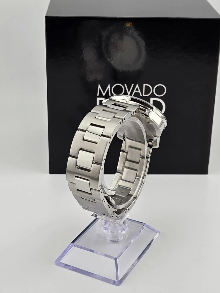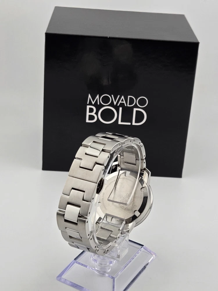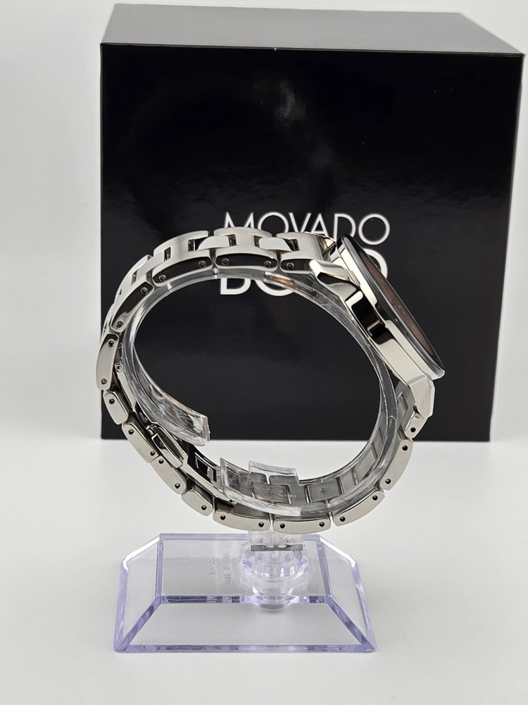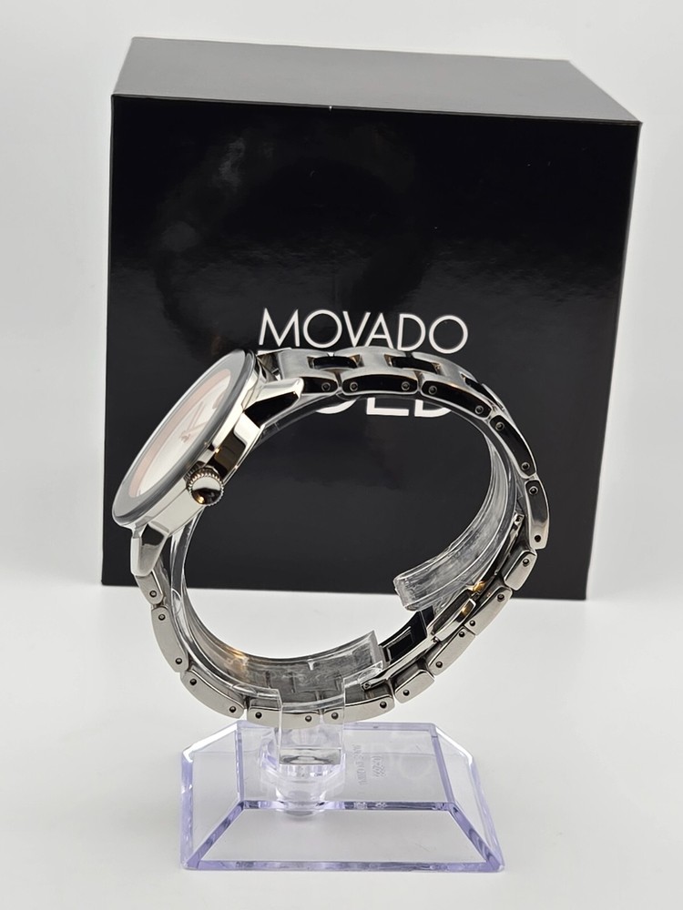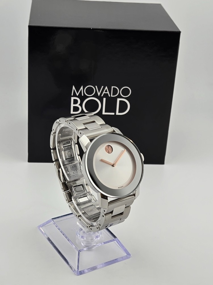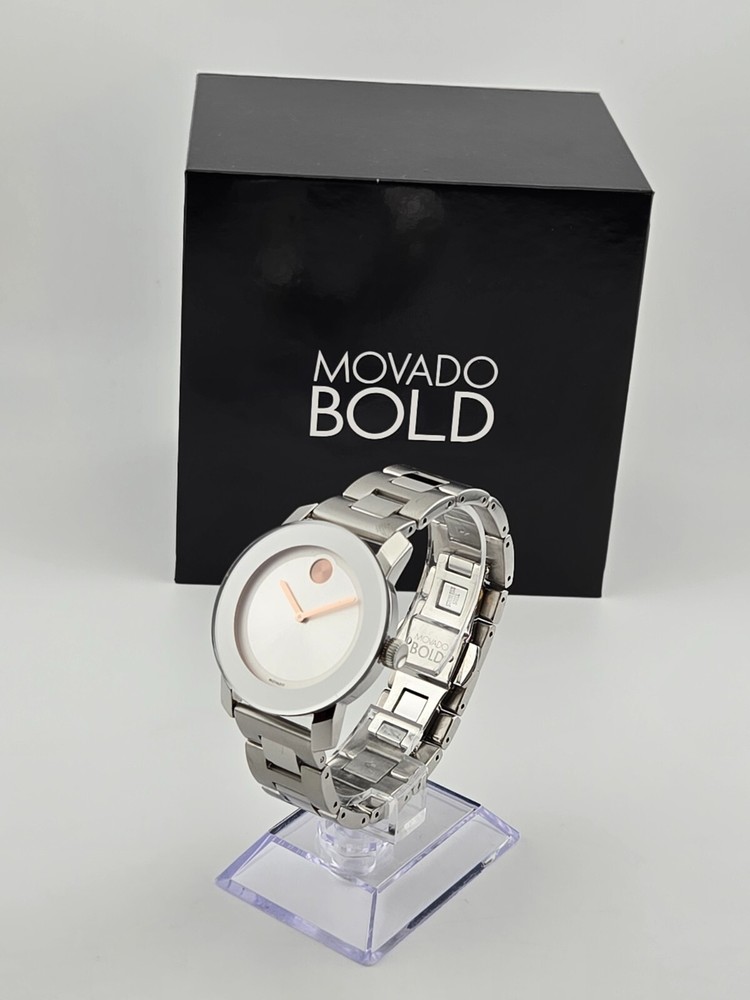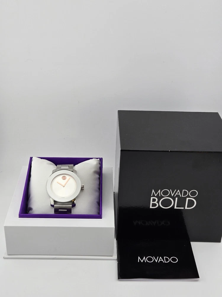 Movado Women's Bold Stainless Steel Silver Dial Swiss Watch 3600084 ($650 MSRP) With Original Box! This watch is a Shelf Pull from one of the Major Department Stores. Watch has scratches on the watch case/band. Note: Watch has a long scratch on the crystal. Introducing the Movado Women's Bold Stainless Steel Silver Dial Swiss Watch, a stunning timepiece that combines modern design with Swiss precision. This watch features a sleek stainless steel bracelet and a striking silver dial, exuding elegance and sophistication. The minimalist design is complemented by the iconic Movado Museum dot at 12 o'clock, symbolizing the sun at high noon. Crafted with precision and attention to detail, the Movado Women's Bold watch is a statement piece that effortlessly elevates any outfit. The Swiss quartz movement ensures accurate timekeeping, while the durable stainless steel construction offers both style and durability. Whether worn for a special occasion or as an everyday accessory, this watch is a versatile and timeless addition to any wardrobe. Make a bold statement with the Movado Women's Bold Stainless Steel Silver Dial Swiss Watch, a timepiece that reflects your impeccable style and sophistication. Elevate your look with this elegant watch that combines modern design with Swiss craftsmanship, showcasing your appreciation for luxury and precision. Features Polished stainless steel case with a stainless steel bracelet. Fixed stainless steel bezel. Silver dial with rose gold-tone hands. No markers. Rose gold-tone Movado dot appears at the 12 o'clock position. Dial Type: Analog. Quartz movement. Scratch resistant mineral crystal. Solid case back. Case diameter: 36 mm. Case thickness: 10 mm. Round case shape. Push button deployment clasp. Functions: hours, minutes. Dress watch style. Watch label: Swiss Made. Fast and Free Shipping You're already purchasing the item. Why pay additional for shipping, especially slow shipping? We get your order shipped out within 1-business day and delivered to your doorstep as quickly as possible. Competitive Pricing With our dynamic pricing model, our prices are always competitive. Our prices are some of the lowest that you will find on the internet. Rest assured that you're getting a good deal when purchasing with us. 30-day Money Back Guarantee We are committed to making sure that you leave this transaction satisfied. If you're unhappy with the product for any reason, you may return it back for your money-back or a replacement within 30 days. No questions asked!