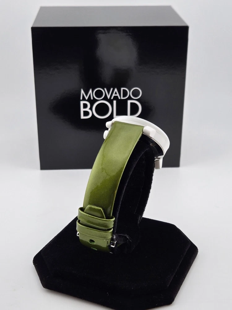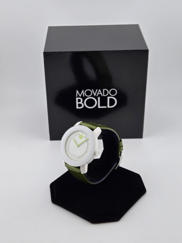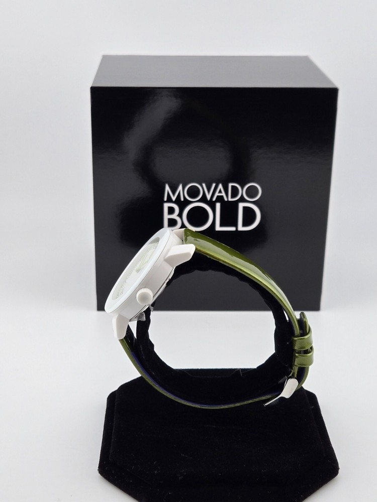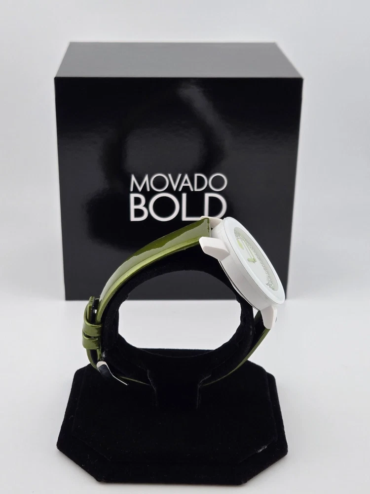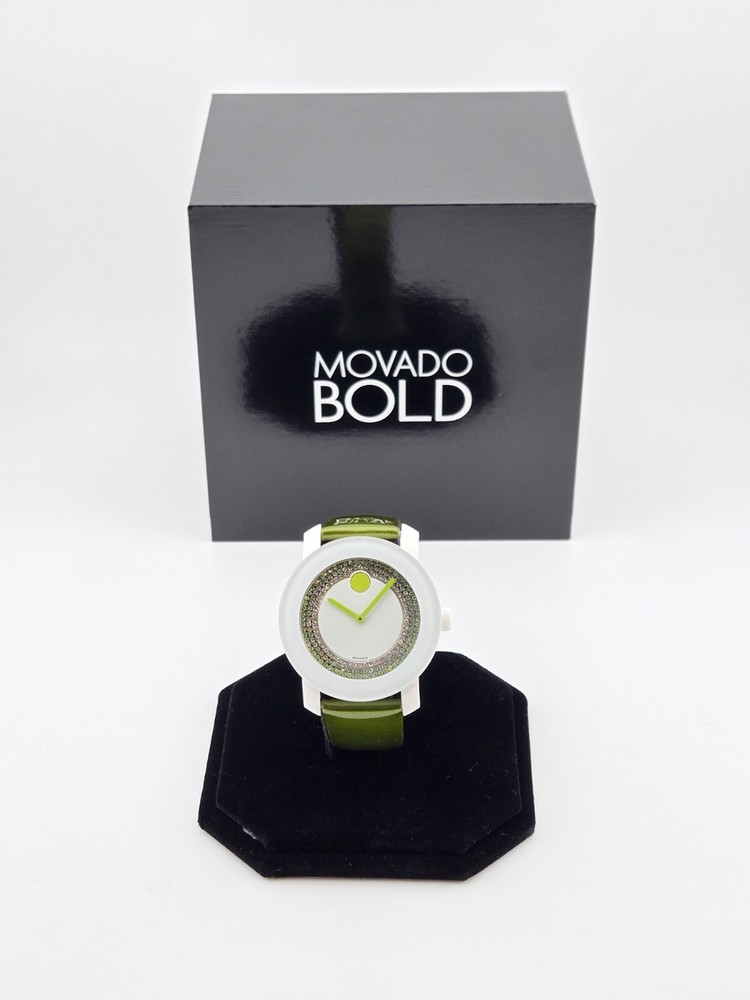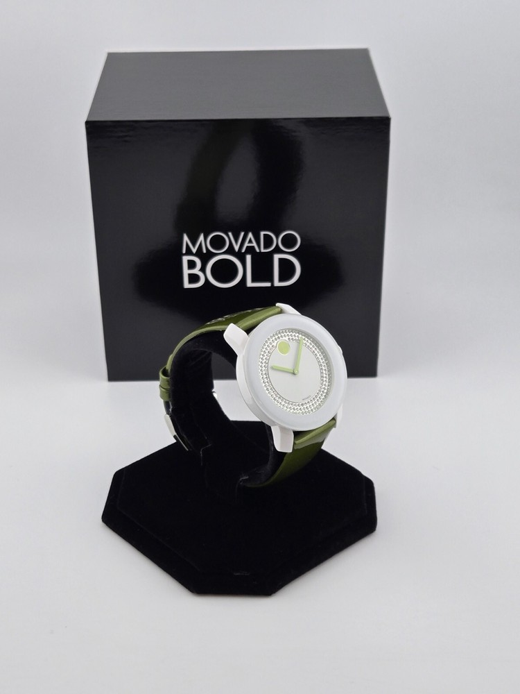 Movado Bold Women's White Crystal Dial Leather Band Watch - 3600316 ($495 MSRP) With Original Box! This watch is a Shelf Pull from one of the Major Department Stores. Watch has scratches on the watch case/band. The Movado Bold Women's White Crystal Dial Leather Band Watch (Model 3600316) effortlessly combines elegance and contemporary style. Featuring a white TR90 composite material and stainless steel case, this timepiece offers both durability and sophistication. The eye-catching light green leather strap complements the white dial, creating a fresh, modern look. At the heart of the design, the dial is adorned with light green pave crystals that catch the light with every movement, while the silver-tone hands provide a sleek contrast, making it easy to tell time at a glance. The watch also includes a fixed bezel and a scratch-resistant K1 crystal, ensuring longevity and clarity. This watch is powered by a reliable quartz movement, offering precise timekeeping and exceptional accuracy. The 36 mm round case fits comfortably on the wrist, making it perfect for both casual and formal occasions. The solid case back and pull/push crown add to the sturdy design, while the water resistance up to 30 meters (100 feet) provides additional practicality for everyday wear. With its combination of classic aesthetics and modern functionality, the Movado Bold watch is the perfect accessory for any woman who values both style and performance. Whether dressing up for a special event or adding a touch of sophistication to a casual outfit, this Movado Bold Women's Watch is sure to turn heads. Its timeless design and high-quality craftsmanship make it a perfect addition to any jewelry collection. The buckle clasp ensures a secure and comfortable fit, while the hour and minute functions keep you on time for every occasion. The Movado Bold 3600316 is a statement piece that reflects a blend of luxury, practicality, and modern style. Features White tr90 composite material and stainless steel case with a green leather strap. Fixed bezel. White with light green pave crystals dial with silver-tone hands. Dial Type: Analog. Quartz movement. Scratch resistant k1 crystal crystal. Pull / push crown. Solid case back. Case size: 36 mm. Round case shape. Buckle clasp. Water resistant at 30 meters / 100 feet. Functions: hour, minute. Fast and Free Shipping You're already purchasing the item. Why pay additional for shipping, especially slow shipping? We get your order shipped out within 1-business day and delivered to your doorstep as quickly as possible. Competitive Pricing With our dynamic pricing model, our prices are always competitive. Our prices are some of the lowest that you will find on the internet. Rest assured that you're getting a good deal when purchasing with us. 30-day Money Back Guarantee We are committed to making sure that you leave this transaction satisfied. If you're unhappy with the product for any reason, you may return it back for your money-back or a replacement within 30 days. No questions asked!