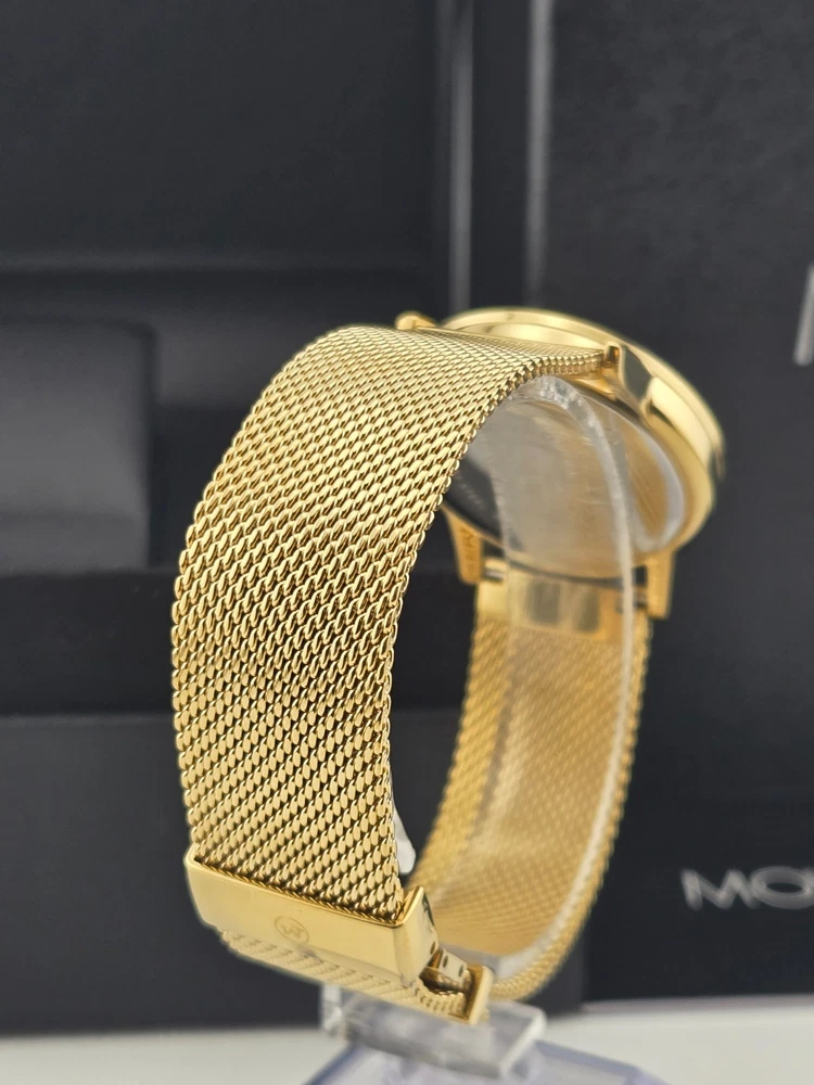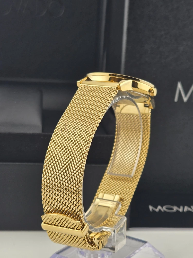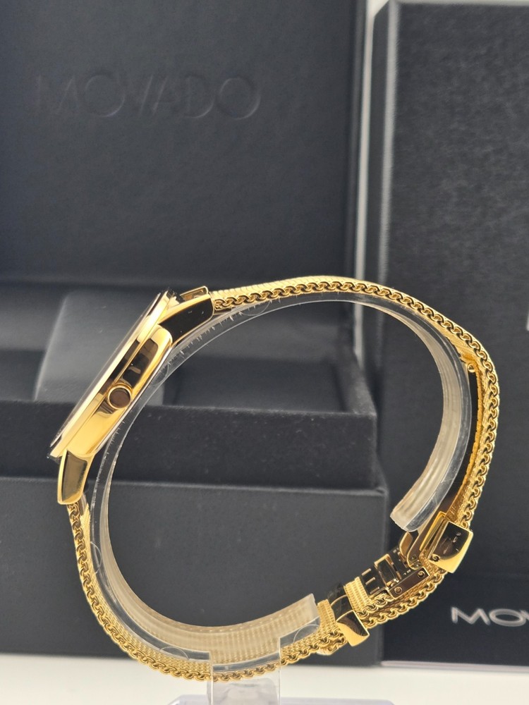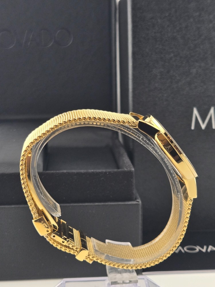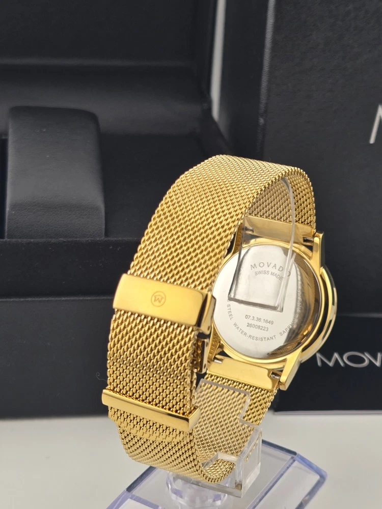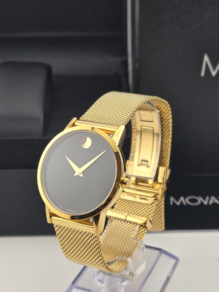 Movado Museum Women's Black Dial Stainless Steel Watch - 0607647 ($995 MSRP) With Original Box! This watch is a Shelf Pull from one of the Major Department Stores. This watch has been professionally refurbished and is in excellent condition with minimal cosmetic imperfections . The **Movado Museum Women's Black Dial Stainless Steel Watch - 0607647** is a refined and minimalist timepiece that captures the essence of Movado’s iconic design. Featuring a 33mm yellow gold-tone stainless steel case and matching bracelet, this watch offers a luxurious, compact silhouette ideal for those who prefer a sleek and understated accessory. The fixed yellow gold-tone bezel frames a deep black dial, elegantly accented with gold-tone hands and the signature Movado dot at 12 o’clock. Powered by a precise quartz movement, this watch provides reliable hour and minute functions, perfect for everyday use or special occasions. The scratch-resistant sapphire crystal protects the dial, ensuring long-lasting clarity and durability. With a pull/push crown and solid case back, the watch is built to maintain its clean, elegant design while offering practical resilience. Secured with a fold-over clasp and safety release, the yellow gold-tone bracelet ensures a comfortable and secure fit. Water-resistant up to 30 meters (100 feet), the **Movado Museum 0607647** is suitable for light water exposure and daily wear. Its classic color combination and timeless design make it a versatile accessory that complements both casual and formal ensembles. Features Yellow gold-tone stainless steel case and bracelet. Fixed yellow gold-tone stainless steel bezel. Black dial with yellow gold-tone hands. Dial Type: Analog. Quartz movement. Scratch resistant sapphire crystal. Pull / push crown. Solid case back. Round case shape, case size: 33 mm. Fold over clasp with a safety release. Water resistant at 30 meters / 100 feet. Functions: hour, minute. Fast and Free Shipping You're already purchasing the item. Why pay additional for shipping, especially slow shipping? We get your order shipped out within 1-business day and delivered to your doorstep as quickly as possible. Competitive Pricing With our dynamic pricing model, our prices are always competitive. Our prices are some of the lowest that you will find on the internet. Rest assured that you're getting a good deal when purchasing with us. 30-day Money Back Guarantee We are committed to making sure that you leave this transaction satisfied. If you're unhappy with the product for any reason, you may return it back for your money-back or a replacement within 30 days. No questions asked!