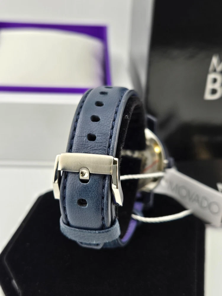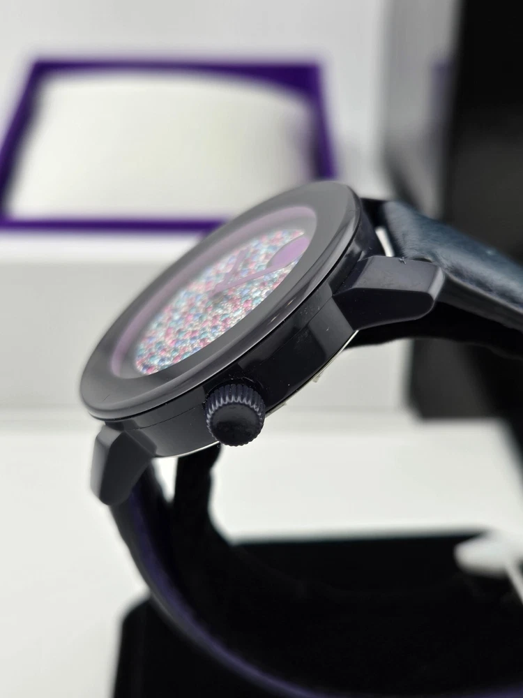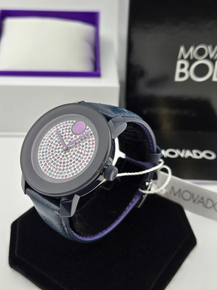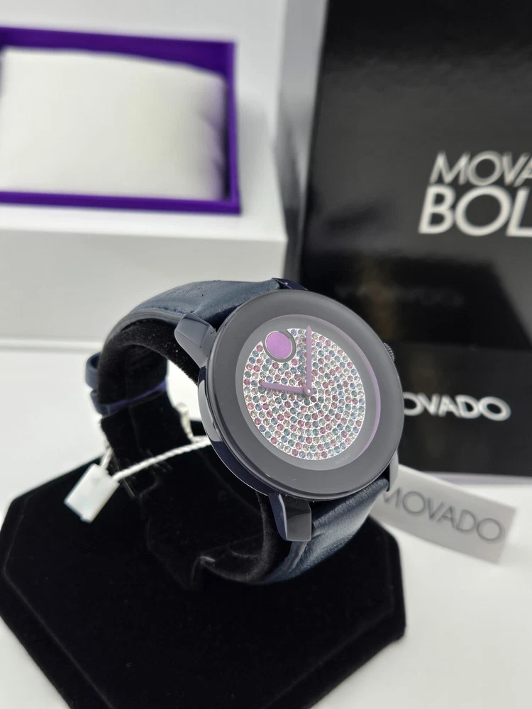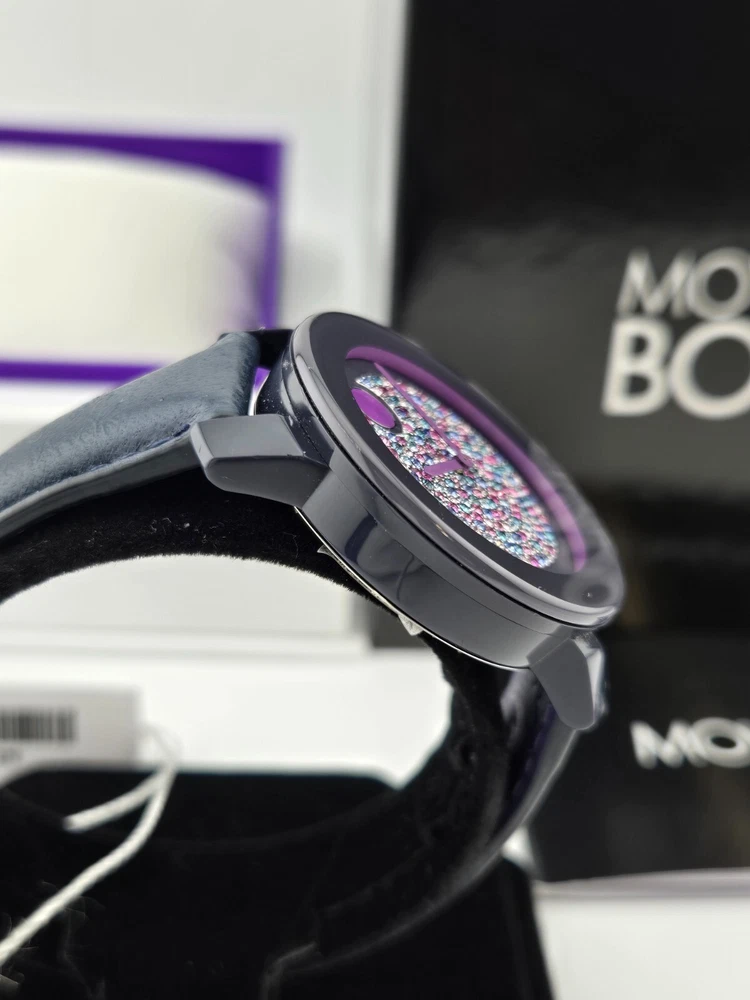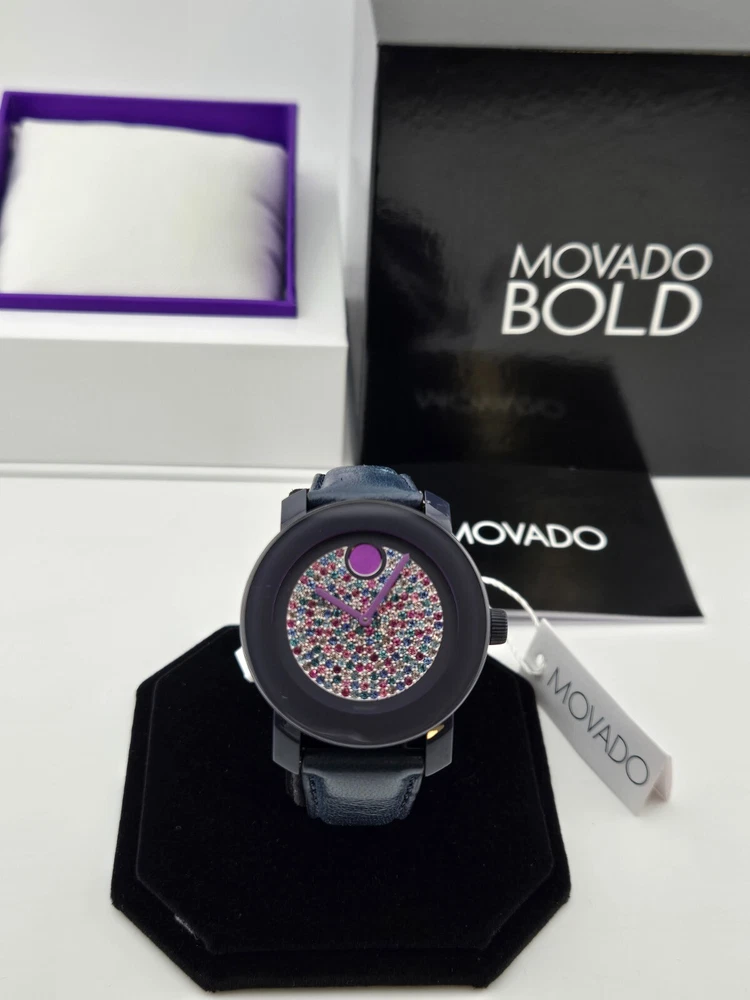 Movado Women's Bold Crystal Dial Leather Band Watch - 3600263 ($550 MSRP) With Original Box and Tags! This watch is a Shelf Pull from one of the Major Department Stores. Watch has micro scratches on the watch case/band, visible under direct light. The Movado Women's Bold Crystal Dial Leather Band Watch (Model 3600263) combines modern sophistication with a touch of playful elegance. Featuring a striking blue ion-plated stainless steel case, this watch exudes a refined yet bold aesthetic. The watch’s blue leather strap offers a luxurious contrast, and the fixed TR90 composite bezel enhances its sleek profile. The standout design element is the mesmerizing blue-to-lavender pave crystal dial, complemented by graceful purple hands and the signature Movado dot at the 12 o’clock position. With no traditional hour markers, the dial achieves a minimalist yet captivating look, making it the perfect accessory for both casual and formal occasions. Crafted with a quartz movement, this timepiece ensures precise timekeeping, while the scratch-resistant K1 crystal provides durability and clarity. The round 36mm case size strikes an ideal balance between statement-making presence and wearability, offering a comfortable fit for most wrists. The solid case back and pull/push crown design contribute to the watch’s sleek, refined construction. This timepiece is water-resistant up to 30 meters (100 feet), making it suitable for everyday wear and light splashes of water, adding practicality to its high-end appeal. A true testament to Movado's commitment to quality and design, the Women's Bold Crystal Dial Watch offers both style and functionality. Its simple yet elegant dial, paired with the smooth leather strap, makes it a timeless addition to any collection. Whether you’re dressing up for an evening out or adding a unique touch to your daily ensemble, this watch is sure to impress with its understated luxury and contemporary flair. Features Black ion-plated stainless steel case with a blue leather strap. Fixed TR90 composite bezel. Blue to lavender pave crystal dial with purple hands. No markers. The Movado dot appears at the 12 o'clock position. Dial Type: Analog. Quartz movement. Scratch resistant K1 crystal. Pull / push crown. Solid case back. Case diameter: 36 mm. Round case shape. Tang clasp. Water resistant at 30 meters / 100 feet. Functions: hour, minute. Fast and Free Shipping You're already purchasing the item. Why pay additional for shipping, especially slow shipping? We get your order shipped out within 1-business day and delivered to your doorstep as quickly as possible. Competitive Pricing With our dynamic pricing model, our prices are always competitive. Our prices are some of the lowest that you will find on the internet. Rest assured that you're getting a good deal when purchasing with us. 30-day Money Back Guarantee We are committed to making sure that you leave this transaction satisfied. If you're unhappy with the product for any reason, you may return it back for your money-back or a replacement within 30 days. No questions asked!