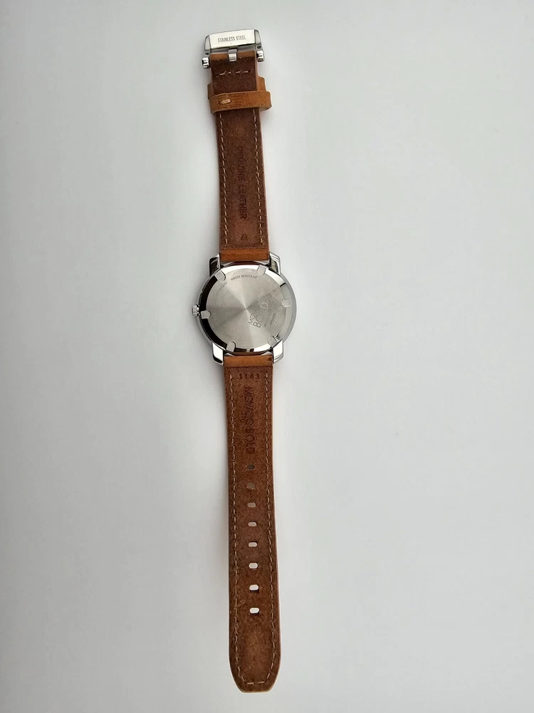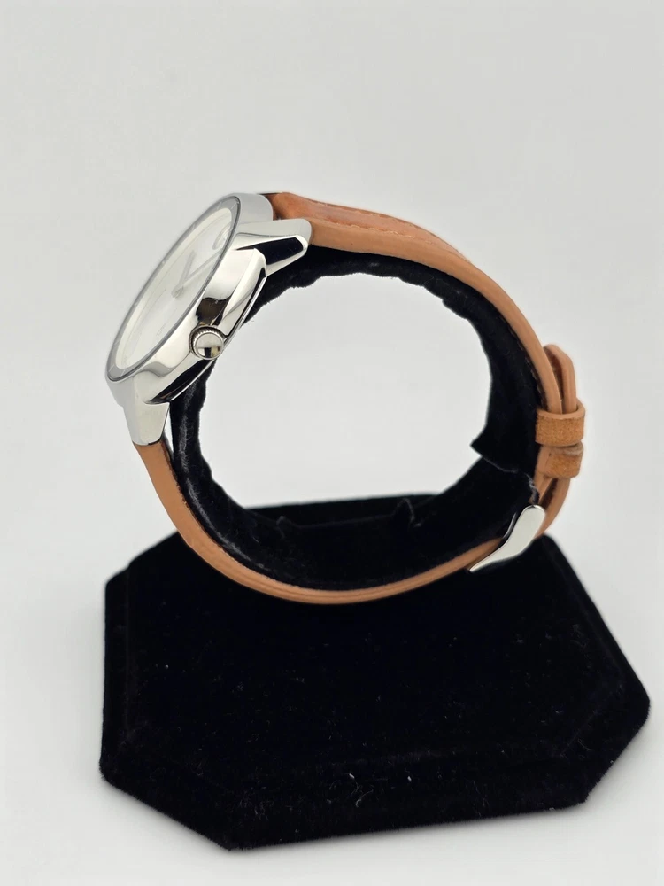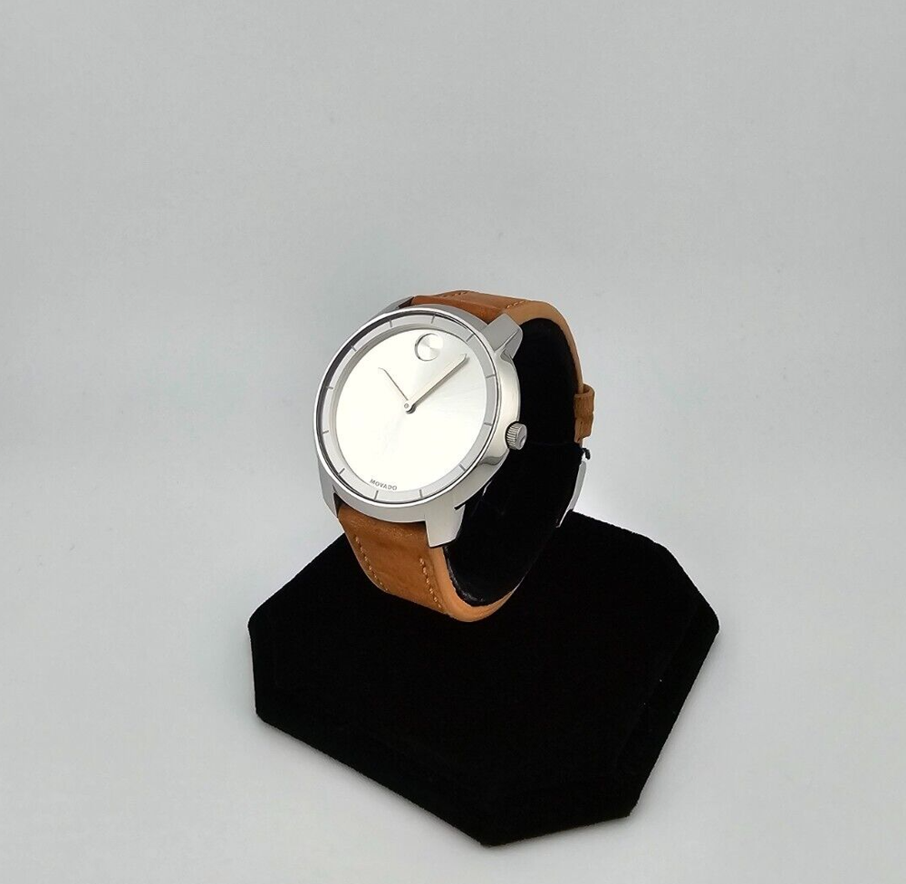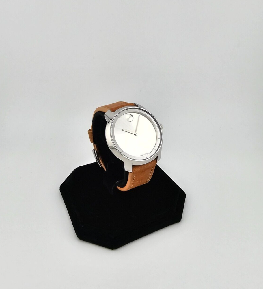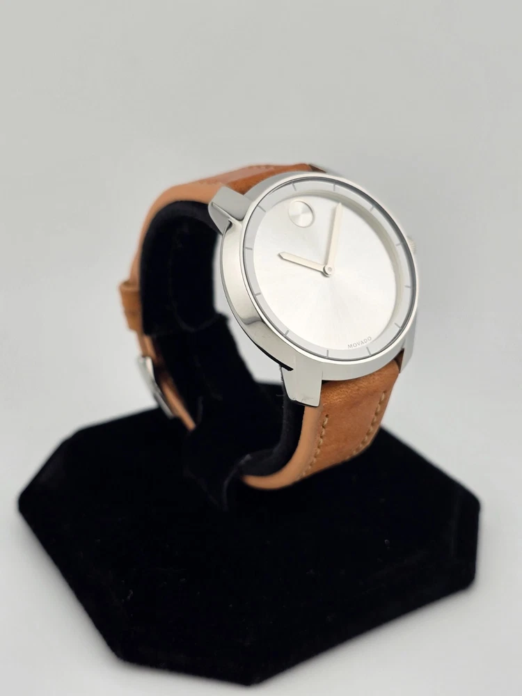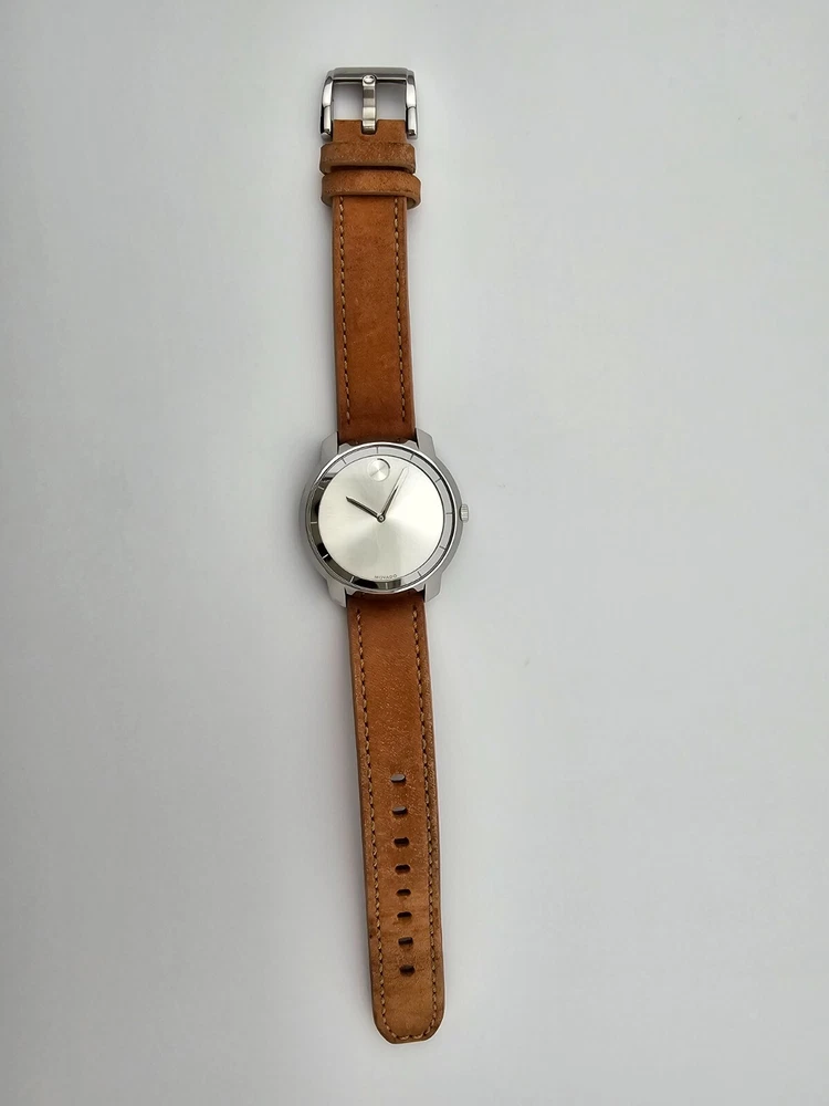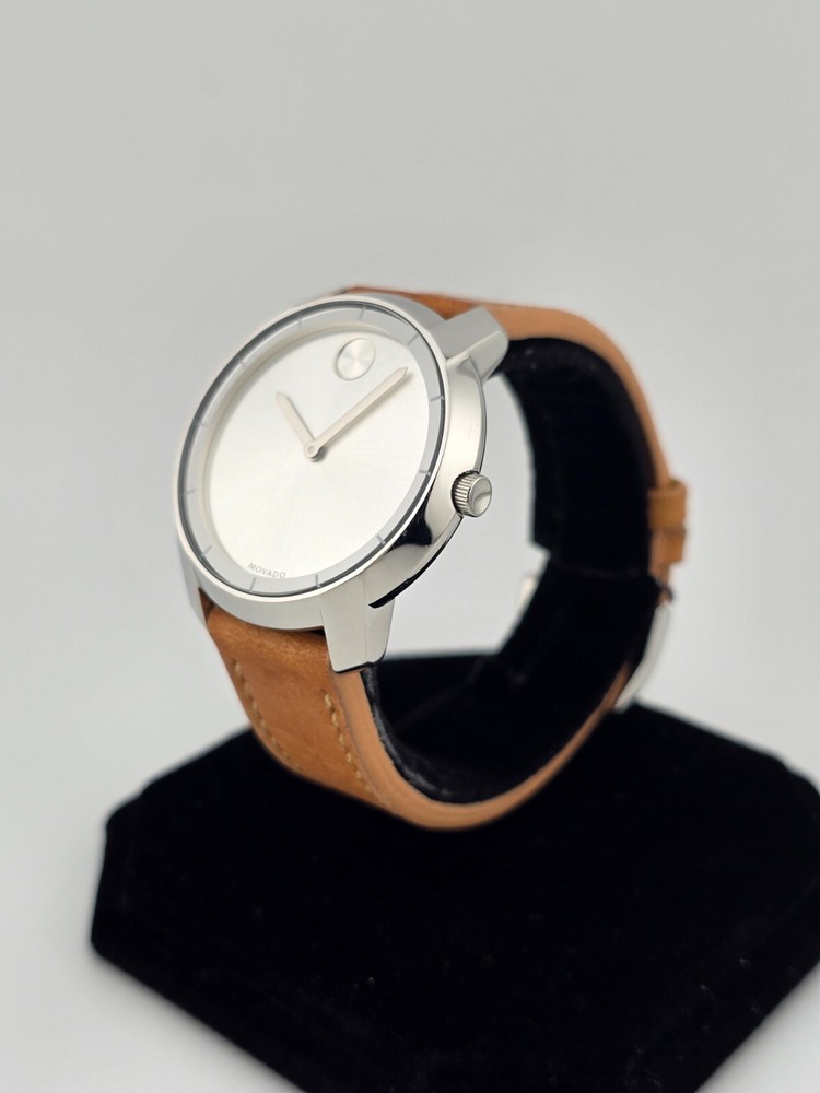 Case Color: Silver Dial Color: Silver Case Finish: Polished Lug Width: 17 mm Model: Movado Bold Display: Analog With Papers: No Movement: Quartz Case Thickness: 9 mm Band Material: Leather Band/Strap: Buckle Band Watch Shape: Round Features: 12-Hour Dial, Swiss Made, Swiss Movement Case Material: Stainless steel Caseback: Snap Brand: Movado Department: Women Reference Number: 3600473 UPC: 885997234603 Water Resistance: 30 m (3 ATM) Type: Wristwatch Band Color: Brown Bezel Color: Silver Case Size: 36 mm Band Width: 17 mm Style: Casual, Classic, Luxury gtin13: 885997234603 Country/Region of Manufacture: Switzerland