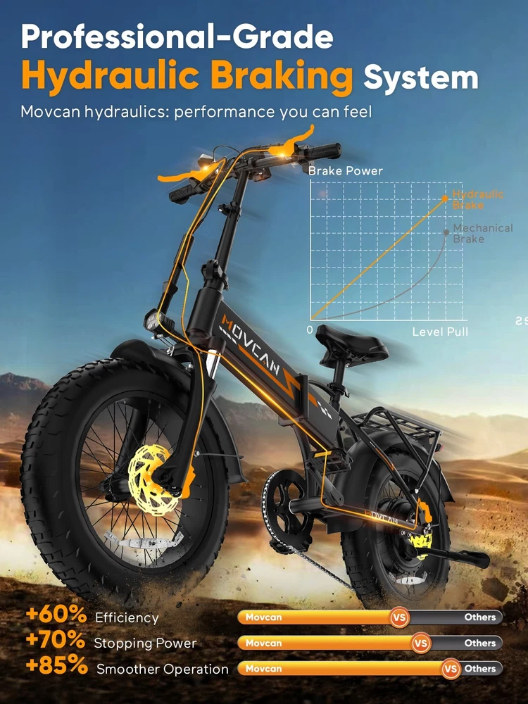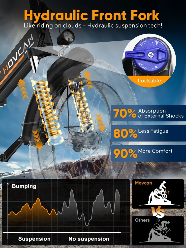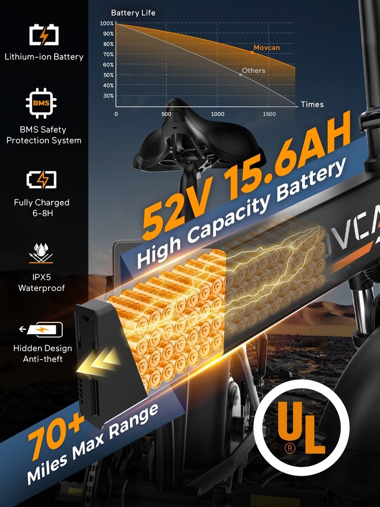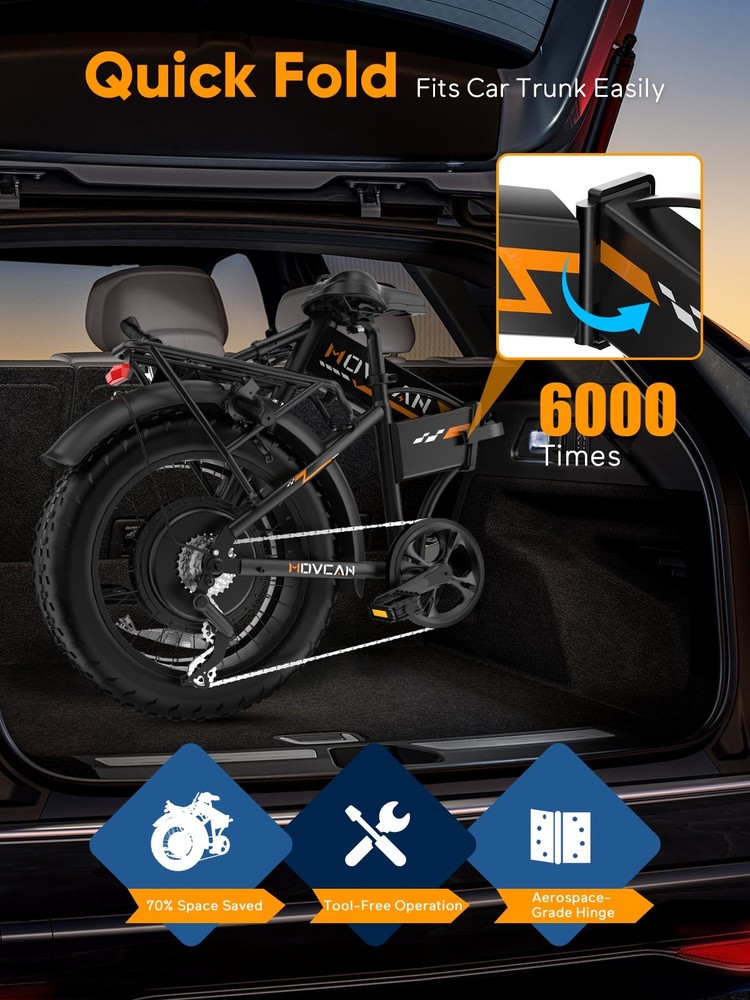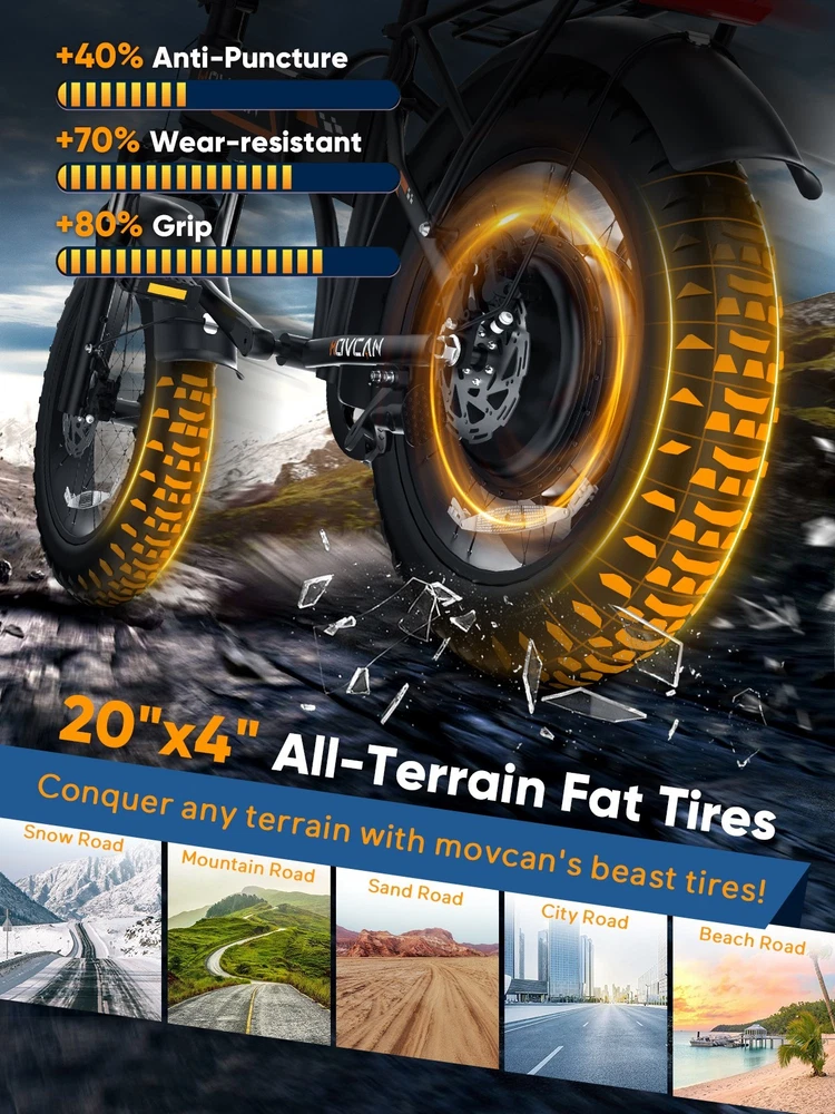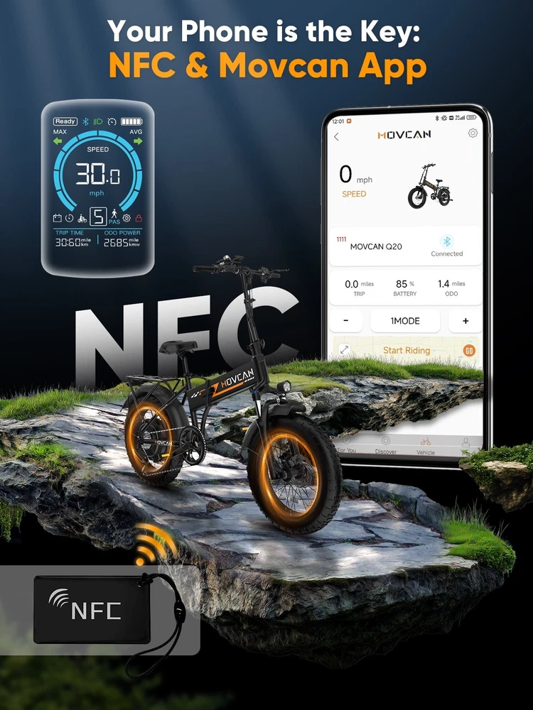 🏍 Conquer All Terrains! Movcan Q20 Basic Information: Brand: movcan Theme: ‎Motorcycle Age Range (Description): Adult Recommended Use: Off-road Bicycle Type: Mountain Bike Style: Q20 Color: Black, Green, White, Rose Warranty Type: Extended Maximum Weight Recommendation: 330 Pounds Assembly Required: Yes Bicycle Gear Shifter Type: Trigger Number of Handles: 2 Skill Level: Intermediate Size: ‎66*26.5*47.2inch Bike Weight:77lb Warranty Description:1 Year Warranty for the Most Parts and 6 Months for Battery, Brake and Tire Technical Details: Seat Material Type: Leather Gear Shift: 5 Speed Level (Default PAS) Pedal Assist: 7 Speed (Work with PAS) Speed: Up to 30MPH Range: Up to 30 Miles per Charge (Pure Electric), 70 Miles per Charge (PAS Mode) Motor: 1500W Battery:52V 15.6Ah Removable Battery Charging Time: 6 Hour Tires: 20"x4" All-Terrain Fat Tire Frame Material: Alloy Steel Material:‎Carbon Steel Wheel Material:Aluminum Suspension Type: Dual Special Feature: ‎ Dual Suspension, Dual Battery, Hydraulic Brakes,LCD Display Included Components: ‎Tool Kit,Phone Holder,Air Pump,Password Lock Brake: Double Hydraulic Brake Package Content: 1 x Electric Bicycle 1 x Removable Lithium-Ion Battery 1 x Charger 1 x Tool Kit 1 x Instruction 1 x Accessories Kit 【1500W Motor & 52V 15.6Ah Removable Battery for Extended Rides】The Movcan Q20 electric bike for adults integrates a 1500W brushless motor capable of reaching 30MPH with stable acceleration. Powered by a 52V 15.6Ah lithium-ion battery, it delivers 40 miles per charge in pedal-assist mode. The removable hidden battery allows flexible charging at home, office, or public stations. As a foldable electric bike, it maintains robust performance for daily commutes while optimizing energy efficiency 【Space-Optimized Folding Design for Urban Mobility】Engineered for practicality, the Movcan Q20 folding electric bike features a reinforced hinge mechanism that folds in 20 seconds. The compact footprint fits standard car trunks, apartment closets, and public transit storage areas. Ideal for commuters transitioning between trains, buses, and offices, this folding ebike reduces parking costs while maintaining full-sized bike stability. Practical storage solutions included in the design 【20"x4" Multi-Surface Tires & NFC-Enabled Display】Equipped with 20"x4" fat tires, the Movcan Q20 fat tire electric bike for adults provides reliable traction on pavement, packed trails, and wet surfaces. The tread pattern minimizes rolling resistance while preventing debris buildup. A waterproof LCD display shows real-time speed, battery percentage, and distance traveled. NFC card authentication adds theft deterrence. Suitable for year-round commuting in rain or light snow 【Adjustable Front Suspension & Hydraulic Disc Brakes】The Movcan Q20 electric bike incorporates a travel suspension fork with preload adjustment to absorb urban potholes and curb impacts. Hydraulic dual brakes reduce braking distance by 50% in wet conditions, which greatly reduces bumps during riding and improves riding stability and ensures your safety when enjoying the speed.This folding electric bike prioritizes control during sudden stops or downhill rides 【5 Riding Modes & 7-Speed Gearing】Customize your ride with the Movcan Q20 electric bike! Choose from 5 modes—Pure Electric, PAS, Cruise, Walk, and Bike—to match your terrain and mood. The professional 7-speed transmission adapts seamlessly to urban commutes or mountain trails. This movcan electric bike adapts to diverse scenarios – from crowded downtown streets to park pathways 【90% Pre-Assembled & 12-Month Warranty for Hassle-Free Setup】Get rolling in minutes! The Q20 ebike arrives 90% pre-assembled, with video tutorials and tools included for quick setup. Backed by a 12-month warranty, the Movcan Q20 folding electric bike for adults comes with 24/7 customer support. Pro tip: Please reserve the original package for some time in case of any issues of return. Whether you're a beginner or a pro, this movcan electric bike is designed for effortless ownership Note: Our products have been certified under UL2849 safety standards.