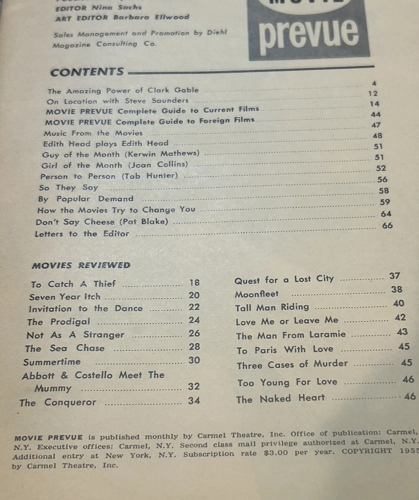 This vintage issue of Movie Prevue from 1956 features iconic stars like Clark Gable, Marilyn Monroe, and Joan Collins. With a focus on celebrity, movies, and lifestyle, this monthly publication is a must-have for fans of classic Hollywood. The English language magazine is filled with captivating articles and stunning photography, making it a great addition to any collection. Published by Carmel Theater Inc, this issue is a piece of history that offers a glimpse into the glamour of Hollywood's golden age.
