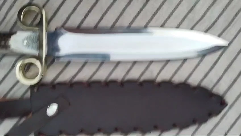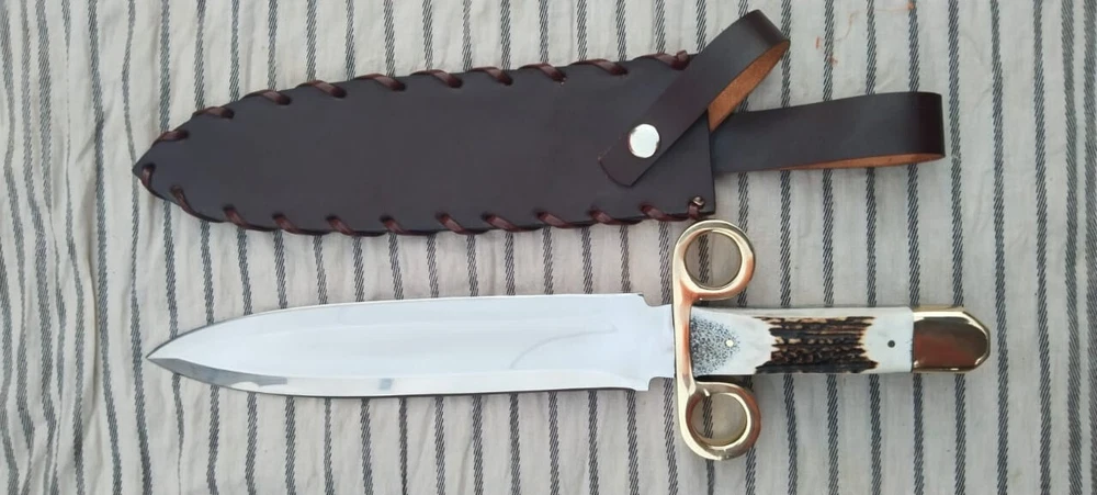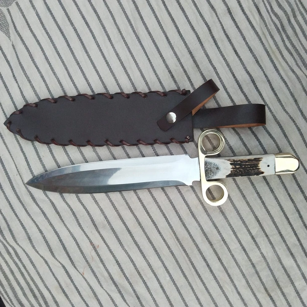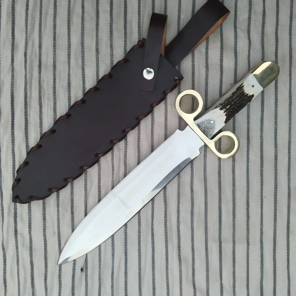 Tombstone Double Ring Guard Dagger Knife: Ike/Billy Clanton Movie Replica – Custom Handmade with 1095 Carbon Steel Blade and Real Stag Antler Handle Materials and Craftsmanship: Blade Material: 1095 Carbon Steel The blade of this Dagger knife is forged from 1095 carbon steel, a material renowned for its strength, durability, and edge retention. 1095 carbon steel is a high-carbon alloy that provides excellent hardness and sharpness, making it ideal for demanding tasks. The blade's construction ensures that it holds a razor-sharp edge, even with extended use. It is resistant to chipping and cracking, which makes it suitable for both practical use and display. The blade is meticulously hand-ground and polished to achieve a rugged yet refined finish. The high-carbon content of 1095 steel contributes to its toughness, while the careful forging process enhances its overall performance. This results in a blade that not only performs exceptionally well but also showcases a classic, historical aesthetic. Handle Material: Real Stag Antler with Brass double Ring Guard The handle of the Tombstone Dager Knife is crafted from genuine stag antler, chosen for its unique appearance and natural durability. Each stag antler handle is hand-selected for its quality and distinctiveness, ensuring that every knife is a one-of-a-kind piece. The antler handle is contoured to provide a comfortable and secure grip, enhancing the knife's usability during extended use. The handle is further enhanced with a brass double ring guard, which adds a touch of authenticity and historical flair. The ring guard is a key feature that harks back to the design of the Old West, providing both functional protection and a distinctive visual element. The brass ring guard helps prevent hand slippage onto the blade, adding an extra layer of safety during use. Dimensions and Measurements: - Overall Length: Approximately 14.75 inches - Blade Length: Approximately 10 inches - Handle Length: Approximately 4.75 inches The 14.75-inch overall length provides a balanced and substantial feel, making the knife versatile for various applications. The 10-inch blade offers ample cutting surface for tasks ranging from hunting and survival to tactical scenarios. The 4.75-inch handle length ensures a comfortable grip, allowing for precise control and effective handling. Leather Sheath: Each Tombstone Double Ring Guard Bowie Knife comes with a premium leather sheath, designed to protect the blade and enhance its portability. The sheath is crafted from high-quality leather, ensuring durability and a secure fit for the knife. It features a classic design with a belt loop or strap, allowing for easy carrying during outdoor activities or while on the go. The leather sheath not only provides practical protection but also complements the knife’s aesthetic, adding to its overall presentation. Over time, the leather will develop a unique patina, further enhancing the knife's character and showcasing its artisanal quality. Gift Options: The Tombstone Ring Guard Bowie Knife makes an exceptional gift for any occasion. Its combination of historical significance, high-quality materials, and craftsmanship makes it a memorable and valuable present. Gift wrapping is available upon request, ensuring that your gift is presented beautifully and ready for any celebration. This knife is perfect for: - Collectors: A must-have addition to any collection, especially for fans of Western history and cinema. - Movie Props: An authentic replica that captures the essence of the Old West and the iconic film Tombstone. - Christmas Gifts: A unique and thoughtful gift for movie enthusiasts and history buffs. - Personalized Gifts: A special present that can be personalized for a unique touch. - Gifts for Him: Ideal for men who appreciate quality craftsmanship and historical replicas. - Anniversary and Wedding Gifts: A meaningful and timeless gift to commemorate special occasions. - Outdoor and Survival Enthusiasts: A practical tool for those who enjoy hunting, camping, and tactical activities. - Groomsmen Gifts: A distinctive and memorable gift for groomsmen, celebrating a significant event. Care Instructions: To ensure the longevity and performance of your Bowie knife, follow these care instructions: 1. Lubricate the Blade: Apply a light coat of oil to the blade after each use to prevent rust and maintain its sharpness. 2. Keep Dry and Clean: Ensure the knife is kept clean and dry to avoid contamination and rust. 3. Hand Wash Only: Do not wash the knife in a dishwasher. Instead, hand wash it with mild soap and water. 4. Avoid Abrasive Cleaning: Refrain from using steel wool or abrasive sponges, as they can damage the blade. 5. Blade Cleaning: When cleaning, wipe and rub the blade in the direction of the Damascus patterns to preserve their integrity. Conclusion: The Tombstone Ring Guard DaggerKnife is a masterful blend of historical homage and practical craftsmanship. With its 1095 carbon steel blade, genuine stag antler handle, and brass ring guard, it stands as a tribute to the Old West and the classic film Tombstone. Whether for personal use, as a collectible, or as a special gift, this knife offers both exceptional functionality and striking visual appeal. Order yours today to own a piece of Western history and experience the exceptional quality and craftsmanship of this unique Bowie knife.