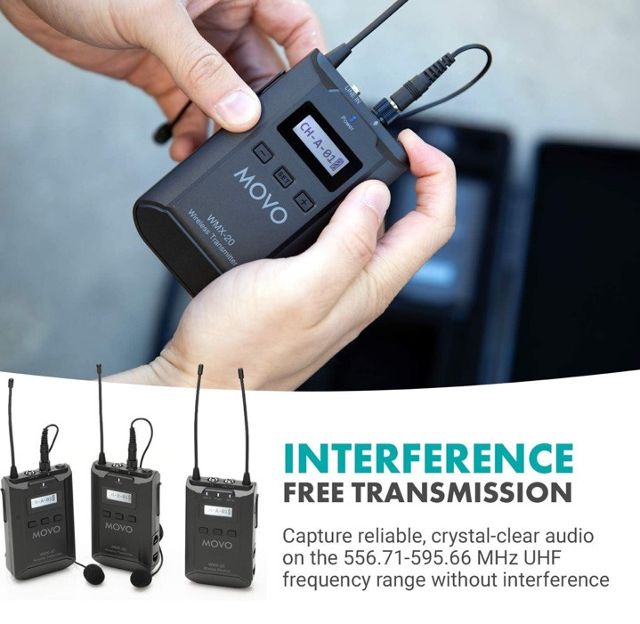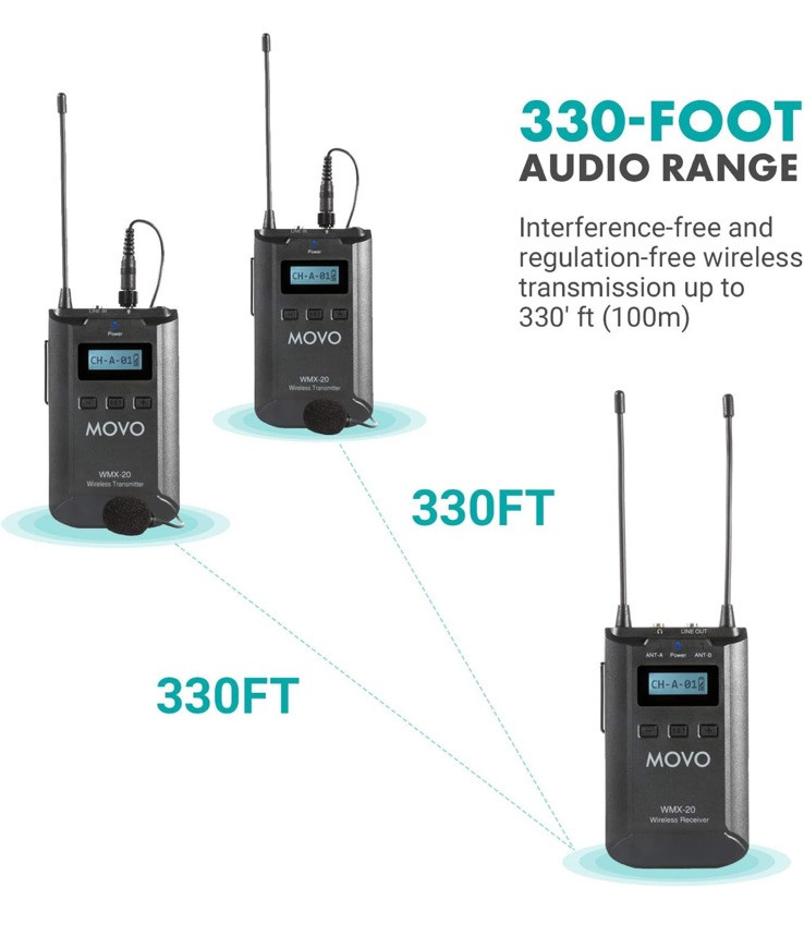 Brand Movo Model Name WMX-20-DUO Connectivity Technology Auxiliary, XLR Connector Type 3.5mm or XLR Special Feature Adjustable gain, back-lit LCD display, split mono channels or stereo output modes, mic & line-in inputs, headphone monitoring output, mute button, LCD control lock, each unit operates on 2 "AA" batteries for up to 6-hours of run-timeAdjustable gain, back-lit LCD display, split mono channels or stereo output modes, mic & line-in inputs, headphone m… See more HIGH-GRADE QUALITY: Capture professional audio with ease and universal functionality. Fully compatible with DSLRs, camcorders, smartphones/tablets and other recorders. Ideal for filmmakers, broadcasters, and vloggers. TECHNICALLY VERSATILE: Optimal for both live sound and recording. Dynamic range that picks up a wide frequency spectrum (35 Hz to 18 kHz) with a distance of up to 330’. Operates on UHF spectrum in 2 groups of 48 channels (up to 96 unique frequencies). USER-FRIENDLY: Setup your mic in minutes. Lightweight, portable, and easy-to-use interface makes it accessible for the hobbyist or the seasoned pro. Runs on AA batteries (up to 6 hours of run-time).