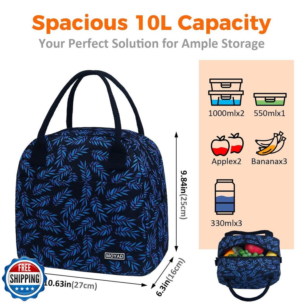 Moyad Insulated Lunch Bag for Women, Lunch Cooler Bag Thermal Lunch Tote for Adult for Work, Travel, Picnic, Blue Acacia Pennata and Black Features SPACIOUS AND VERSATILE - Maximize your mealtime with our spacious lunch bag, measuring 10.63" × 6.3" × 9.84" with a generous 10L capacity. It's perfect for packing everything from 12 cans of soda to a full lunch spread including sandwiches, salads, and fruits. Whether you're heading to the office, the beach, or on a road trip, it’s your go-to for stylishly carrying all your essentials. SUPERIOR TEMPERATURE RETENTION - Enjoy meals just the way you like them with our Moyad lunch bag's advanced 5-layer thermal insulation. Made from durable, waterproof materials and featuring an easy-to-clean aluminum foil lining, it keeps your food cold or warm for hours. Relish in the fresh taste of your meals, preserved perfectly for whenever you're ready. MULTI-FUNCTIONAL CONVENIENCE - Our lunch bag doubles as your everyday essential, offering a convenient front pocket for utensils, keys, and more. It transitions seamlessly from a cooler to a shopping bag, picnic bag, or even a chic makeup bag, providing versatility for every part of your day. ENHANCED DURABILITY & SMOOTH FUNCTIONALITY - Our lunch bag boasts a seamless top zip closure that effortlessly slides, guaranteeing a snag-free experience. Expertly constructed with a focus on long-term use, it features sturdy dual handles for unmatched reliability. STYLISH GIFT CHOICE - Elevate your gifting game with a Moyad lunch bag, featuring a delightful design and modern charm. It's a unique gift that combines elegance and functionality, making it a perfect match for anyone looking to make a stylish statement. Shipping Free & Fast Shipping: We offer free shipping to most of the USA with a normal delivery time of 3-7 days. However, due to the current situation, additional delivery time (up to 3 weeks) may be required for some items. Alternative Carriers: We may use alternative carriers (e.g., USPS, FedEx, UPS) to ensure your package arrives safely and on time. Due to the use of multiple carriers, we are unable to provide a tracking number automatically. Handling Time: Orders are processed and shipped within 1-2 business days of receiving cleared payment. Shipping Restrictions: Shipping to Alaska, Hawaii, Puerto Rico, Guam, and other US territories may incur shipping charges or delivery restrictions. Please contact us before ordering, or your order can be refunded/cancelled. State Restrictions: Certain items may not be shipped to California due to state regulations. Contact for Tracking Updates: If you require tracking updates or have any concerns about the delivery of your order, please feel free to contact us, and we will be happy to assist you. Return Policy 30-Day Hassle-Free Returns: If you are not completely satisfied with your purchase, you can return the item for free within 30 days of receiving it for a full refund or exchange. Easy Return Process: Contact us, and we will provide you with a prepaid return shipping label and detailed instructions. No Restocking Fee: There are no restocking fees for returns. However, the buyer is responsible for return shipping costs if the return is not due to a seller"s error. Refund Processing: Refunds will be processed within 1 business day of receiving the returned item in its original condition. Feedback Your feedback is extremely important to us. We strive to provide the best products and customer service possible. If you are satisfied with your purchase, please take a moment to leave us a positive review. If you have any concerns or issues with your order, please contact us before leaving negative feedback. We are committed to resolving any problems and ensuring your satisfaction. Contact Us If you have any questions or concerns, please feel free to reach out to our customer support team. You can contact us through the eBay messaging system. We are available Monday to Friday, 9:00 am to 5:00 pm EST, and we will do our best to respond to your inquiry within 24 hours. Thank you for supporting our small family business!