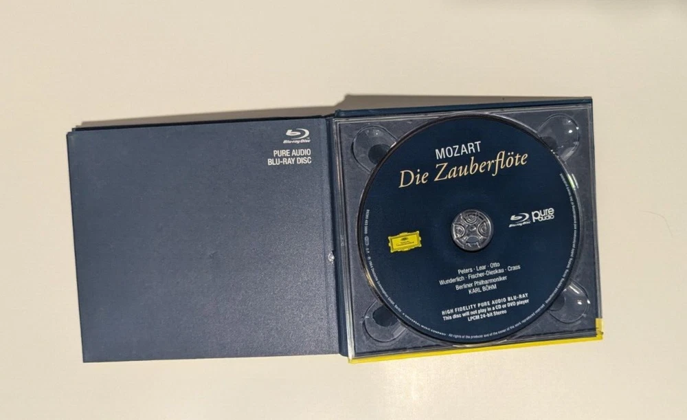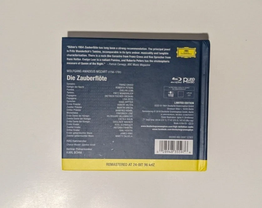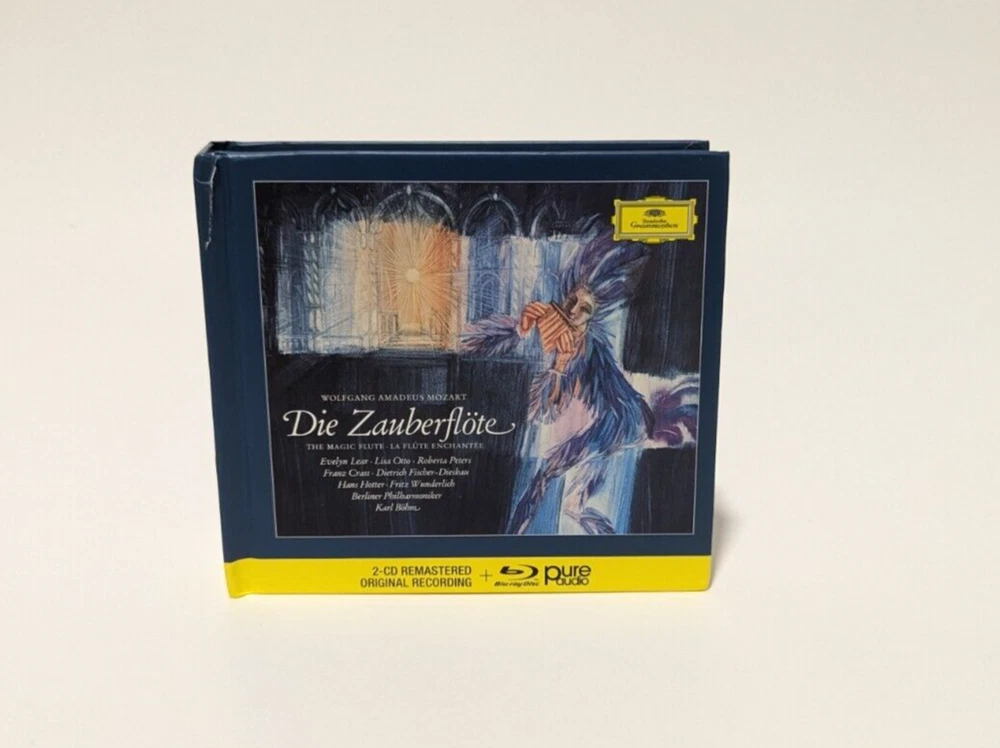 Experience the enchanting world of Mozart's "Die Zauberflote" with this deluxe 2 CD and Blu-ray remastered edition. Immerse yourself in the meticulously restored audio quality, bringing the magic and clarity of this classical masterpiece directly to your home theater system. The collection features the iconic opera in a format that does not compromise on fidelity and enjoyment.This set is a must-have for aficionados of Mozart's work and collectors alike. The remastered tracks offer a fresh listening experience, capturing the essence of the opera's enchanting melodies and complex arrangements. With its elegant presentation and high-fidelity audio, this edition promises to be a jewel in any classical music library. It is brand new never used but the box has small rip in the top corner visible on the 1st picture.