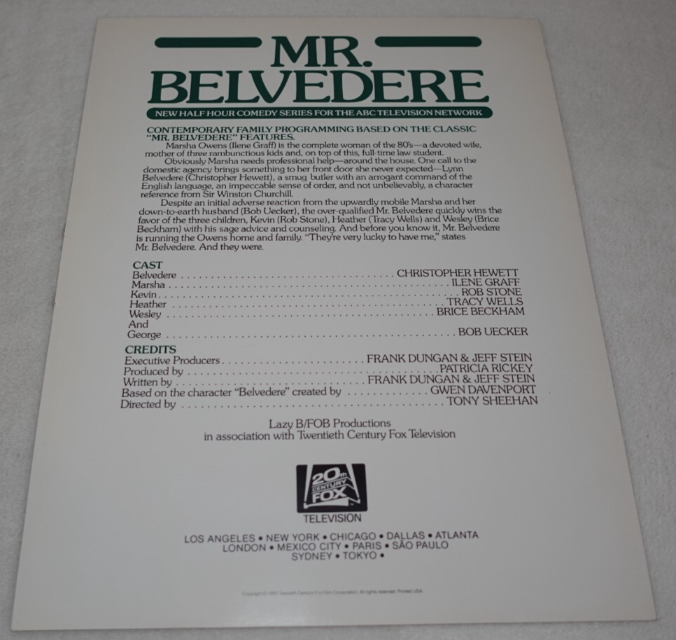 Mr. Belvedere A New Comedy Series 1985 ABC TV Rare Original Promotional Ad Measures approximately 8 1/2" x 11". 1 Page (front/back). Item has dinged edges and corners, surface scratches and scuffs, creasing and age discoloration from handling and storage. Please see photos for more information on condition and ask any questions you may have.