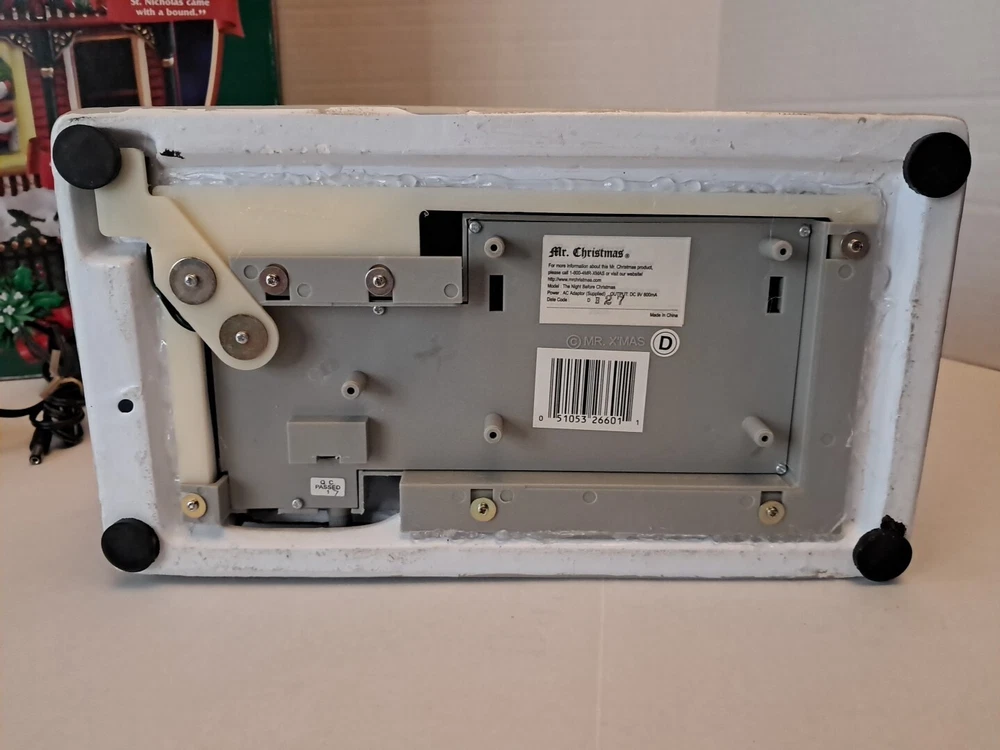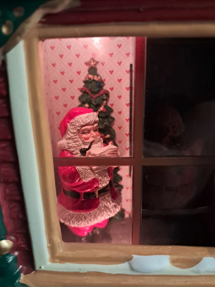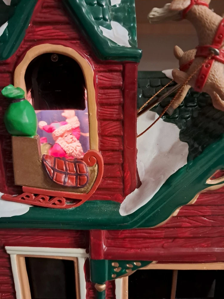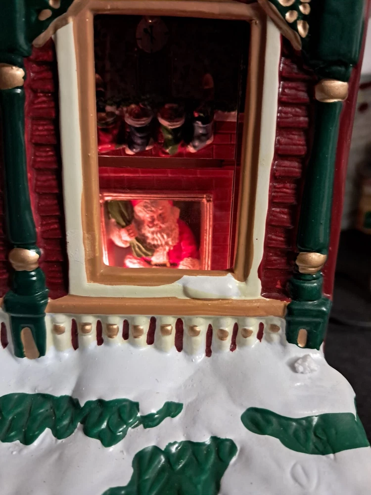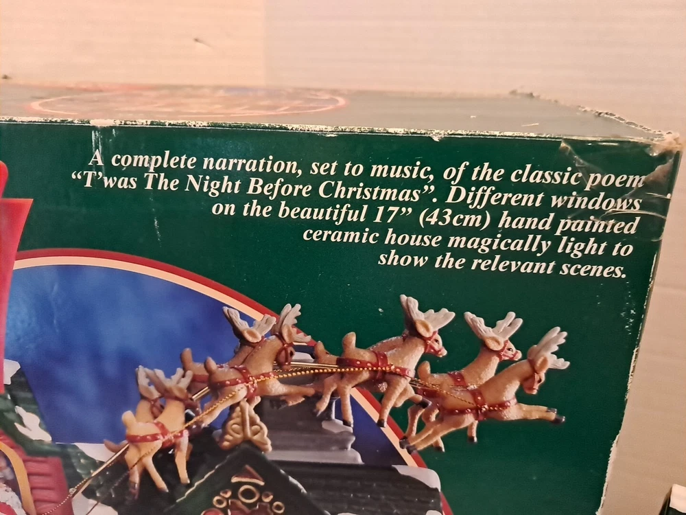 Mr. Christmas The Night Before Christmas Light Up Story-Telling House Works Smoke free pet free home No chips or cracks detected The lead reindeer was broken off the metal harness and I made a new harness for this one reindeer (see photos) The start button has some wear The story must play all the way through before restarting and takes about 15 seconds to start the story after pressing start button. Different windows light up corresponding to the story as it is being told. Box shows wear from storage