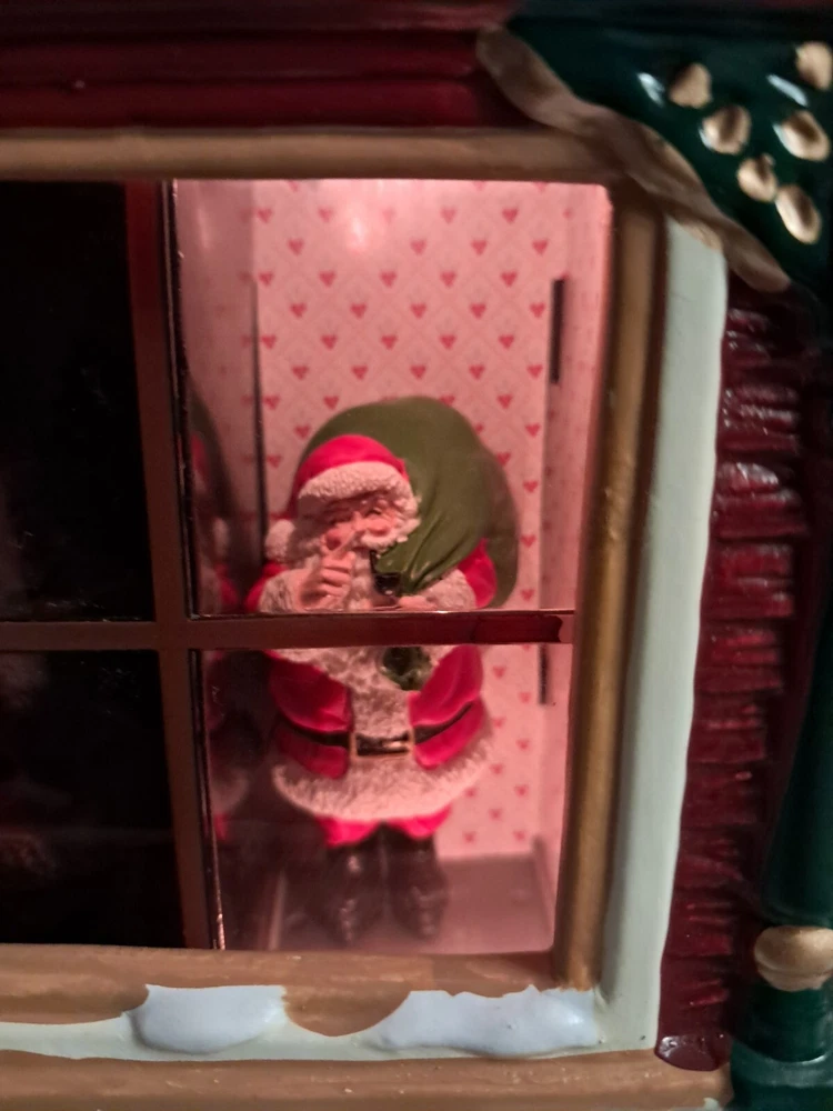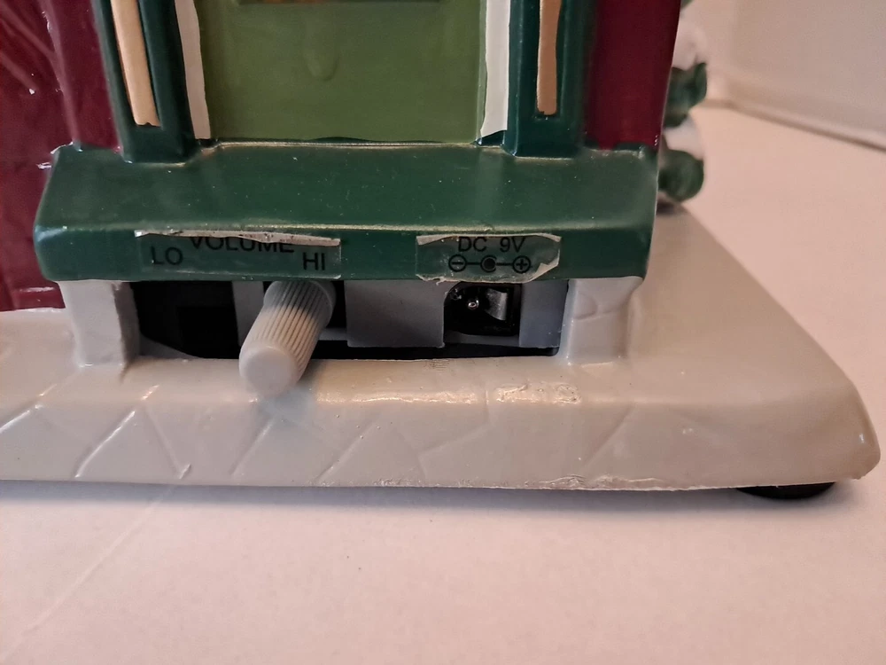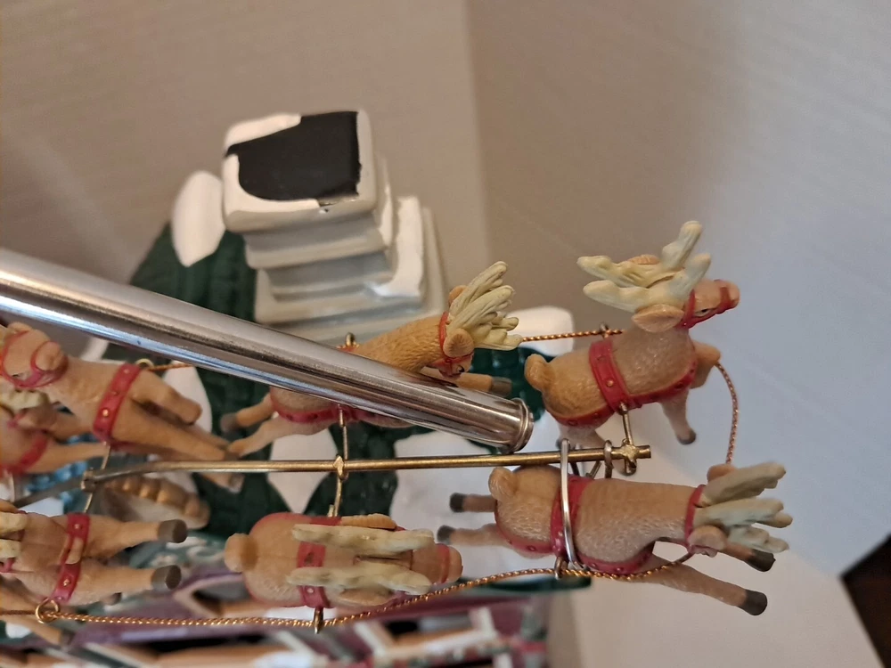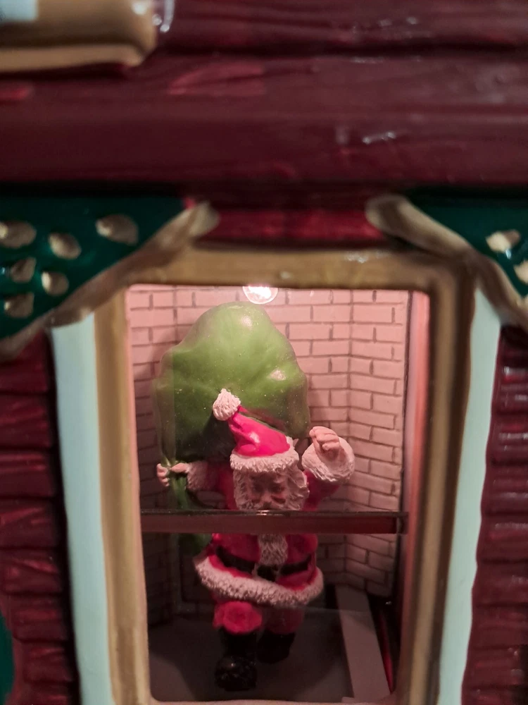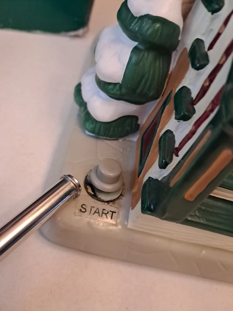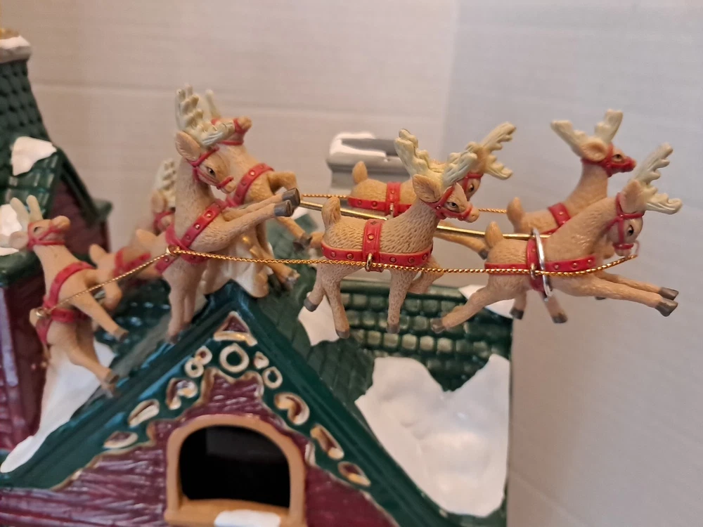 Mr. Christmas The Night Before Christmas Light Up Story-Telling House Works Smoke free pet free home No chips or cracks detected The lead reindeer was broken off the metal harness and I made a new harness for this one reindeer (see photos) The start button has some wear The story must play all the way through before restarting and takes about 15 seconds to start the story after pressing start button. Different windows light up corresponding to the story as it is being told. Box shows wear from storage