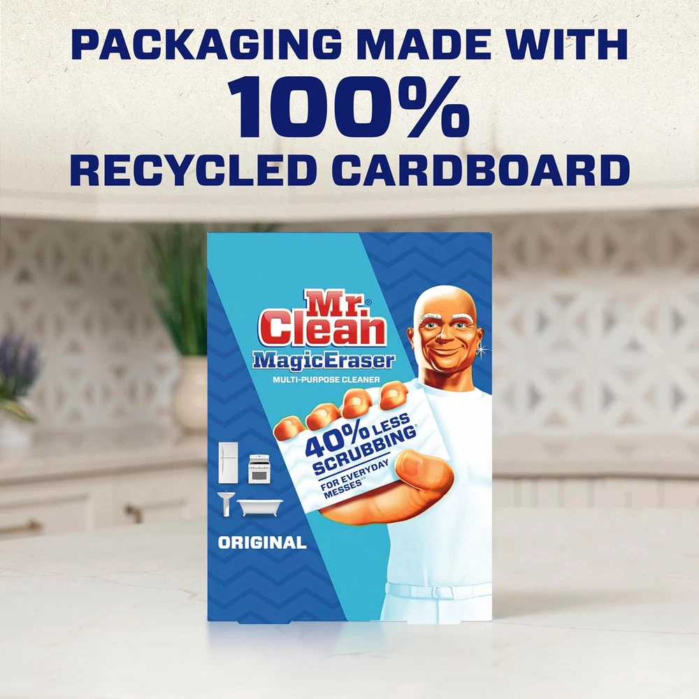 STRONGER CLEANING: Mr. Clean Magic Eraser is 3X stronger* for a superior clean *Cleaning performance vs. the leading all purpose bleach spray 2. VERSATILE USE: This all-purpose cleaner fights dirt all around the house. It works as a surface cleaner, wall cleaner, bathtub cleaner, oven door cleaner, and fights marks on light switches, doors & much more 3. POWERFUL CLEAN: The Mr. Clean Magic Eraser provides a powerful clean with water alone, no need for additional cleaning agents 4. VARIETY OF FORMS: Magic Erasers are also available in Ultra Thick, Ultra Foamy, Ultra Bath, and Extra durable forms, catering to a wide range of cleaning needs 5. SIMPLIFY CLEANING: With Mr. Clean Magic Eraser, you can say goodbye to the need for separate bathroom cleaner, shower cleaner, melamine sponge, all purpose cleaning spray, bathroom spray, brillo pads cleaning pads, bathtub cleaner, wall cleaner, oven cleaner, scrubbing powder, scrubbing cream, stovetop cleaner, glass-top cleaner Mr. Clean Magic Eraser Original scrubber is 2X Stronger* with DURAFOAM. Micro-scrubbers reach into the surface grooves, lifting away built up dirt and grime with water alone! Use it all around the house as a multi surface cleaner, wall cleaner, bathtub cleaner, oven door cleaner, or for erasing marks on light switches, doors and more! *Cleaning performance vs. the leading all-purpose bleach spray