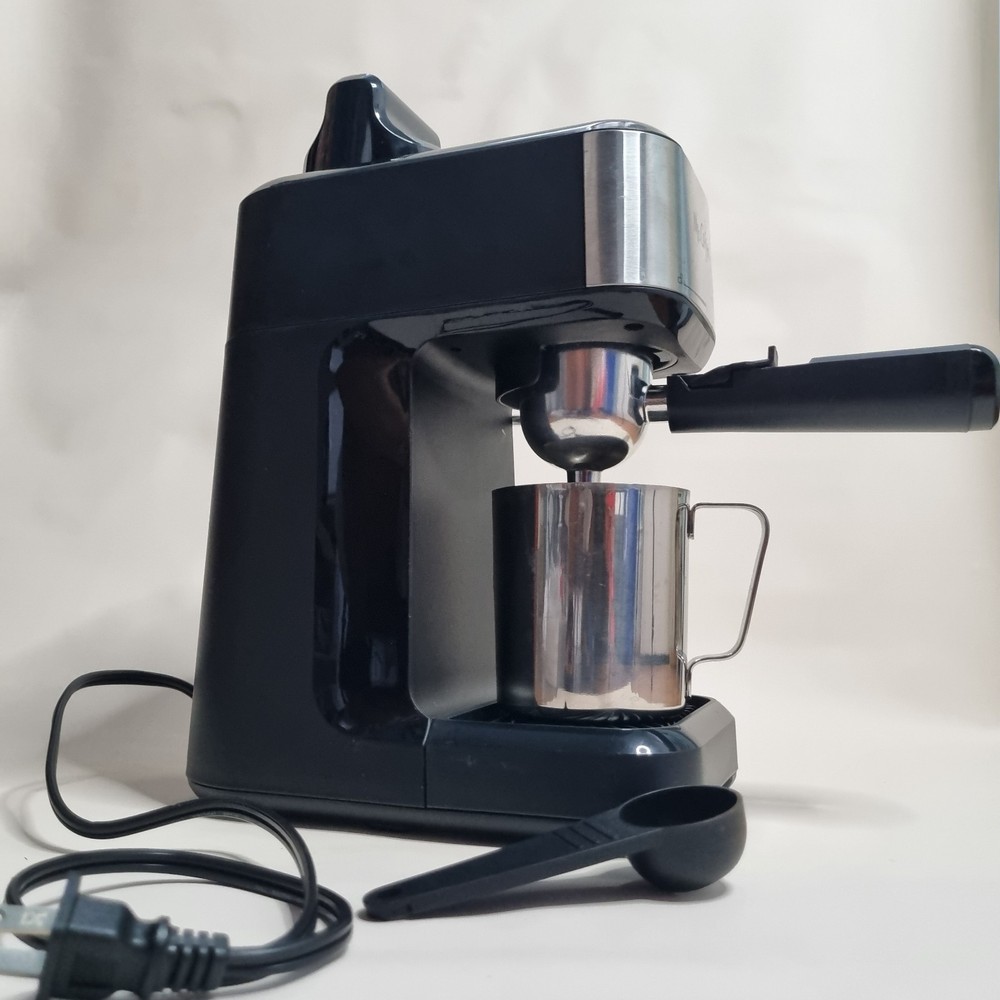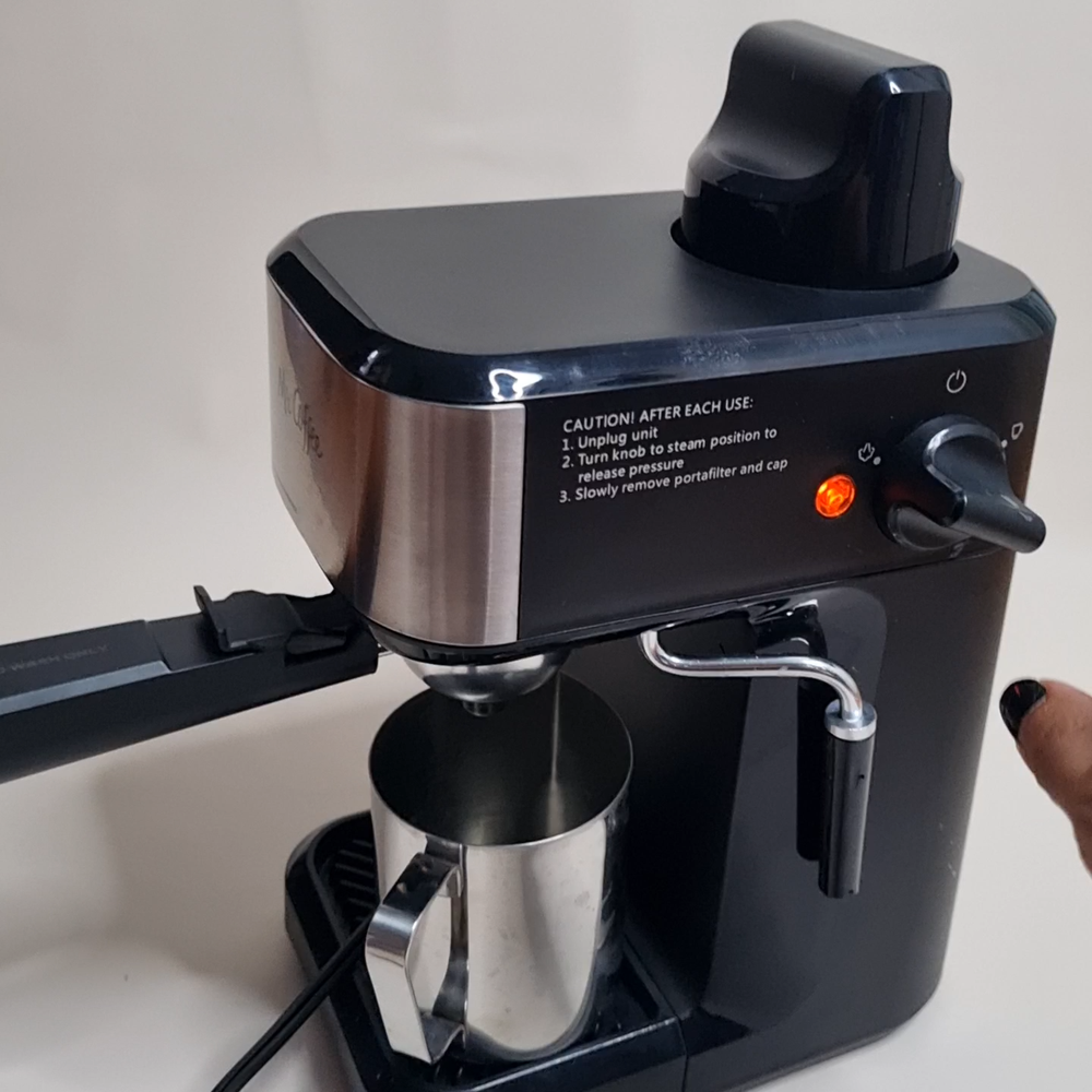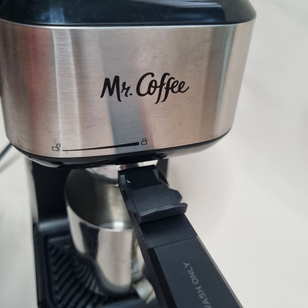 Mr. Coffee Espresso Machine Black & Stainless Steel with Milk Frother Wand Get your daily dose of delicious espresso, cappuccino, or latte with this Mr. Coffee Espresso Maker! This compact and stylish machine features a sleek black and stainless steel design that will look great in any kitchen. It comes equipped with a steam frothing wand, perfect for creating creamy milk for your favorite lattes and cappuccinos. The included portafilter and tamper (spoon with tamper end) make it easy to brew your espresso shots. Key Features: Versatile Brewing: Brews espresso, and with the integrated steam wand, you can easily froth milk for cappuccinos and lattes. Easy to Use: Simple controls for brewing and steaming. Steam Wand: Articulates for convenient milk frothing. Removable Drip Tray: For easy cleaning. Compact Design: Ideal for smaller kitchens or limited counter space. Included Accessories: Comes with a portafilter, a metal frothing pitcher, and a measuring scoop with a tamper end. Important Safety & Usage Information (From product labels): Warning (Water Reservoir Cap): To avoid injury, relieve pressure before removing the cap or portafilter. Use water only. Caution (After Each Use): Unplug unit. Turn knob to steam position to release pressure. Slowly remove portafilter and cap. Portafilter Handle: Hand wash only. What's Included: Mr. Coffee Espresso Machine Portafilter Stainless Steel Frothing Pitcher Measuring Scoop with Tamper Why Buy This Machine? This Mr. Coffee espresso maker is perfect for coffee enthusiasts who want to enjoy cafe-quality drinks at home without a hefty price tag. It's user-friendly and delivers satisfying results.