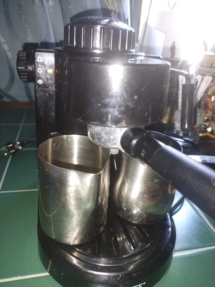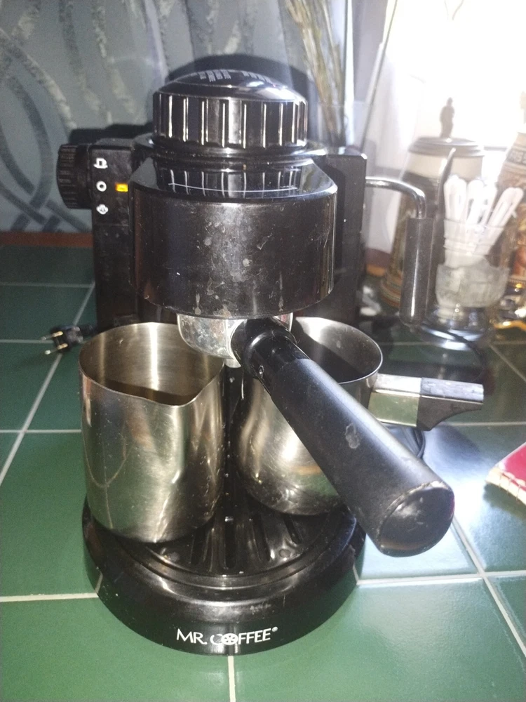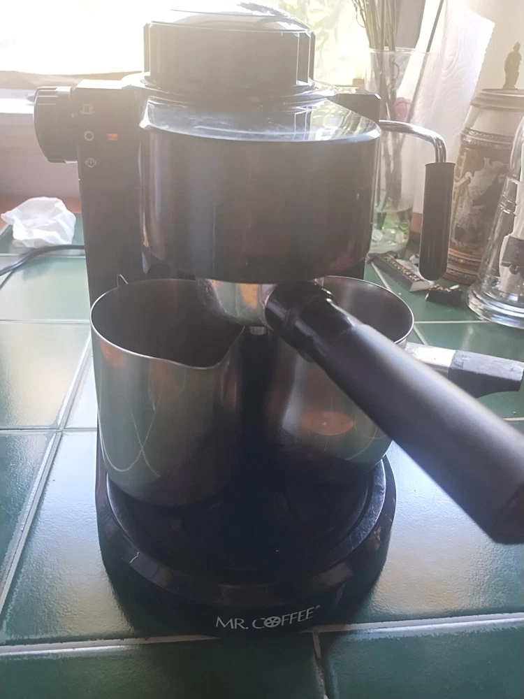 Get ready to enjoy café-style coffee at home with this Mr. Coffee Expresso and Cappuccino Coffee Maker. This machine comes in a sleek black color and is perfect for making cappuccino and espresso coffee. It has a removable drip tray, water tank, and frother to make your coffee-making experience easier and more convenient. With a capacity of 4 cups, you can make coffee for the whole family or a group of friends. This machine is easy to use and comes with a range of features that make it stand out from other coffee makers. It is a great addition to any kitchen and is perfect for coffee lovers who want to enjoy their favorite coffee at home anytime they want. handle of frothe jar broken it is still usable. there in free organic coffee from Mexico! best deal of the day!