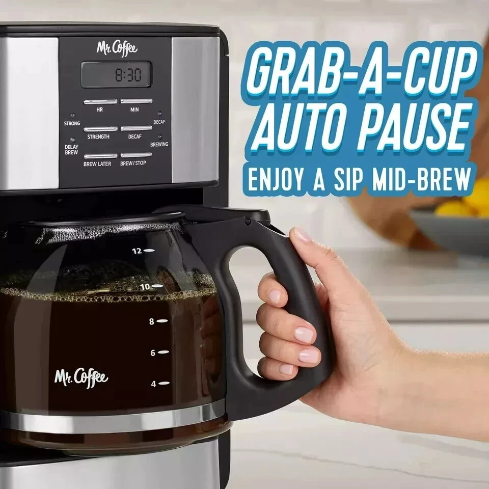 Mr. Coffee Programmable 3-Way Brewing System 12-Cup Drip Coffee Makers, New Product details Perfect for busy days, this sleek, stainless steel Mr. Coffee 12-Cup Programmable Coffee Maker features a flexible 3 Ways to Brew System that makes it easy to brew a delicious cup of coffee exactly how you like it. With the touch of a button, choose between Regular, Strong Brew, and Decaf, and enjoy your coffee in minutes! Just add your coffee, use the Water Window to check the water levels, and you’re good to go! The Delay Brew setting makes it easy to schedule brewing ahead of time, so you can wake up to a fresh cup. Want your coffee right away? Grab-a-Cup Auto Pause lets you get a cup before the brewing cycle is over. The convenient 4-Hour Auto-Shutoff function automatically turns off the coffee maker, so you don’t have to. Whether you’re brewing coffee for yourself or for a crowd, this feature-packed coffee machine is a great addition to your kitchen coffee station. Mr. Coffee Programmable 3-Way Brewing System 12-Cup Drip Coffee Makers Brew Selector: Choose between Regular, Strong Brew, or Decaf coffee at the touch of a button for a personalized brewing experience Lift & Clean Filter Basket: The filter basket lifts out for fast and easy cleanup Water Window: The easy-view Water Window allows you to see the water level to prevent overflow Auto-Pause: Grab-a-Cup Auto Pause stops the brewing cycle, allowing you to pour a cup before brewing is finished Auto-Shutoff: The 4-Hour Auto-Shutoff feature automatically turns off the coffee maker for added safety Specifications Features: Automatic Shut-Off, Programmable, Temperature Control, Water Level Indicator Brand: Mr. Coffee Assembled Product Dimensions (L x W x H): 9.30 x 11.10 x 14.60 Inches