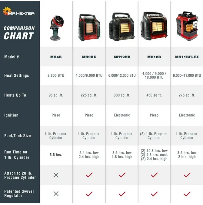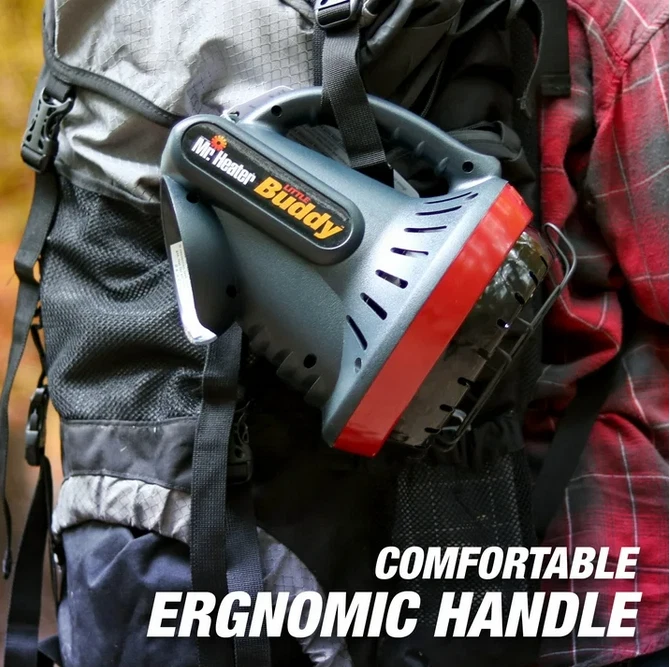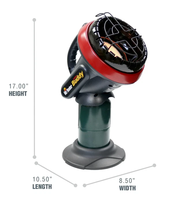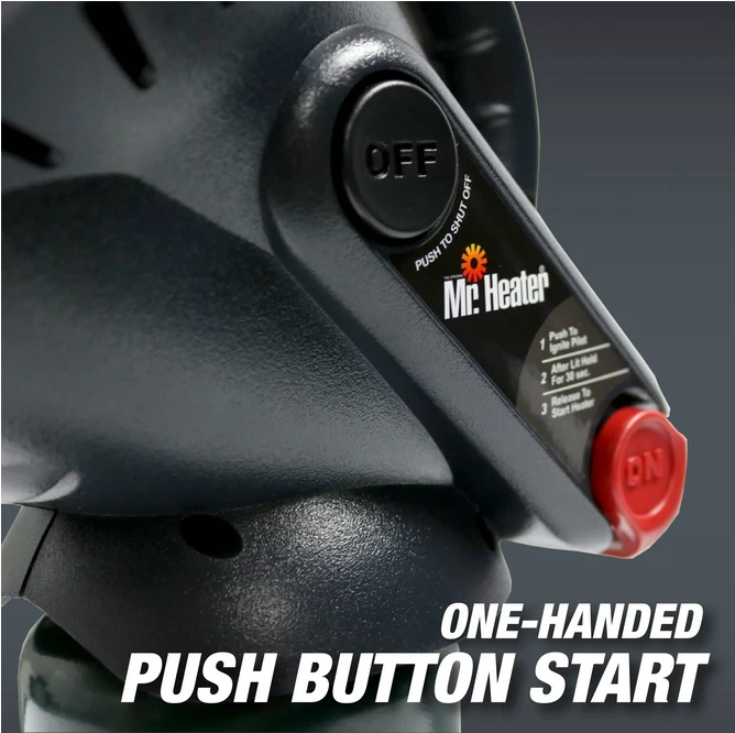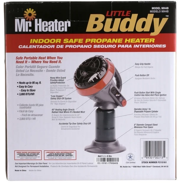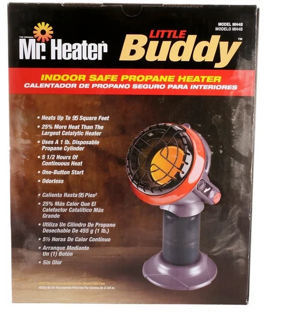 About this item Product details North America's most popular portable propane heater by Mr. Heater. This patented radiant 3,800 BTU Liquid Propane heater connects directly to a 1 lb cylinder and is the perfect solution for heating small enclosed spaces like tents up to 100 sq ft. The included base takes up little space and the integrated handle makes this heater an easy one to transport. To light the unit, simply push and hold the ignition button and the integrated piezo sparking mechanism will take care of the rest. With the Oxygen Depletion Sensor and accidental tip over safety shut off, you can be sure that you will enjoy years of comfortable indoor safe heat. New. Radiant propane heater in a portable, indoor safe design 3,800 BTUs heats up to 95 square feet by Mr. Heater Tip over safety shut off switch and low oxygen safety shut off sensor Runs 5.6 hours on standard 1 lb propane cylinder Specifications Brand Mr. Heater Power Type Gas Recommended Location Indoor BTU 3800