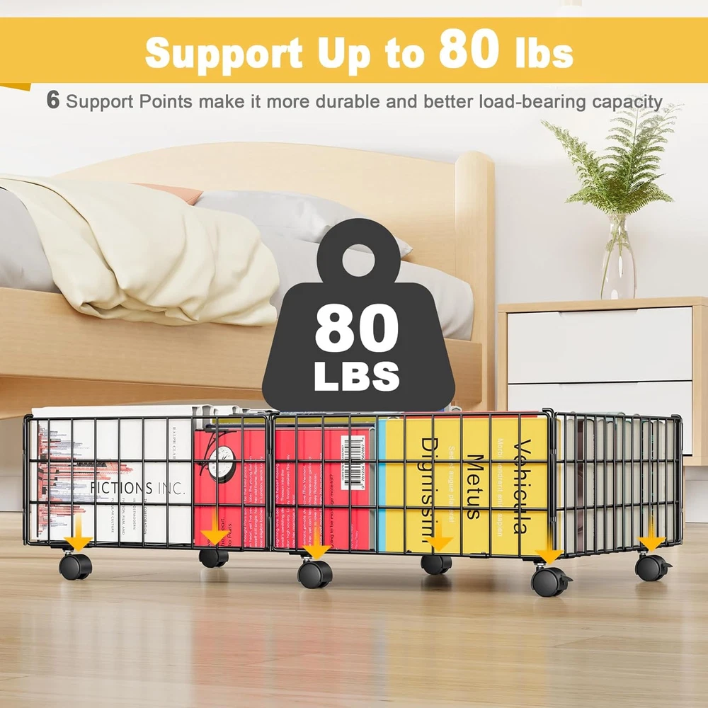 Mr IRONSTONE Large Under Bed Storage Containers with 6 Wheels, Upgraded Metal Under Bed Shoe Storage Holds Up to 80LBS, Rolling Under Bed Drawers Organizer for Clothes Toys Books Blanket, 2 Pack Product Details Unit Count: 2.0 Count Capacity: 80 Pounds Manufacturer: Mr IRONSTONE Part Number: SN03-053 Item Weight: 10.96 pounds Product Dimensions: 25.39 x 16.73 x 8.66 inches Item model number: SN03-053 Finish: Coated Pattern: Solid Shape: Rectangular Item Package Quantity: 1 Number Of Pieces: 1 Mounting Type: Floor Standing Special Features: Sturdy Batteries Included?: No Batteries Required?: No Material: Iron, Polypropylene (PP), Metal Product Dimensions: 25.4"L x 16.7"W x 8.7"H Item Weight: 4.98 Kilograms Brand: Mr IRONSTONE Finish Type: Coated 【Heavy Duty Metal Material】Compared with traditional textile storage box,Mr IRONSTONE under bed storage with wheels made of high quality metal frame is thicker than other storage cart, which makes the whole underbed storage more sturdy and offers a larger load-bearing capacity (up to 80lbs). And the surface is coated with high-quality materials, not easy to rust. 【Upgraded Design with 6 Rolling Wheels】Under the bed storage equipped with 6 x 360°rotated wheels can easily slide smoothly on the floor or carpet when in use. 2 of the wheels can be locked, when you need it to stay still, you just need to press the locking mechanism lightly. Elevated wheel design protect your stored items from dust and moisture. 【Larger Size & Capacity】Under bed shoe storage organizer dimensions: 25.4"(L) x 16.7"(W) x 8.7"(H), 8.7" height with wheels is designed for most underbed space, more space saving, making your tiny space a new look! The package includes 2 underbed storage with wheels, perfect for bedroom, living room, sofa, desk and other places to use. 【Tool-Free & Easy Assembly】We have simplified the under bed storage containers installation steps, and no tools are required. Just expand the frame and use the pins connect it together, and then install the 6 wheels into the frame. 【Clear Visual Design】The underbed drawers containers is composed of a firm visual metal grid. Unique structure of the under bed storage bins allows quickly identity the inside contents even under the bed, easily access to what you need.The whole under bed storage cart can be used to store shoes, clothes, toys, books, blanket, etc.