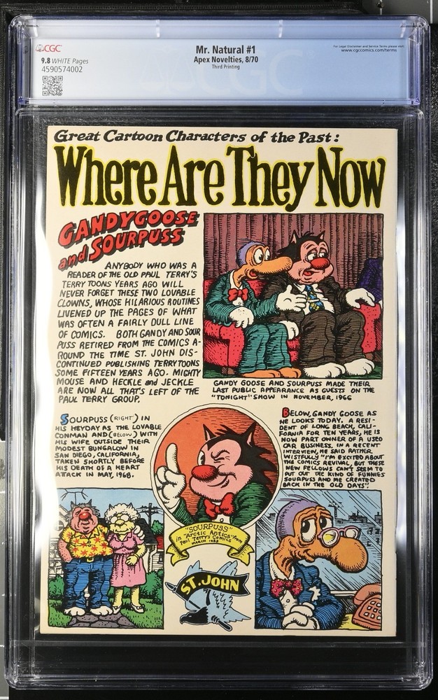 Mr. Natural #1 CGC 9.8, Origin of Mr. Natural, Apex Novelties, White Pages Robert Crumb Story, Cover and Art Collector's item! only 1 copy of this exist in this grade. Pages: 28 Published: August 1970 Publisher: San Francisco Comic Book Company Artist: Robert Crumb Origin of: Mr. Natural Third Print, Have any Questions? Click the Ask a question link at the top of the listing. PAYMENT : We accept eBay Payments. must be received within 3 days from the auction end date to receive your comic fast as possible. Shipping in the (USA): Media Mail Tracked and Insured. RETURNS : Buyer may return the item within 14 days. Items MUST be returned in the same condition and must be packaged as it was received then You will receive a refund for the full amount "Excluding Shipping fees". when it arrives and is checked. Your/Our FEEDBACK - Each buyer will receive positive feedback at the end of every successful Transaction, and we would appreciate feedback in return! Thank You! for looking Feel free to check out our other comics for sale and we will be adding many more in the future Thank you for reading this long Description!