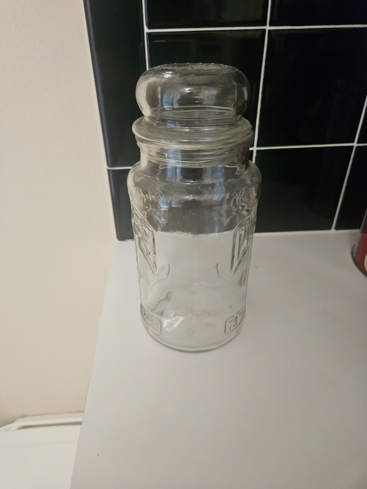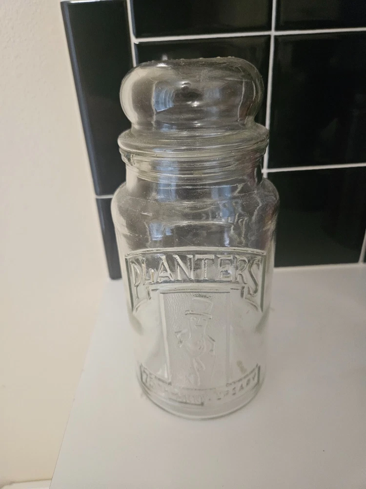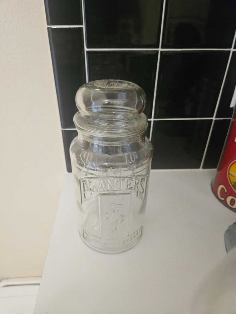 Crafted in the United States during the iconic 1980s, this Mr. Peanut Planters Peanuts glass jar stands at an impressive 10 inches tall, complete with its original lid. A treasured piece of advertising memorabilia, it hails from a bygone era when glass jars were a staple for storing and showcasing peanuts and other confections. The jar's clarity allows for a view of its contents, making it an appealing display item for both collectors and enthusiasts of vintage candy and nuts. It features the classic Mr. Peanut character, synonymous with the Planters Nuts brand, and is a testament to the originality and quality of the time, with no modifications to detract from its nostalgic value.