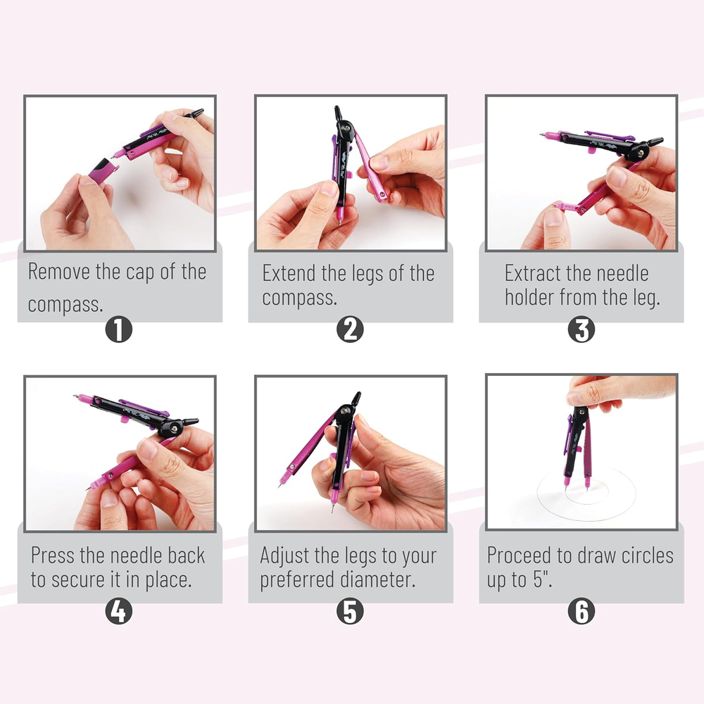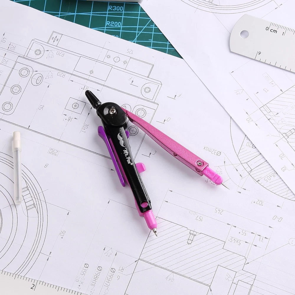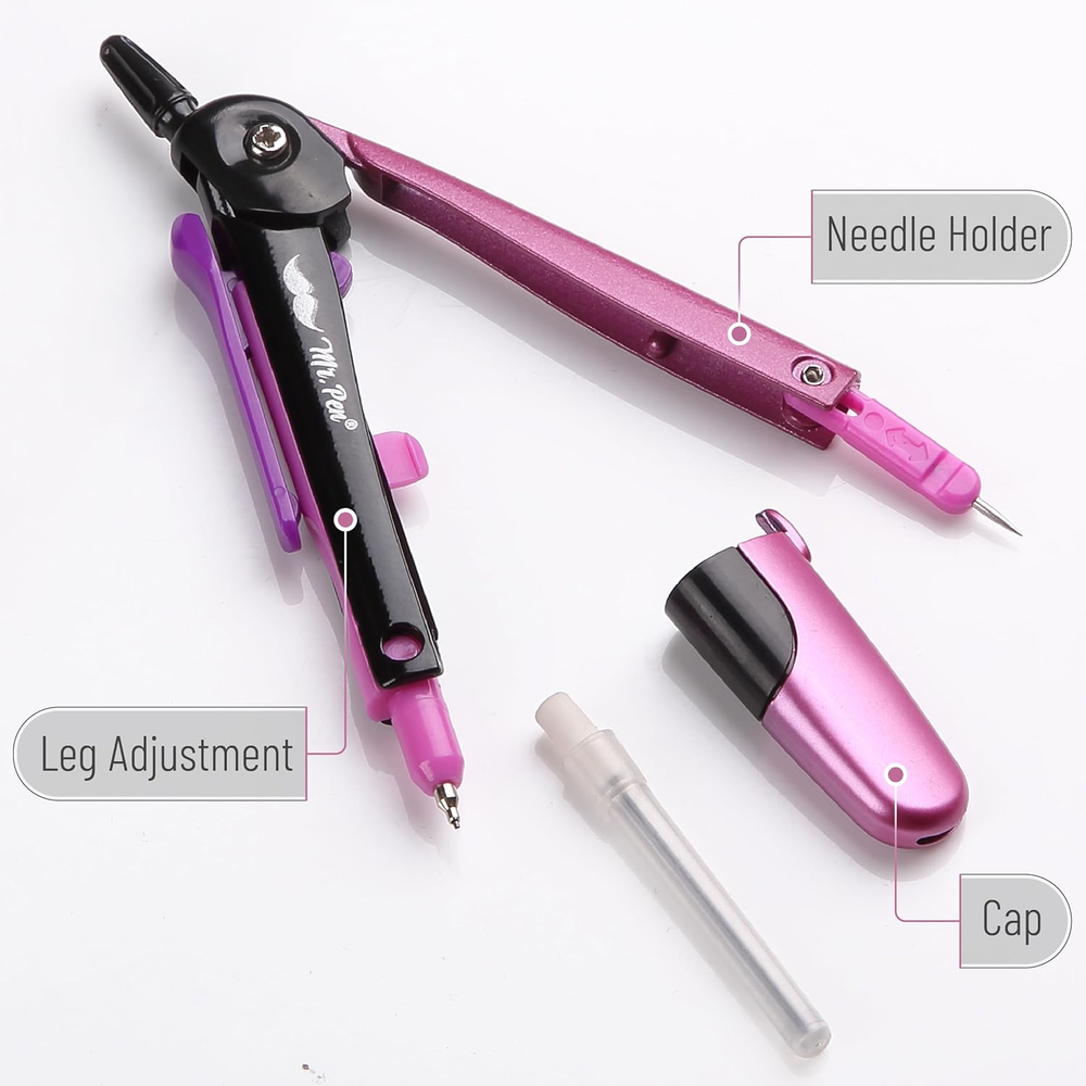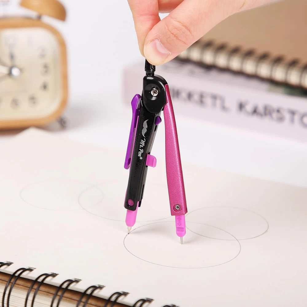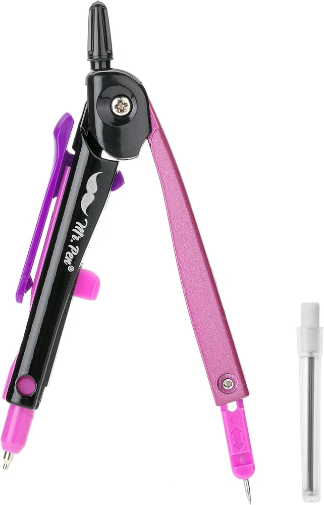 Mr. Pen compass is engineered for accuracy and ease, featuring a sleek design that allows for precise radius settings and smooth adjustments. Perfect for geometry, drafting, and art, this compass is capable of drawing circles and arcs with ease and precision. Built with a robust metallic frame and a vibrant, eye-catching pink finish, this compass withstands the rigors of classroom and professional use. The pen-style grip provides a familiar feel, making it easy to control for both students and professionals, while the center wheel offers fine adjustments. This compass set includes a spare lead tube, ensuring that you're always prepared for any project without the need for immediate refills. Mr. Pen compass is engineered for accuracy and ease, featuring a sleek design that allows for precise radius settings and smooth adjustments. Perfect for geometry, drafting, and art, this compass is capable of drawing circles and arcs with ease and precision. Built with a robust metallic frame and a vibrant, eye-catching pink finish, this compass withstands the rigors of classroom and professional use. The pen-style grip provides a familiar feel, making it easy to control for both students and professionals, while the center wheel offers fine adjustments. This compass set includes a spare lead tube, ensuring that you're always prepared for any project without the need for immediate refills.