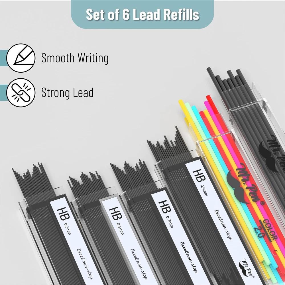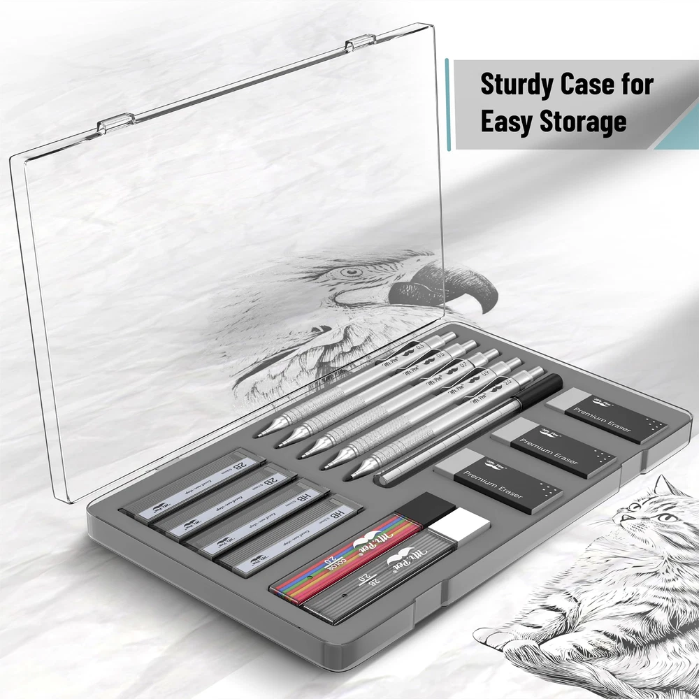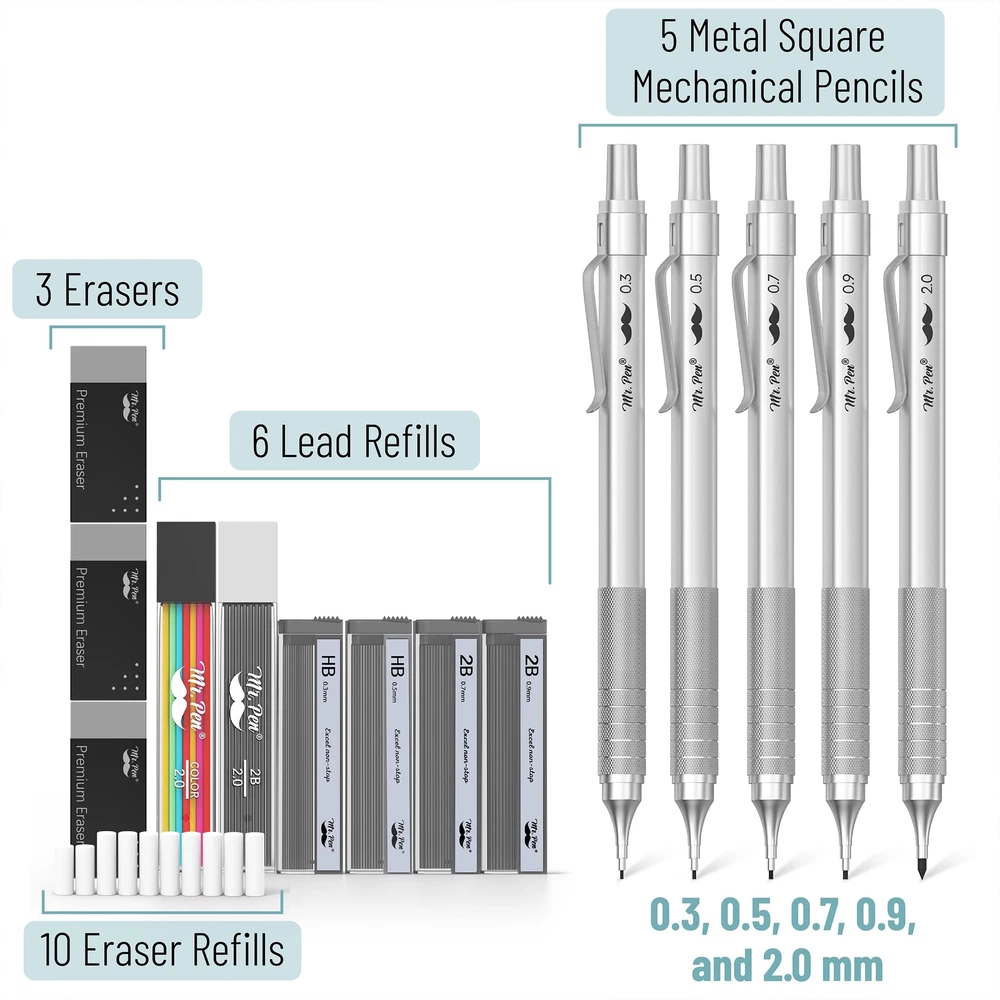 Mr. Pen mechanical pencil set is a complete sketching and drafting kit that includes five mechanical pencils with different lead sizes: 0.3, 0.5, 0.7, 0.9, and 2mm, catering to a wide range of drawing and writing needs. Accompanying the pencils are 6 tubes of lead refills, ensuring long-lasting use. The leads are graded HB and 2B, allowing for a variety of line weights and shades in your work. Each mechanical pencil is crafted with a square barrel and a knurled metal grip for superior control and precision, making them ideal for detailed work in drafting, technical drawing, or general writing. The set comes with 3 high-quality erasers for clean corrections, along with 10 eraser refills, ensuring that your work remains neat and professional-looking over time. All items are neatly organized in a sturdy, compact case, keeping your drafting tools secure and easily accessible, perfect for on-the-go artists, architects, and students. Mr. Pen mechanical pencil set is a complete sketching and drafting kit that includes five mechanical pencils with different lead sizes: 0.3, 0.5, 0.7, 0.9, and 2mm, catering to a wide range of drawing and writing needs. Accompanying the pencils are 6 tubes of lead refills, ensuring long-lasting use. The leads are graded HB and 2B, allowing for a variety of line weights and shades in your work. Each mechanical pencil is crafted with a square barrel and a knurled metal grip for superior control and precision, making them ideal for detailed work in drafting, technical drawing, or general writing. The set comes with 3 high-quality erasers for clean corrections, along with 10 eraser refills, ensuring that your work remains neat and professional-looking over time. All items are neatly organized in a sturdy, compact case, keeping your drafting tools secure and easily accessible, perfect for on-the-go artists, architects, and students.