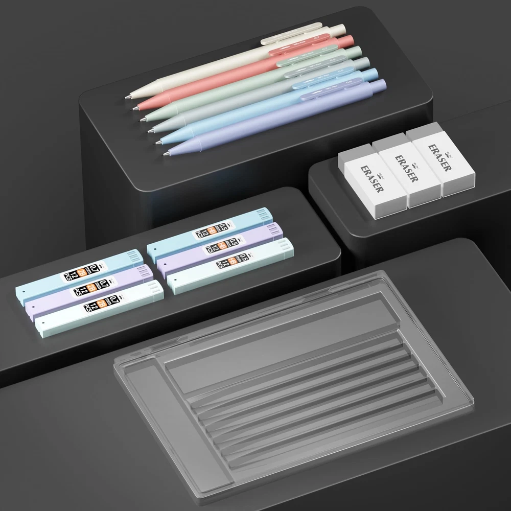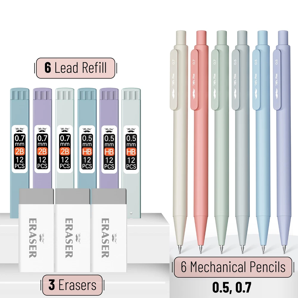 Mr. Pen mechanical pencil set offers a versatile writing experience with three 0.5mm and three 0.7mm pencils, suitable for both fine and broad strokes. These meticulously crafted mechanical pencils provide consistent lead advancement and a smooth writing experience, ensuring precision in every stroke. Accompanying the pencils are 6 lead refills, ensuring you're well-stocked and reducing the need for frequent replacements. Included in the set are 3 standard erasers, designed to effortlessly lift graphite off paper without causing damage. Packaged in a sleek, transparent case, this set is both easy to store and perfect for gifting to students, artists, and professionals. Mr. Pen mechanical pencil set offers a versatile writing experience with three 0.5mm and three 0.7mm pencils, suitable for both fine and broad strokes. These meticulously crafted mechanical pencils provide consistent lead advancement and a smooth writing experience, ensuring precision in every stroke. Accompanying the pencils are 6 lead refills, ensuring you're well-stocked and reducing the need for frequent replacements. Included in the set are 3 standard erasers, designed to effortlessly lift graphite off paper without causing damage. Packaged in a sleek, transparent case, this set is both easy to store and perfect for gifting to students, artists, and professionals.